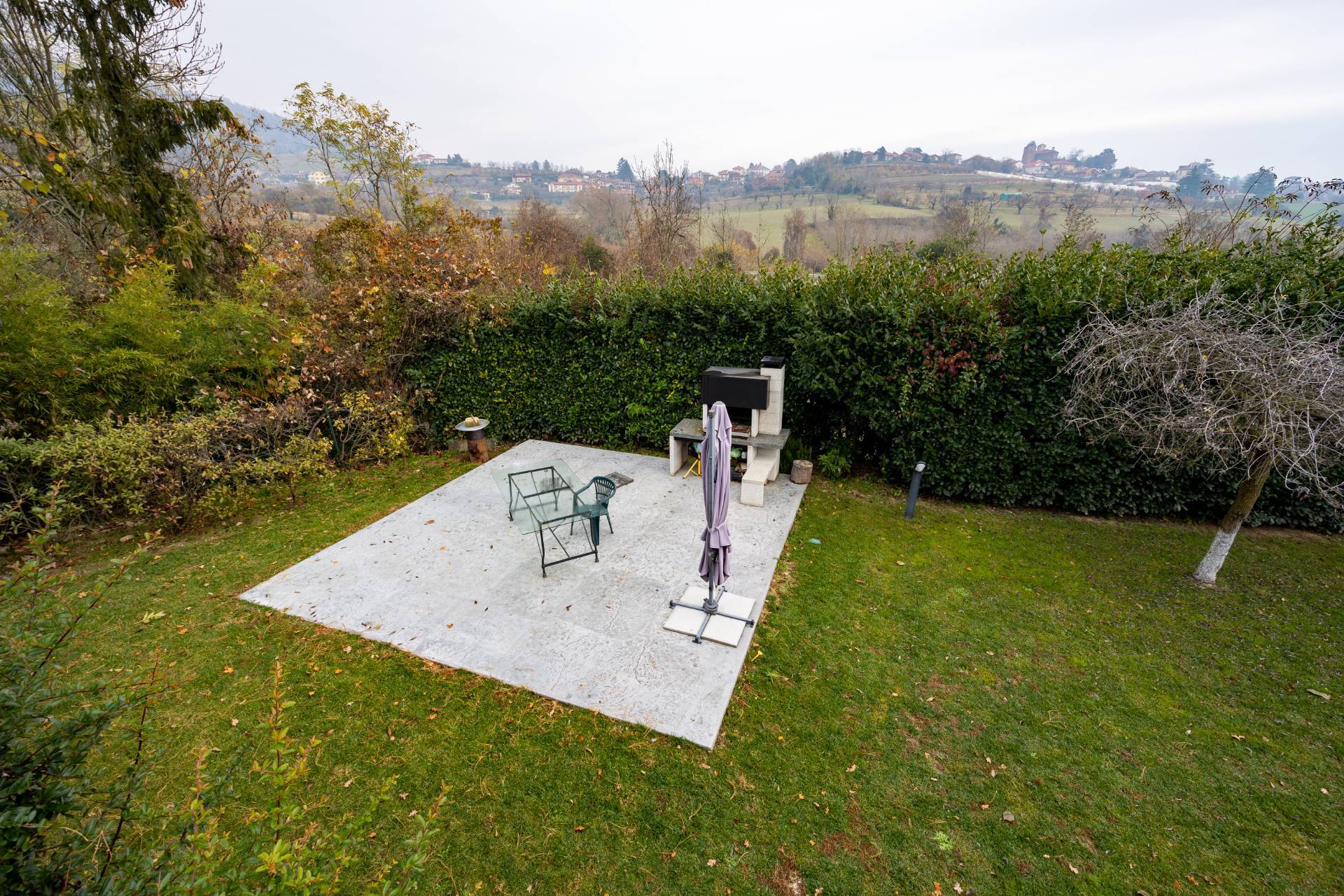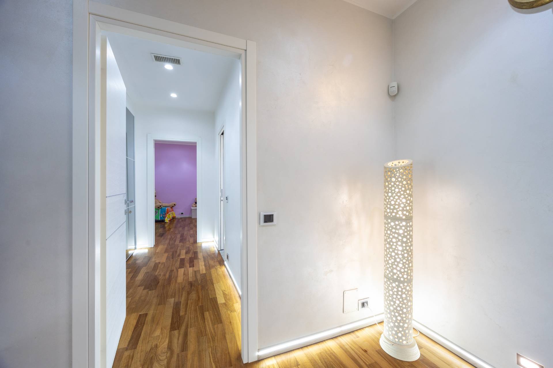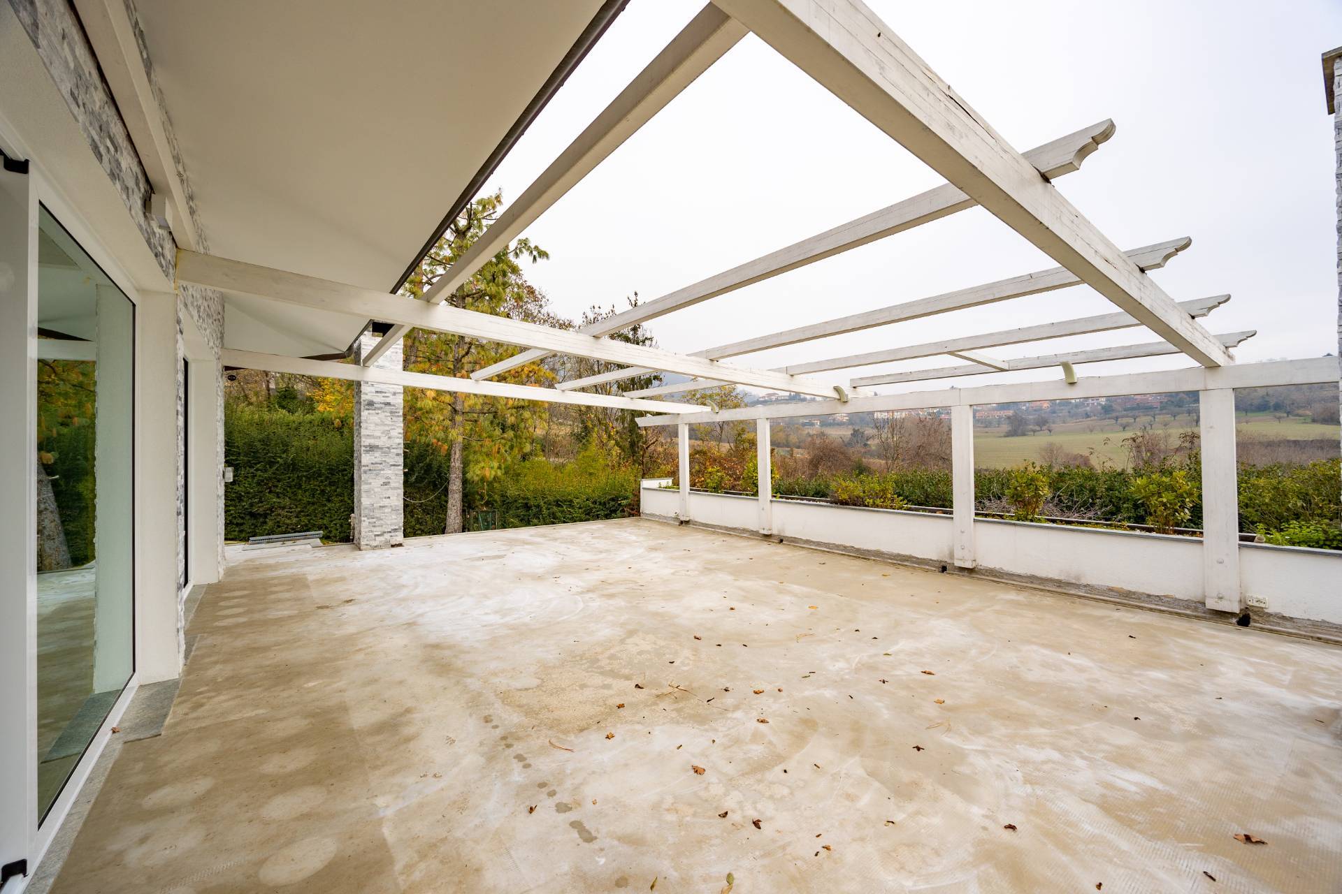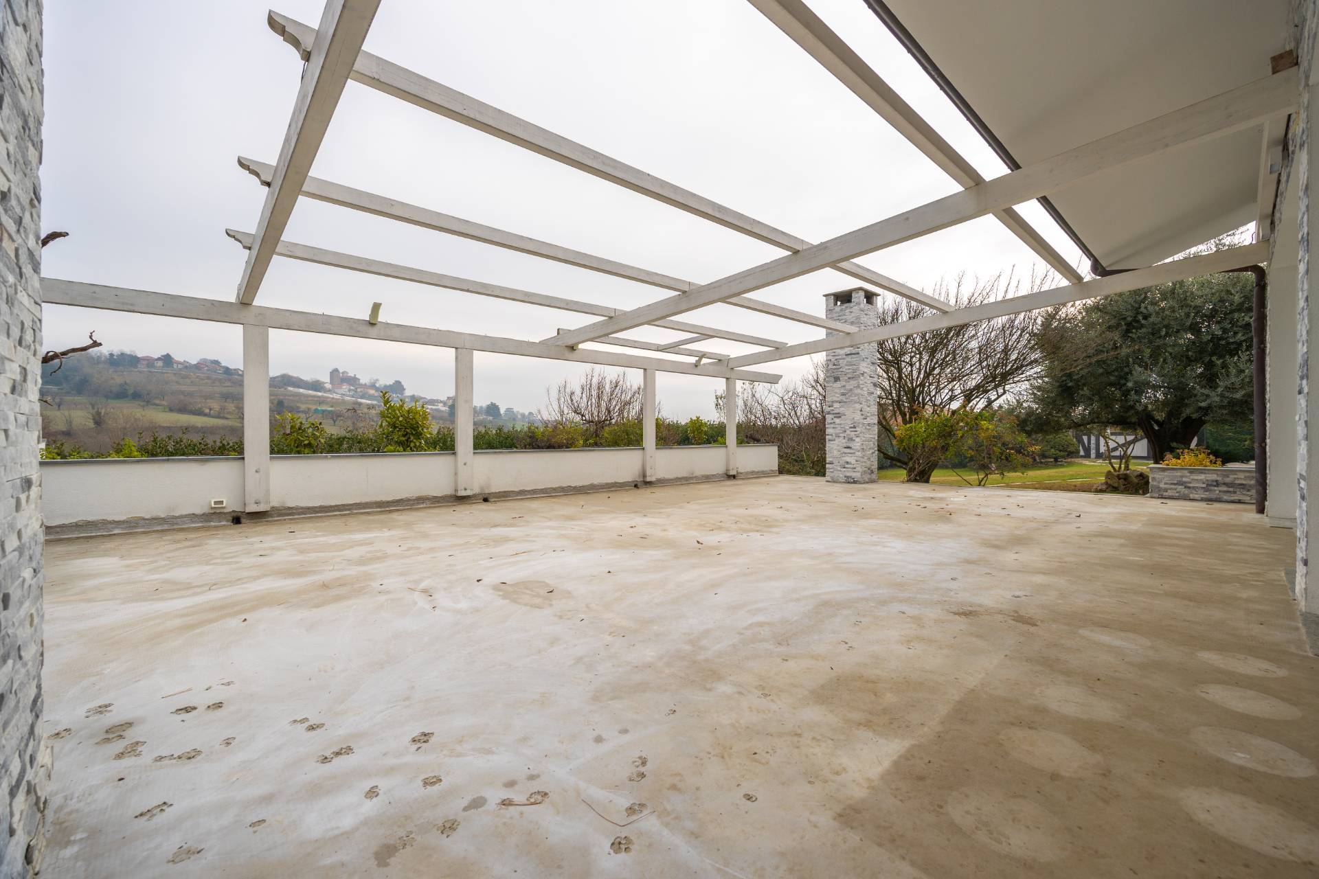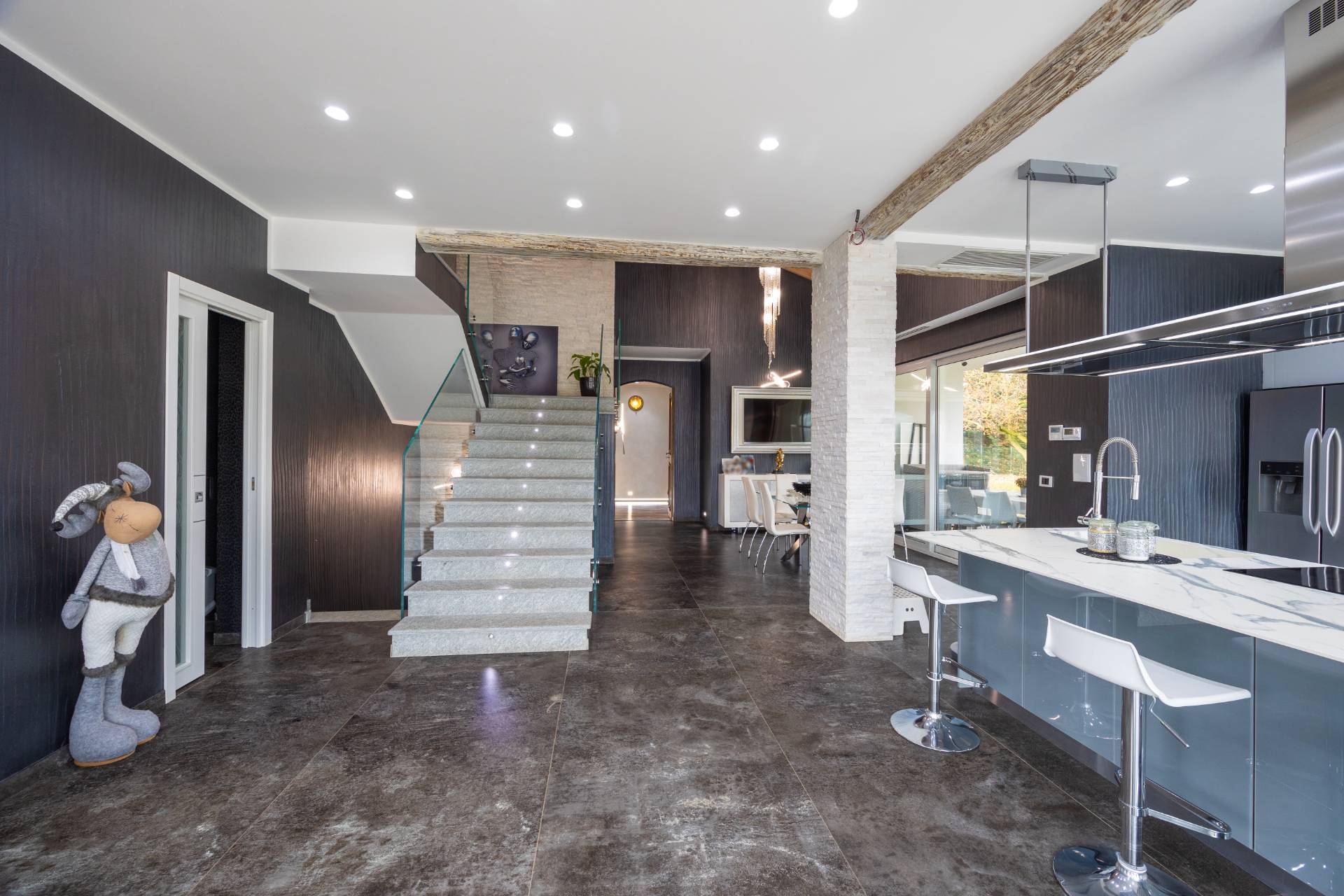 In the historic hilltop Village of Revigliasco, this detached Villa is spread over three levels. The first floor comprises an entrance hall, a spacious living room with a raised study, a kitchen with access to the terrace, a guest bathroom, a sleeping area with a hallway, two bedrooms, and two bathrooms. The second floor is entirely dedicated to the spacious master bedroom with double walk-in closets and an open-plan bathroom. The lower ground floor, which is not a basement, features a spacious living room with kitchen, laundry room, gym area, bathroom, and wine cellar.