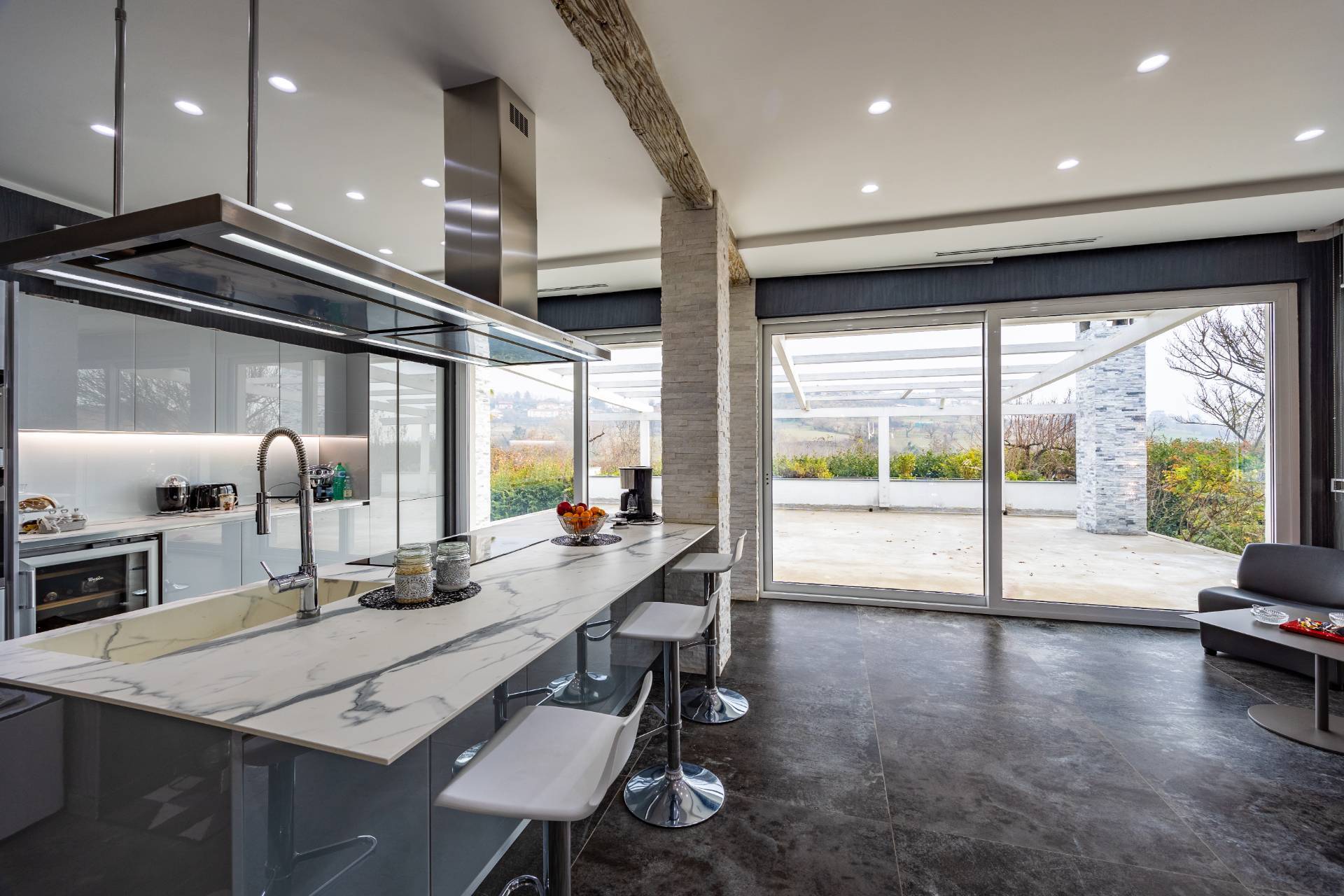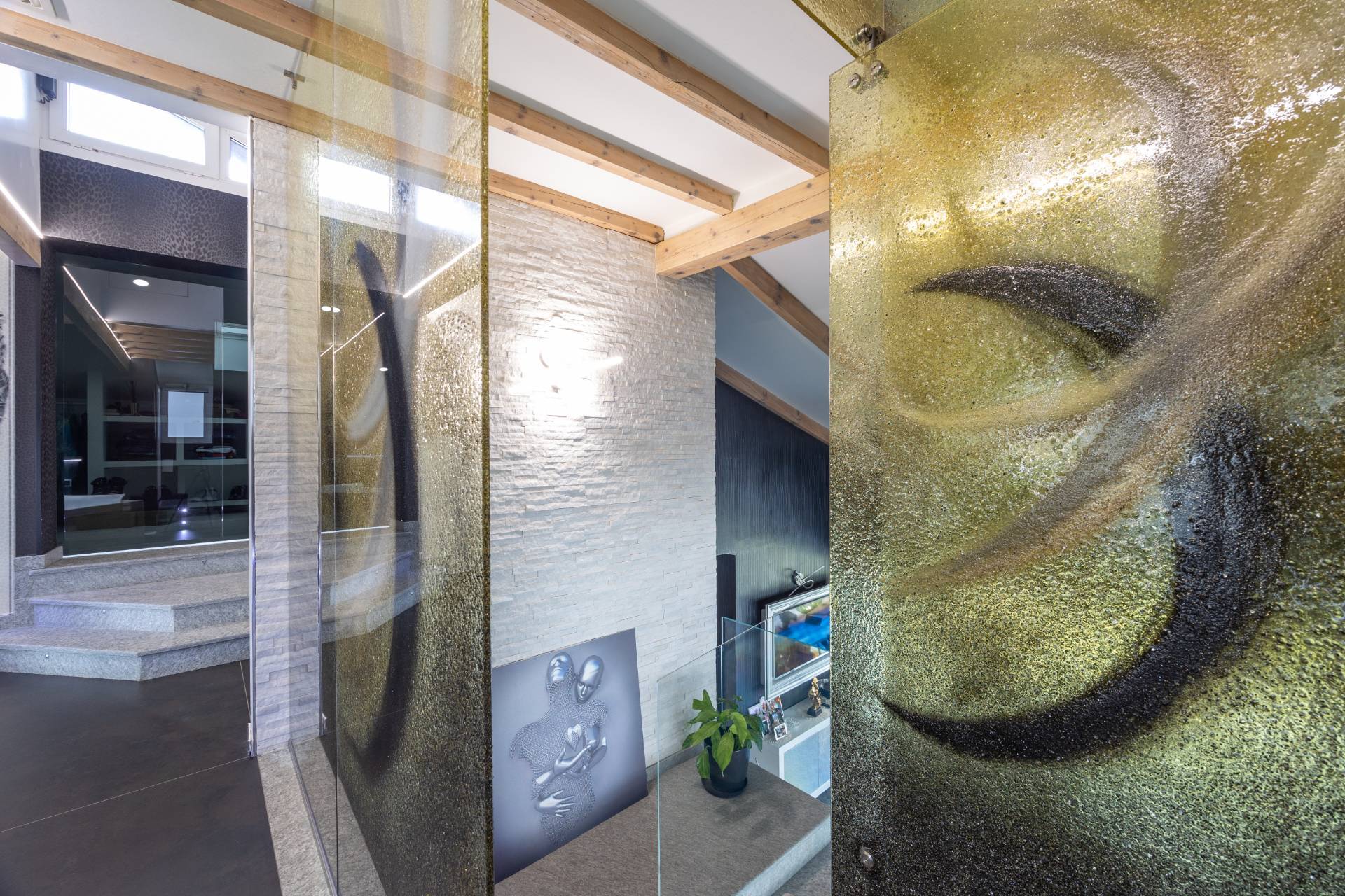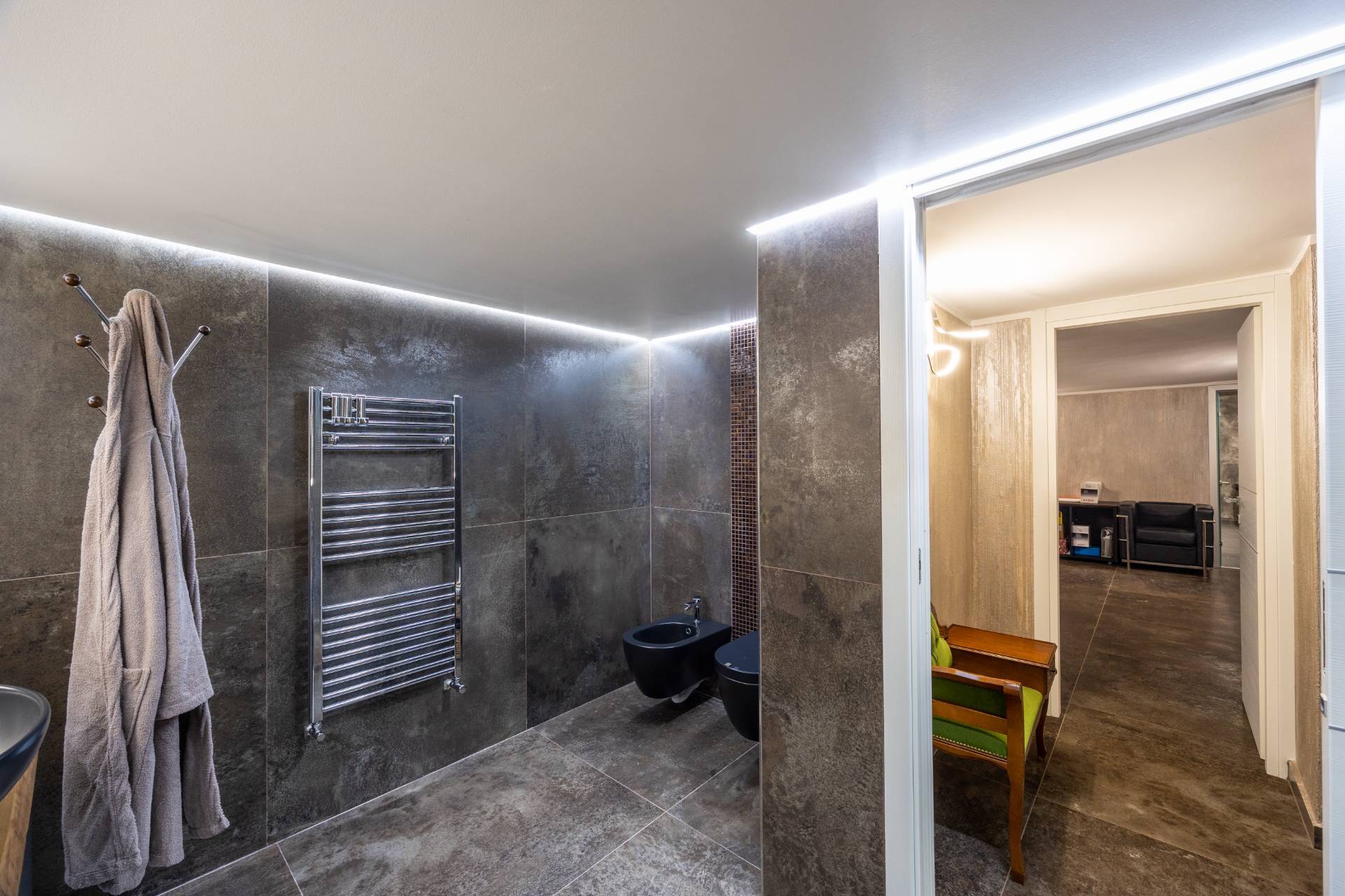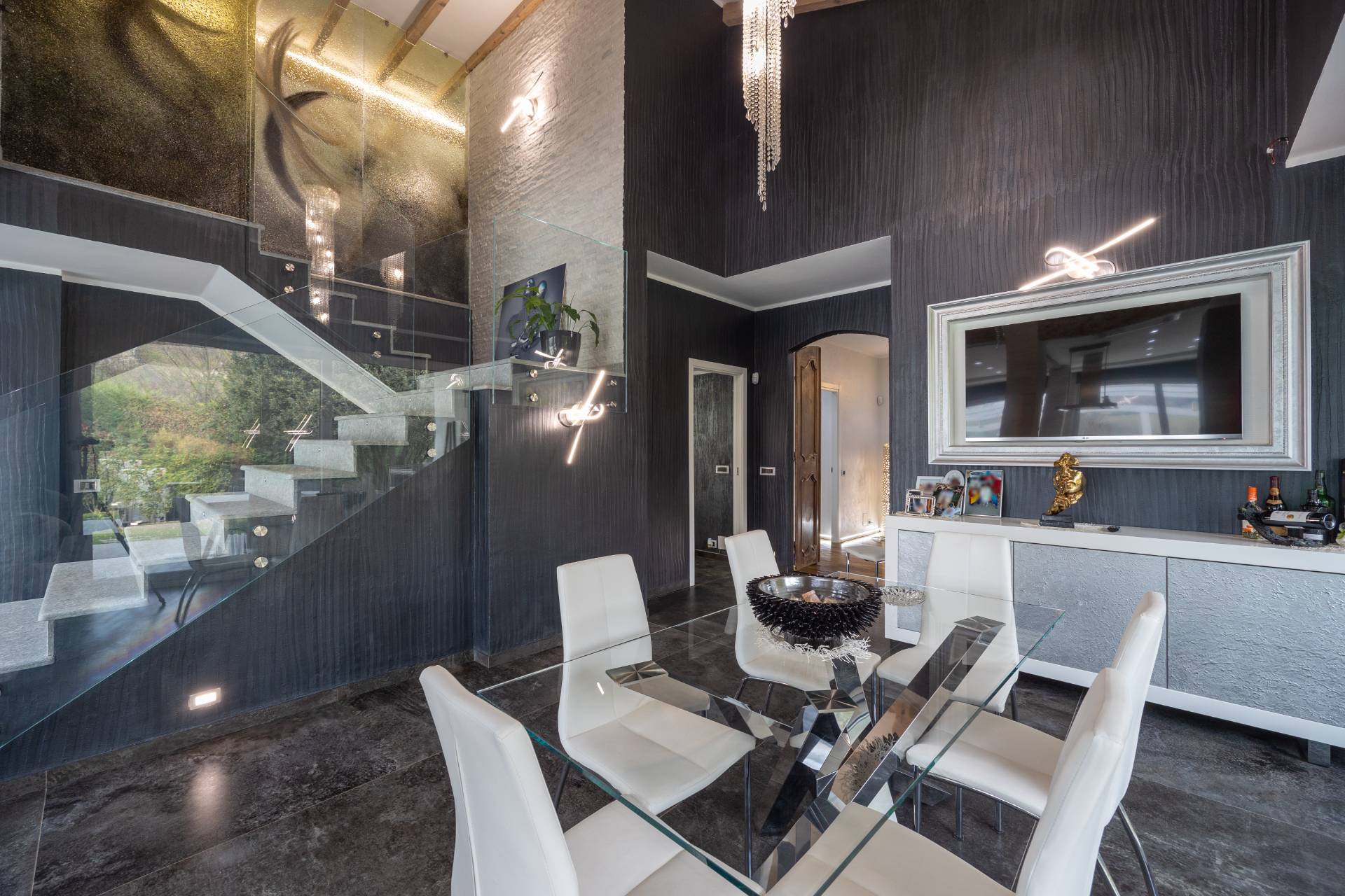 In the historic hilltop Village of Revigliasco, this detached Villa is spread over three levels. The first floor comprises an entrance hall, a spacious living room with a raised study, a kitchen with access to the terrace, a guest bathroom, a sleeping area with a hallway, two bedrooms, and two bathrooms. The second floor is entirely dedicated to the spacious master bedroom with double walk-in closets and an open-plan bathroom. The lower ground floor, which is not a basement, features a spacious living room with kitchen, laundry room, gym area, bathroom, and wine cellar.