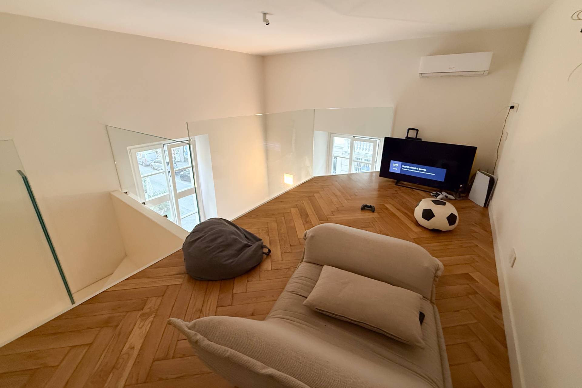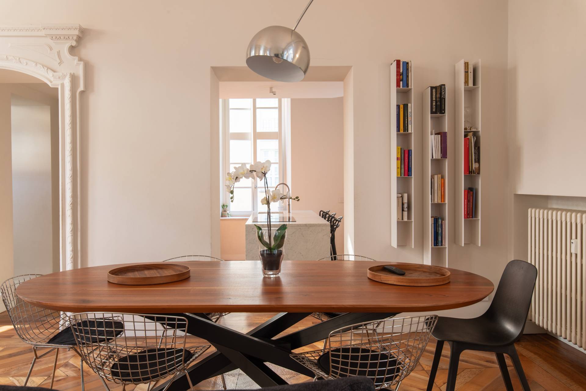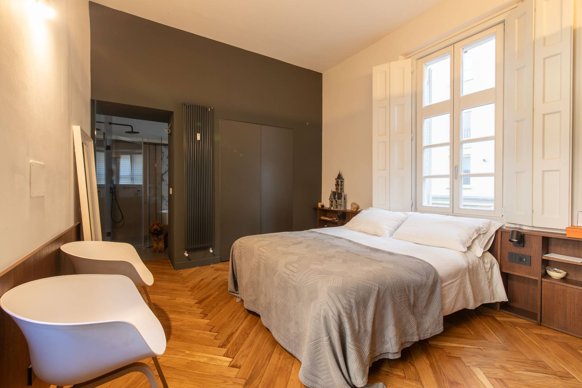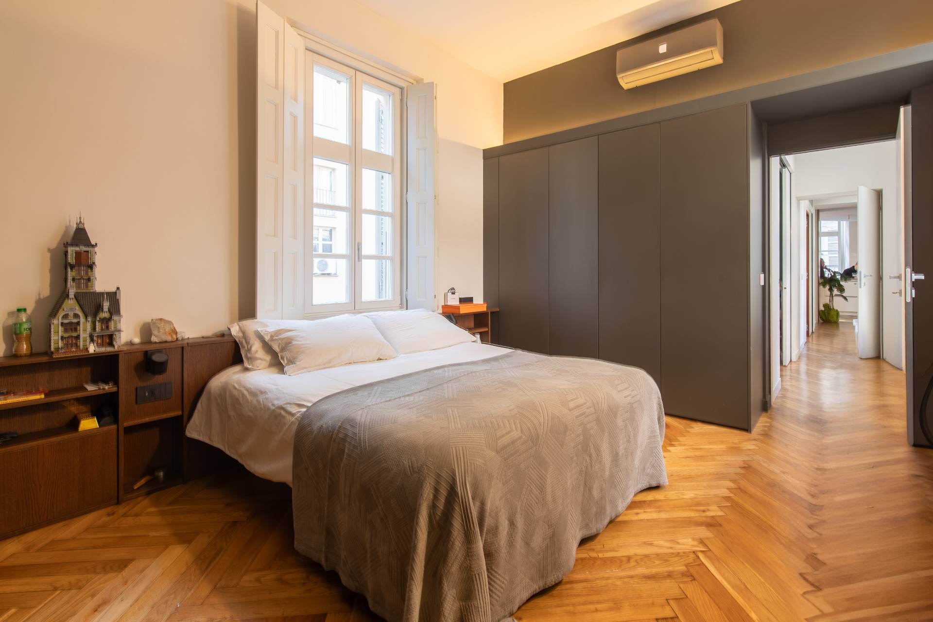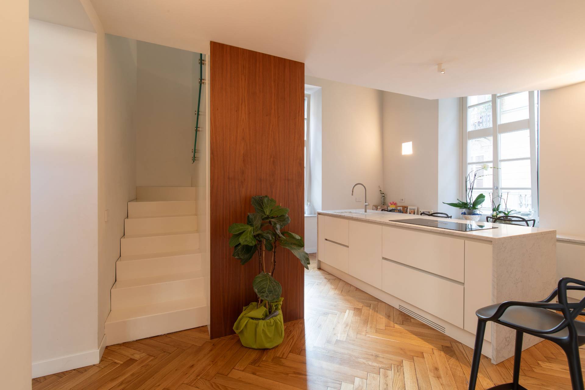 The property, which has been completely renovated, combines its original architectural value with a sophisticated contemporary feel: high ceilings with decorative stucco, geometric parquet flooring, and large windows that provide natural light throughout the day.