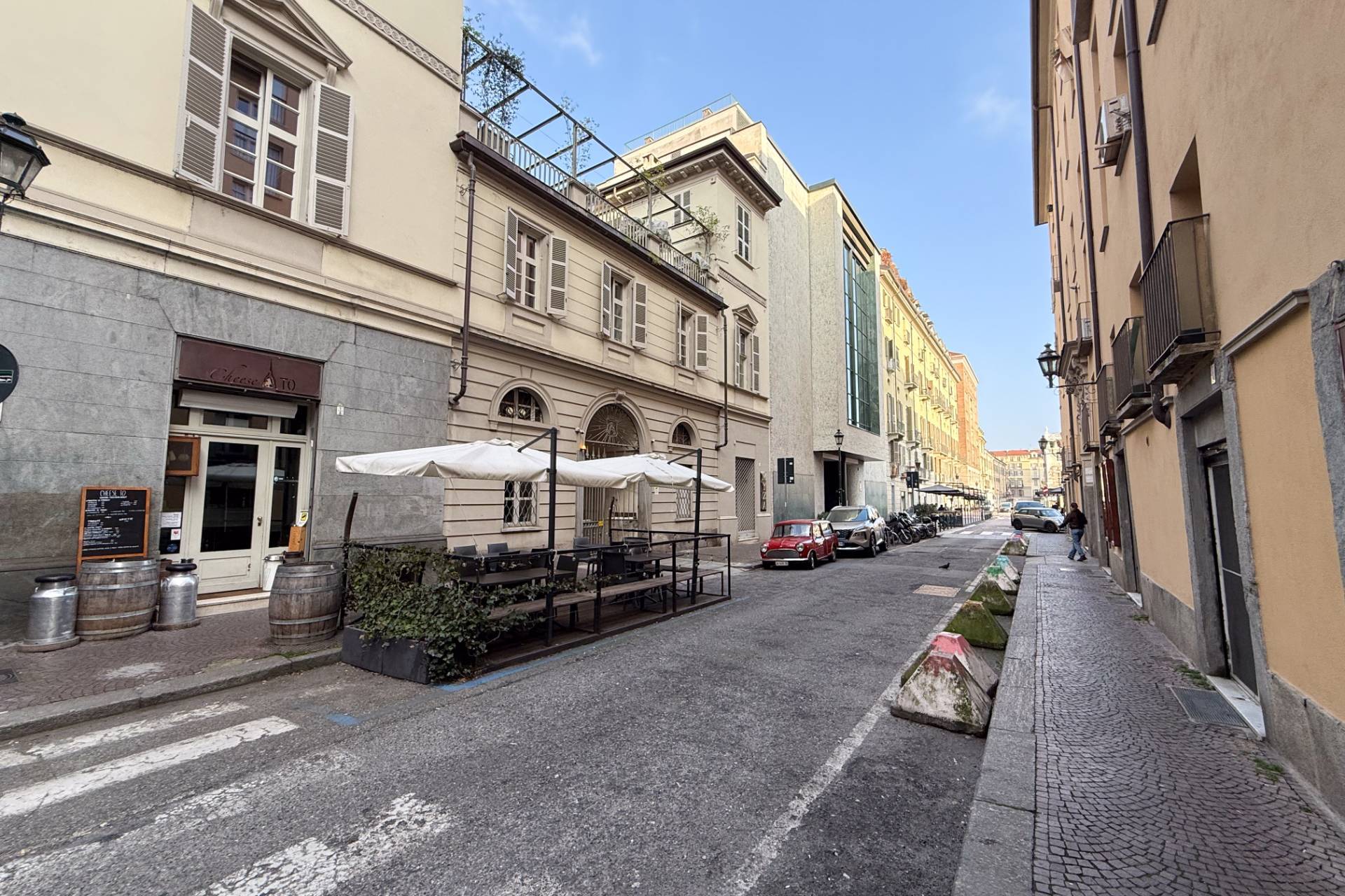 The property includes a cellar and an uncovered parking space in the courtyard with access from both Via Principe Amedeo and Piazza Carlina.