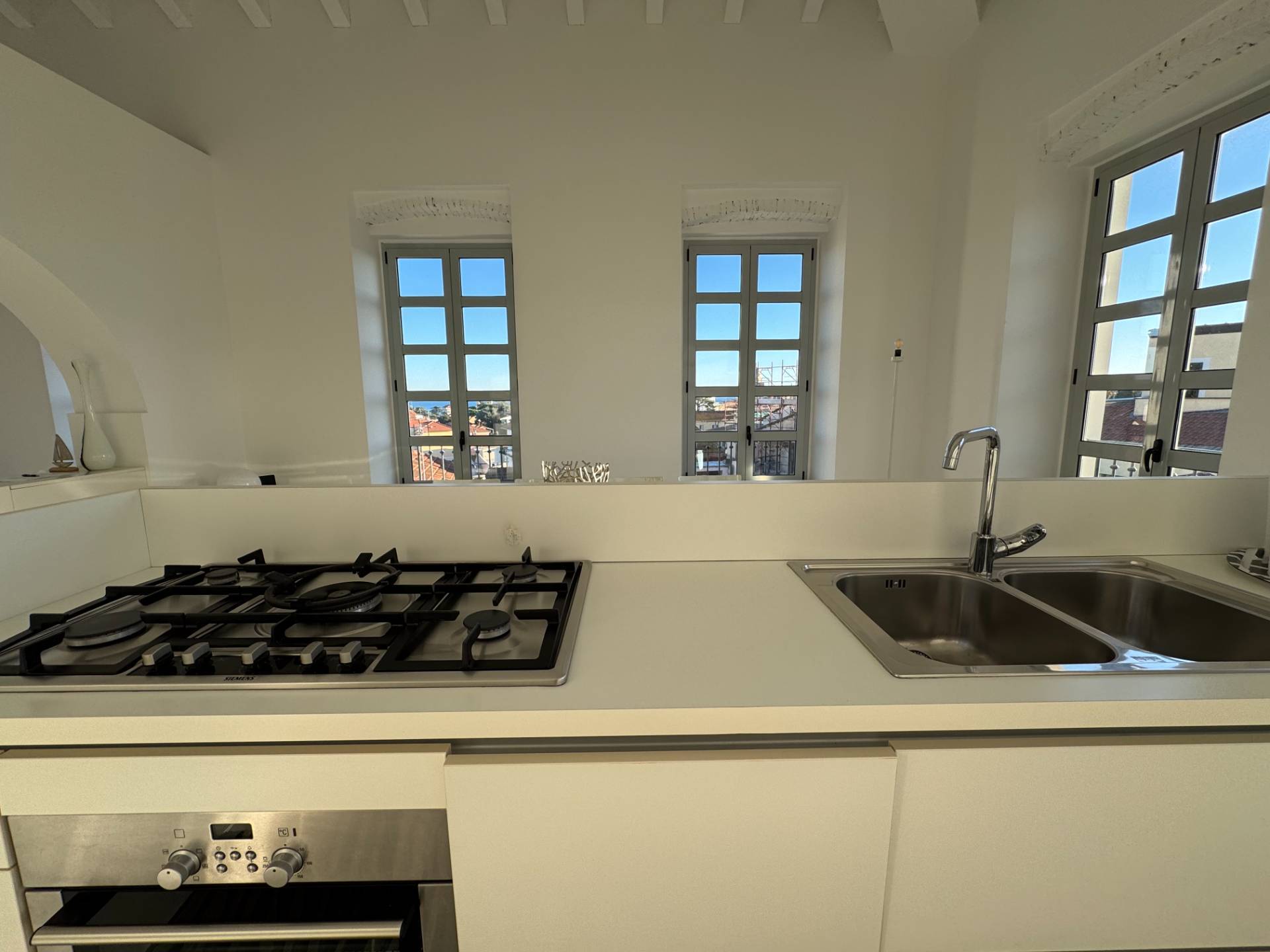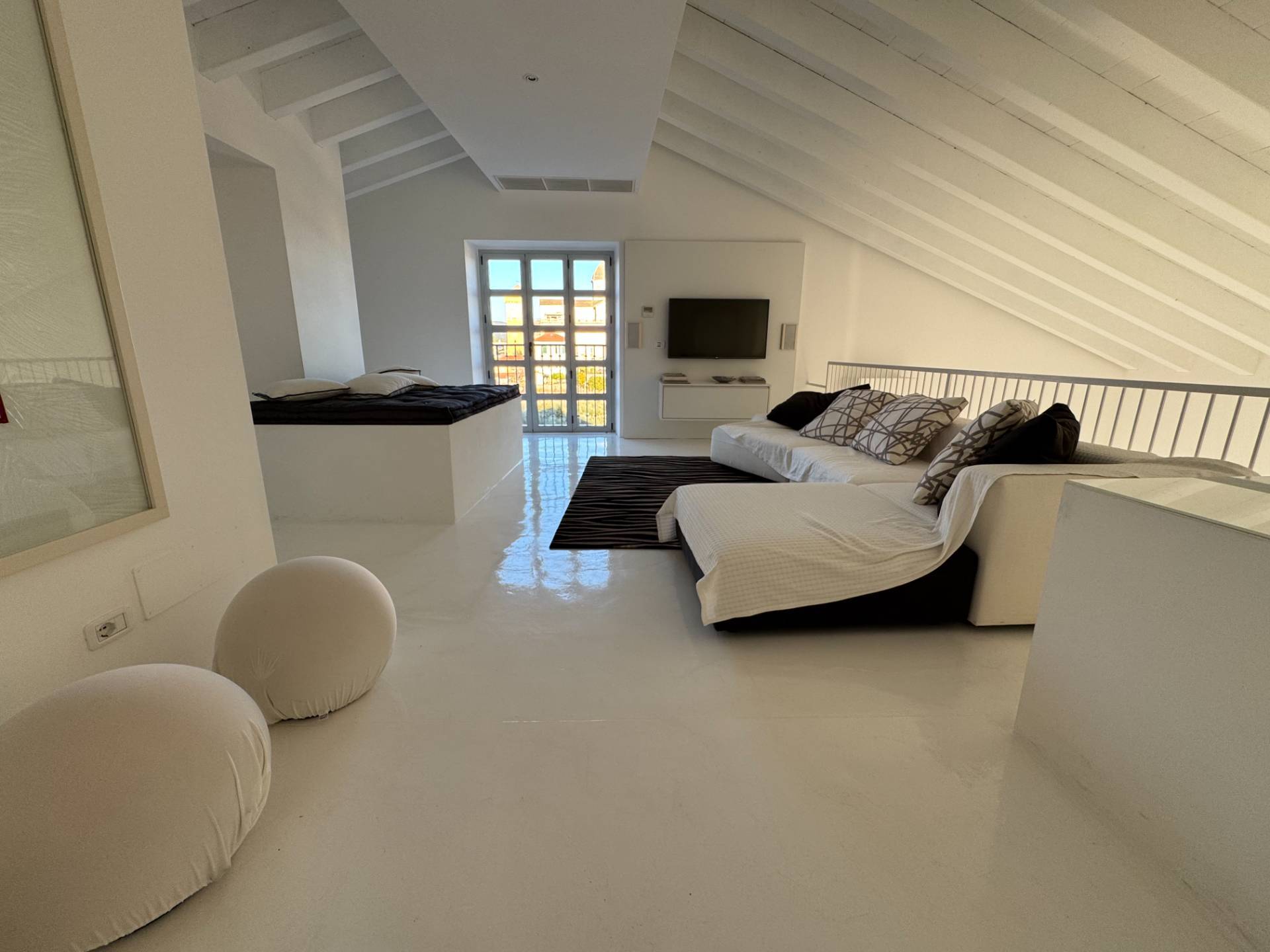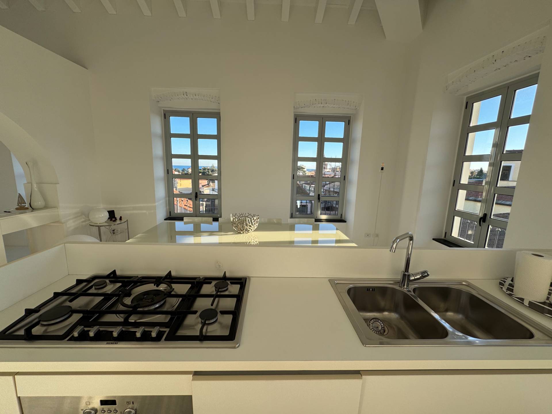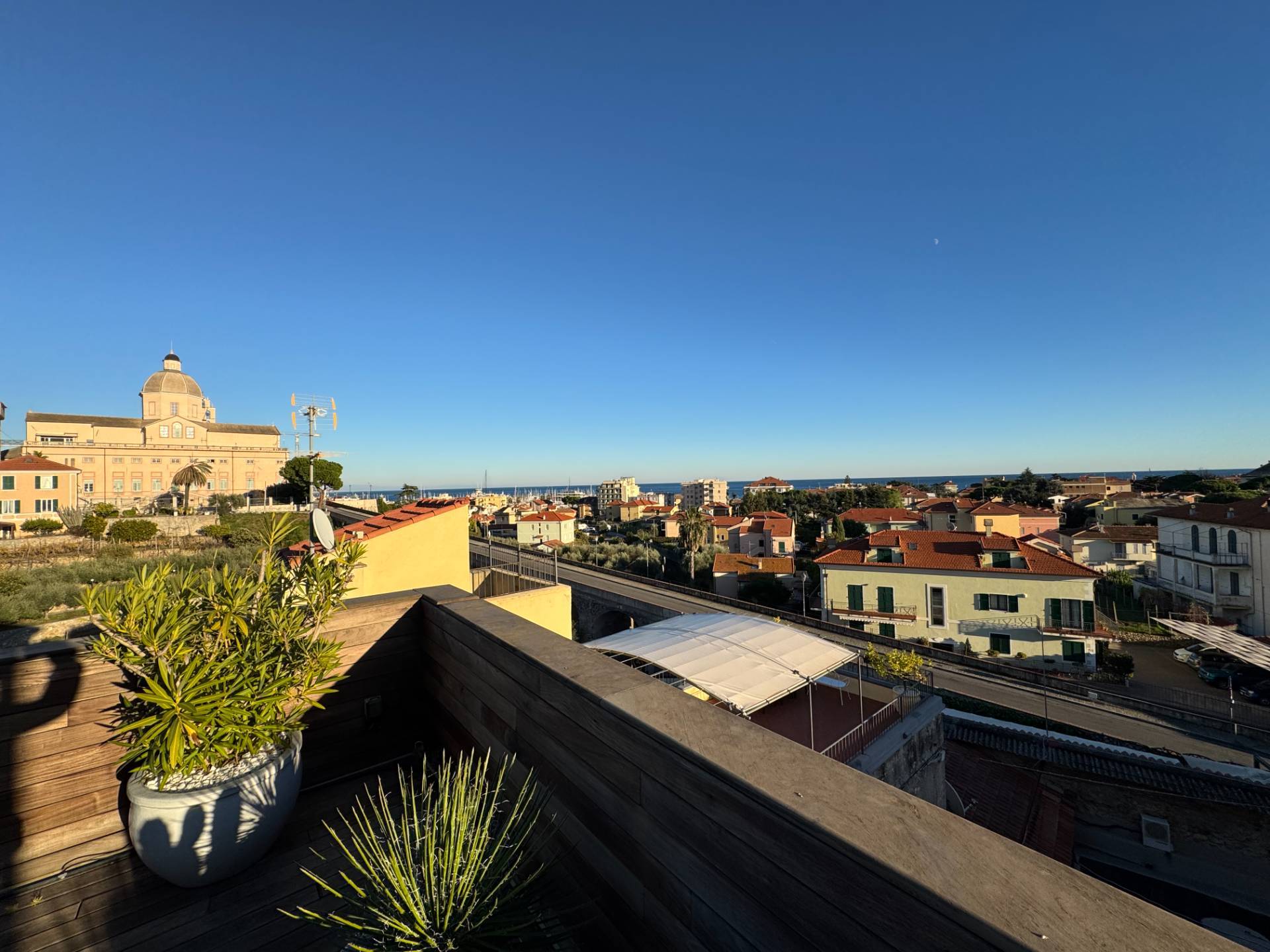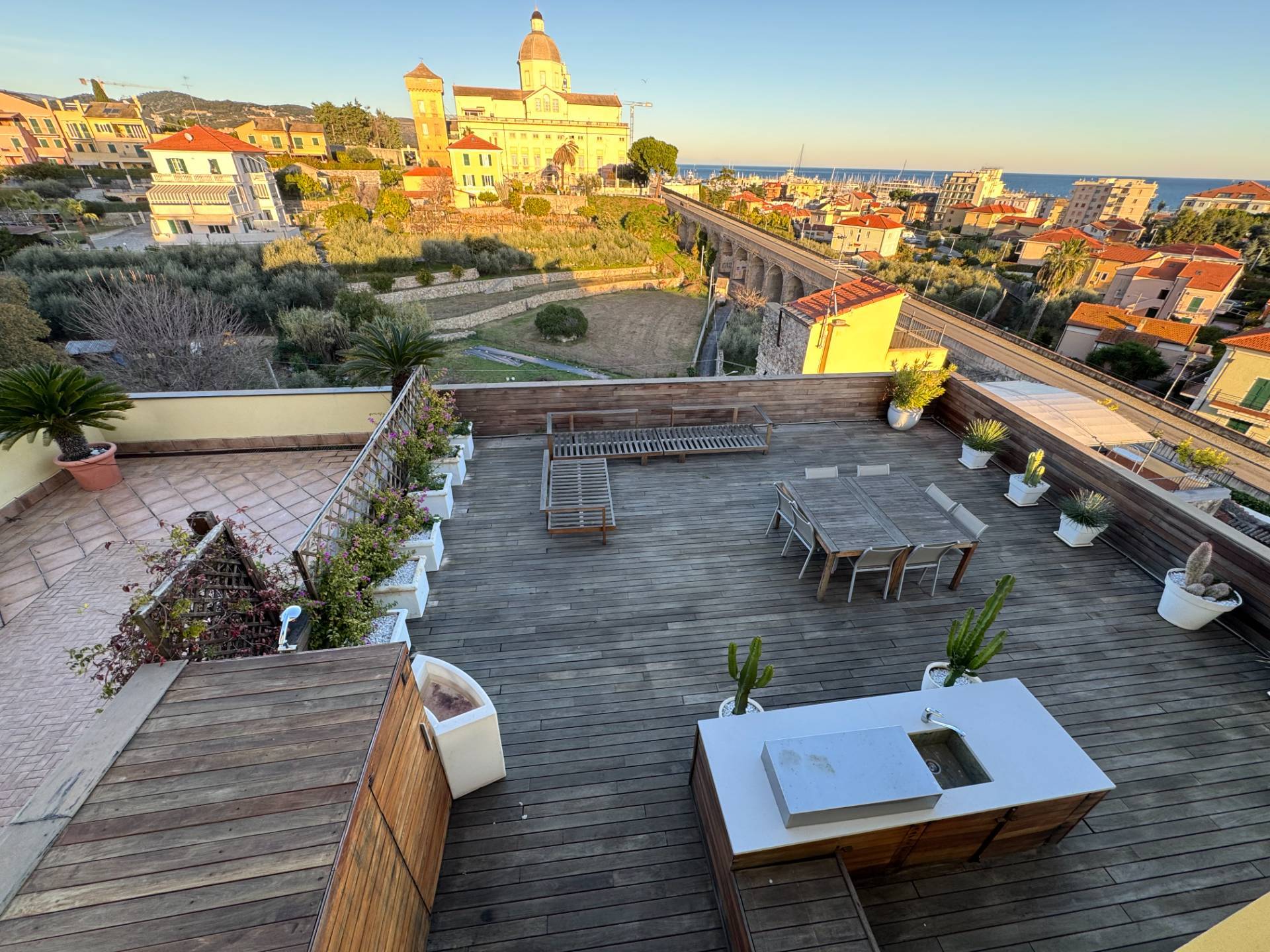 REF. 1755 - LUXURIOUS PENTHOUSE WITH TERRACE - In the beautiful and renowned town of Loano, this splendid, completely renovated two-level penthouse boasts a large terrace with sea views and two attached parking spaces. The unit has independent heating and air conditioning, two bathrooms, and a south-east/west exposure. The apartment comprises an entrance hall leading to a large living room with an open-plan kitchen and access to a large terrace and a bathroom on the first floor, while three double bedrooms and two bathrooms are located on the upper floor. Two private parking spaces are included in the price. The apartment has been completely renovated with quality materials, featuring resin flooring in the living area and parquet flooring in the bedrooms throughout, double-glazed PVC windows and doors, and a security door. Property Tax - €1,761.12.