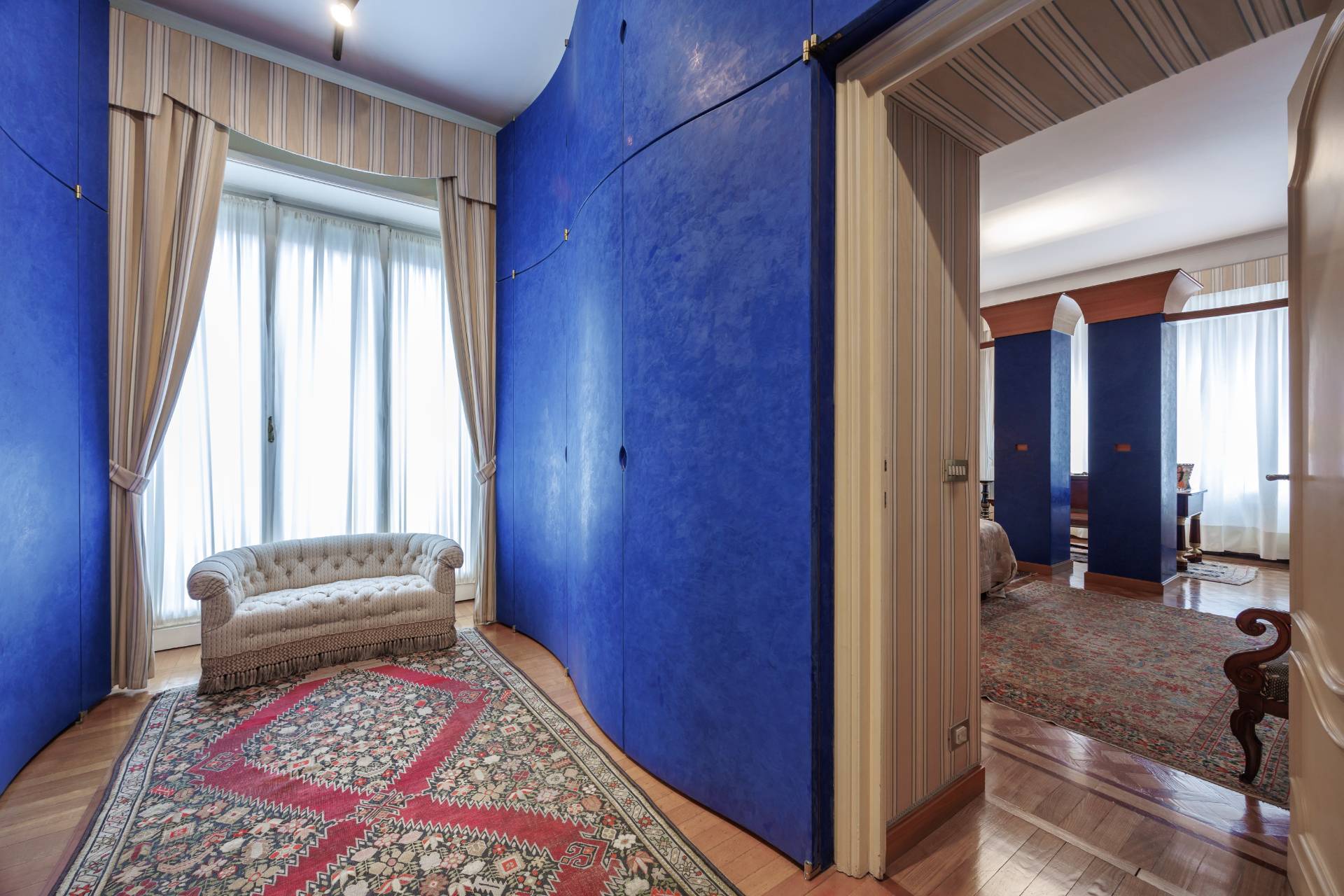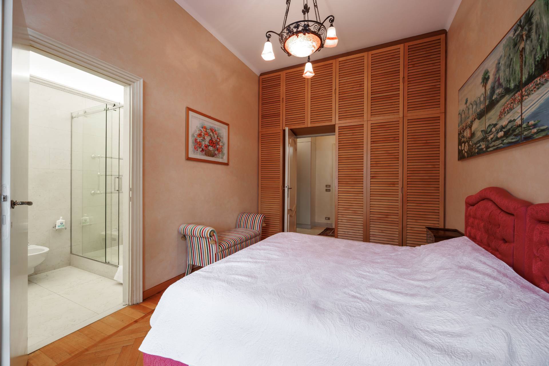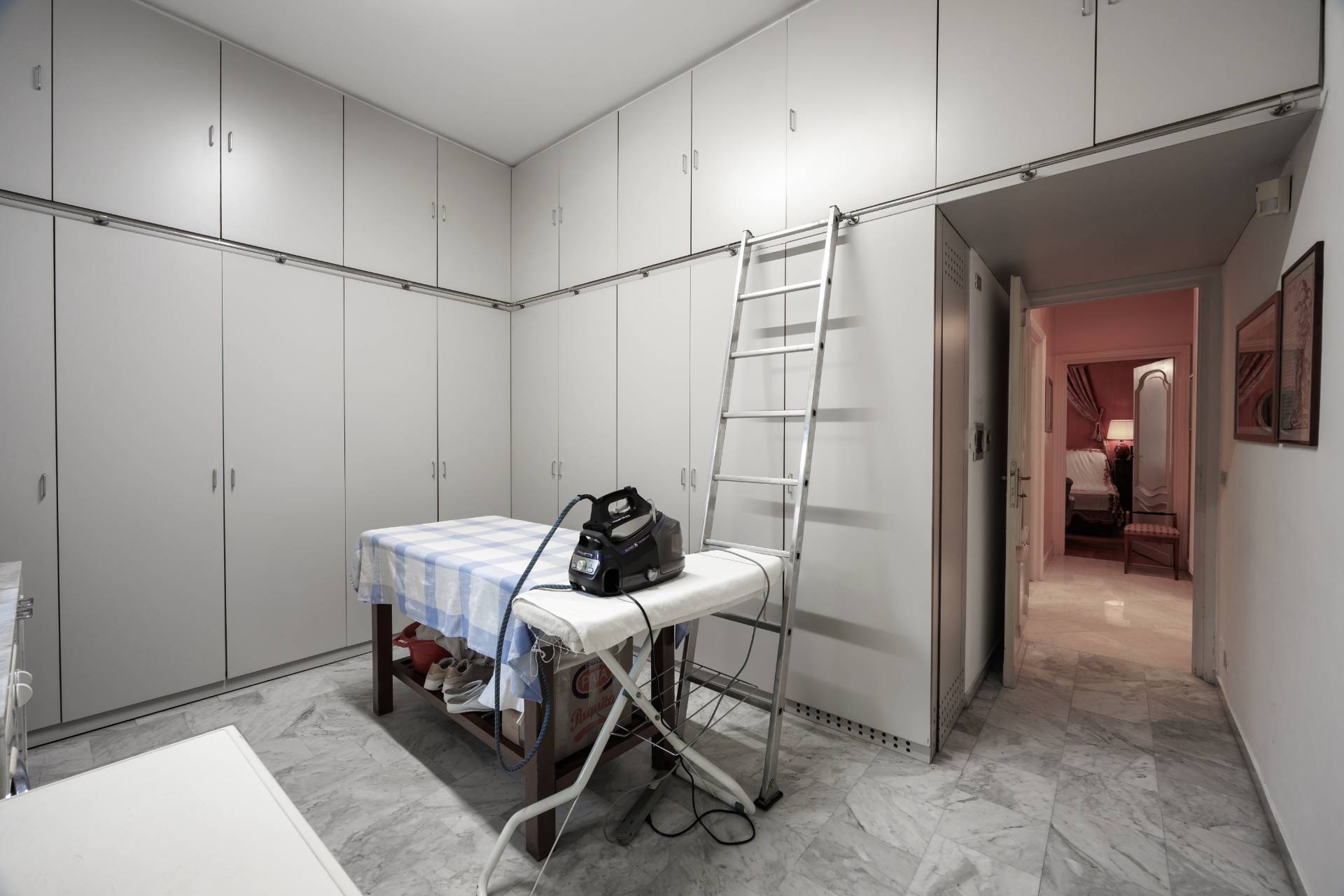 The spacious property is divided into two large areas: to the right of the entrance, there's a luxurious living area consisting of a double living room with a dining room overlooking Via Cantore via a usable terrace, a first bedroom with ensuite bathroom, a guest bathroom, an eat-in kitchen with a small terrace overlooking the courtyard, and finally a hallway with a built-in wardrobe that connects to the second area of the Apartment.