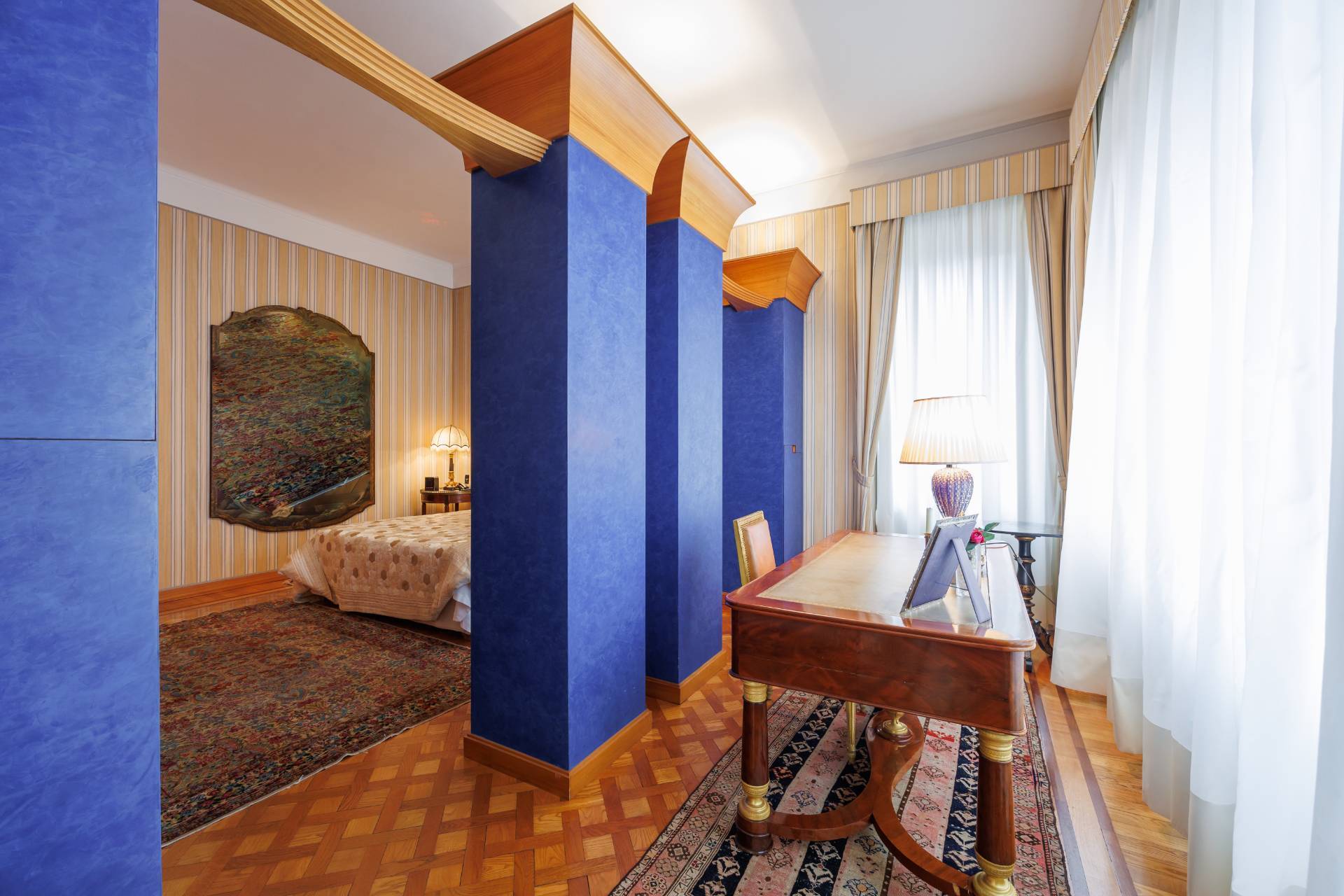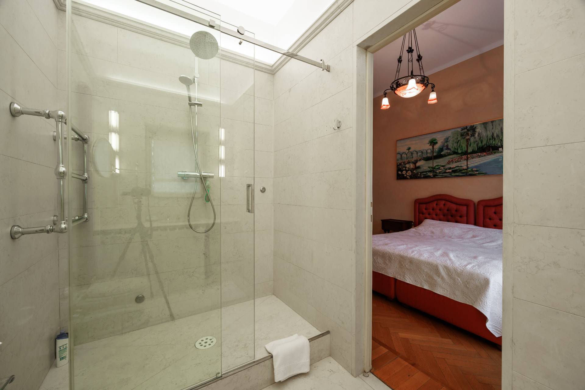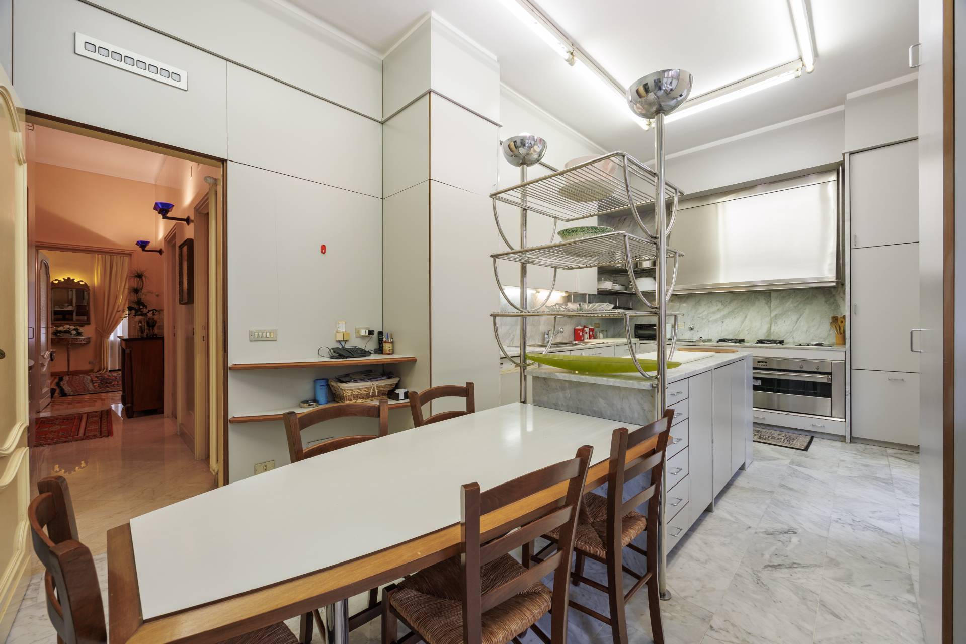 The spacious property is divided into two large areas: to the right of the entrance, there's a luxurious living area consisting of a double living room with a dining room overlooking Via Cantore via a usable terrace, a first bedroom with ensuite bathroom, a guest bathroom, an eat-in kitchen with a small terrace overlooking the courtyard, and finally a hallway with a built-in wardrobe that connects to the second area of the Apartment.