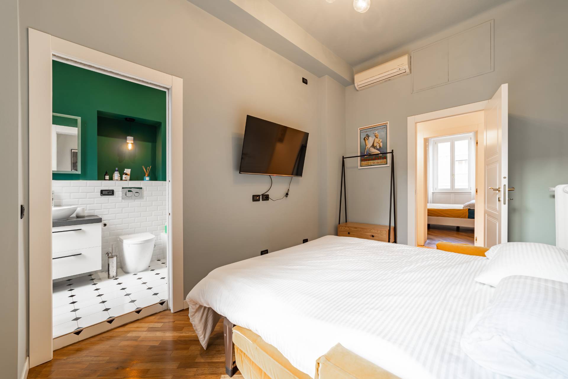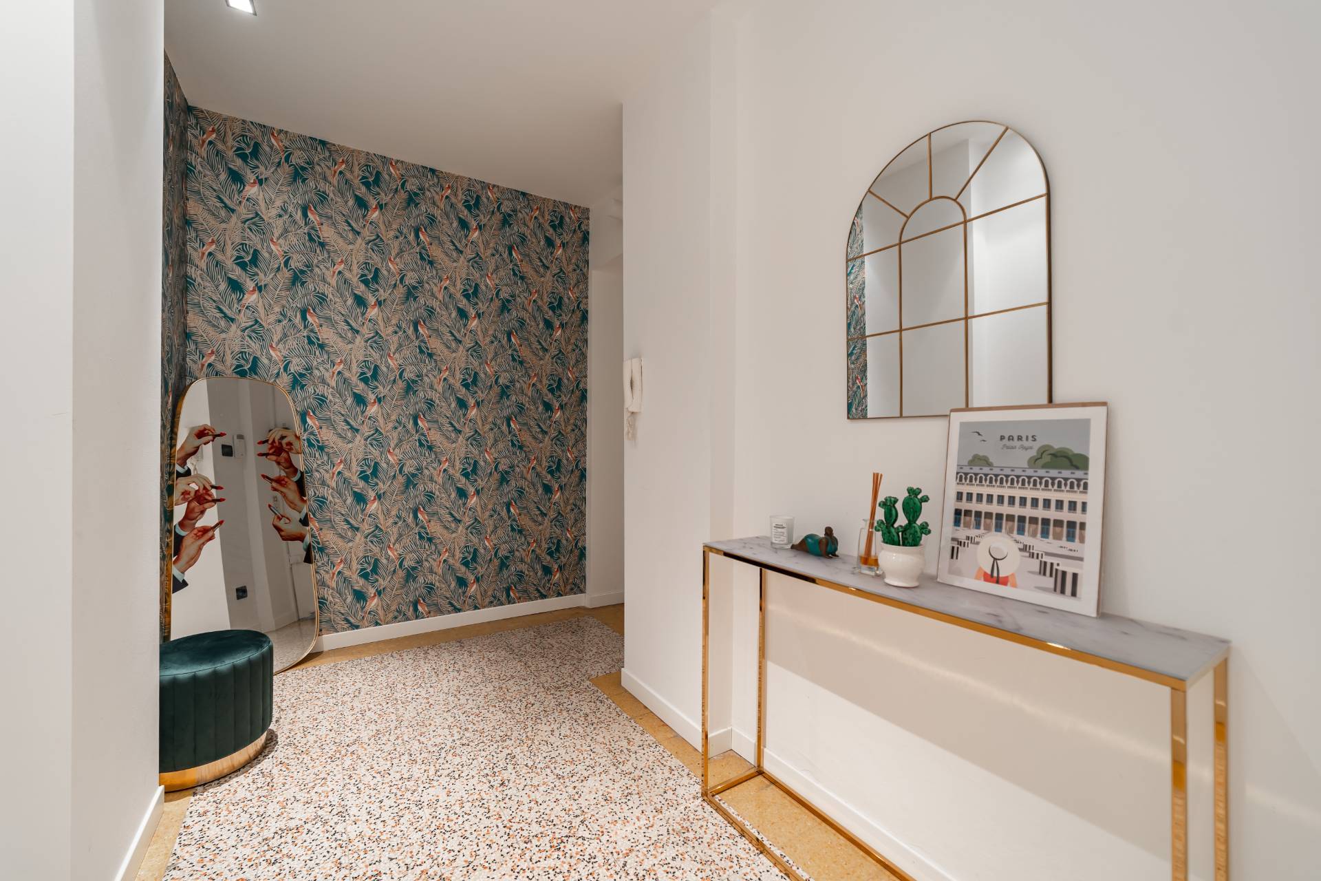 The entrance hall, featuring custom-built wardrobes, features Milanese cement flooring, and elegant wallpaper, and leads to the spacious living room overlooking a private road and featuring large French windows that flood the space with natural light. Directly opposite is the large eat-in kitchen with built-in appliances and expertly restored original flooring. The home has two bedrooms, one with an en suite bathroom and a large French window opening onto a small round balcony. The second bedroom overlooks a quiet private road and features a large custom-built wardrobe. A second bathroom is also available.