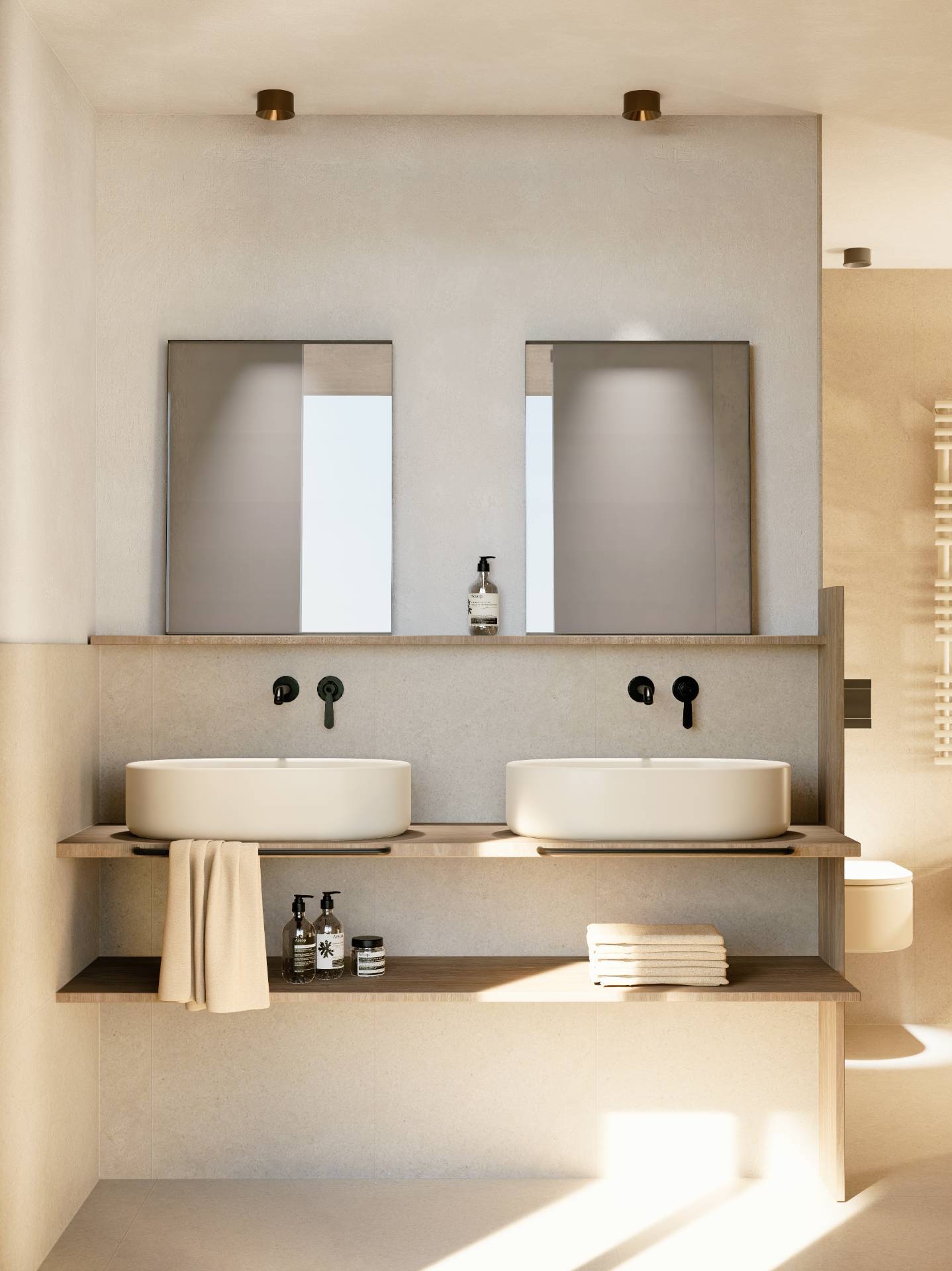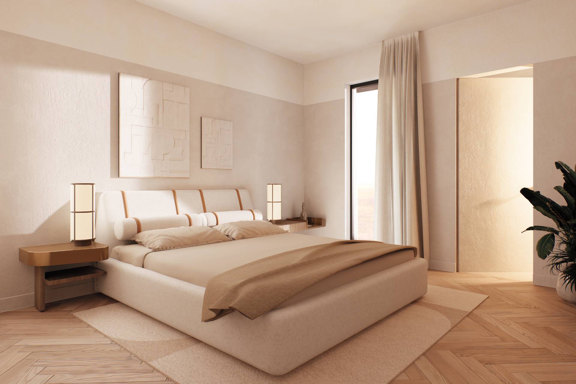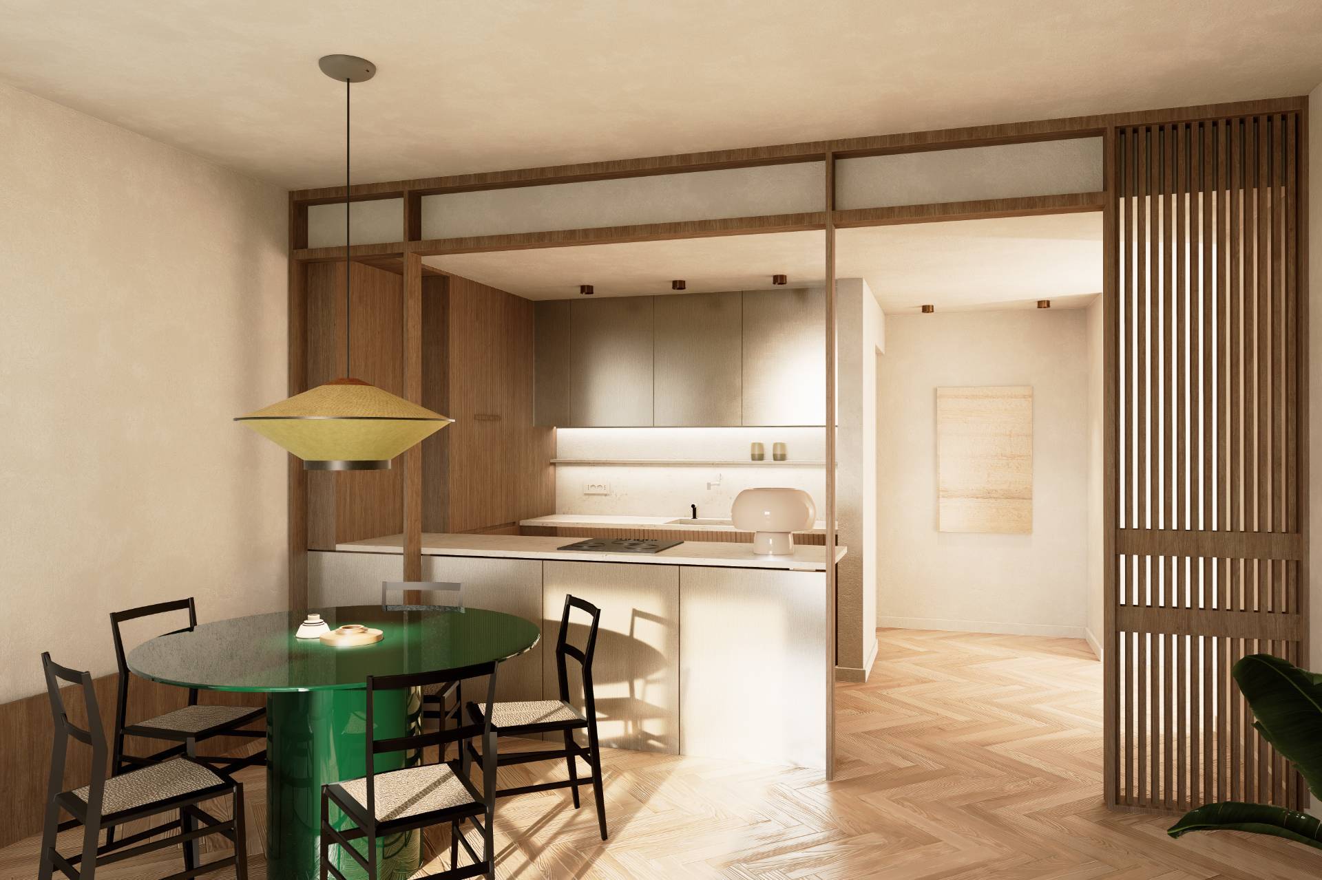 The renovation enhances the property with a contemporary and refined taste, as the renderings show: clean lines, warm and natural tones, modern finishes, as well as particular attention to spatial design and lighting.