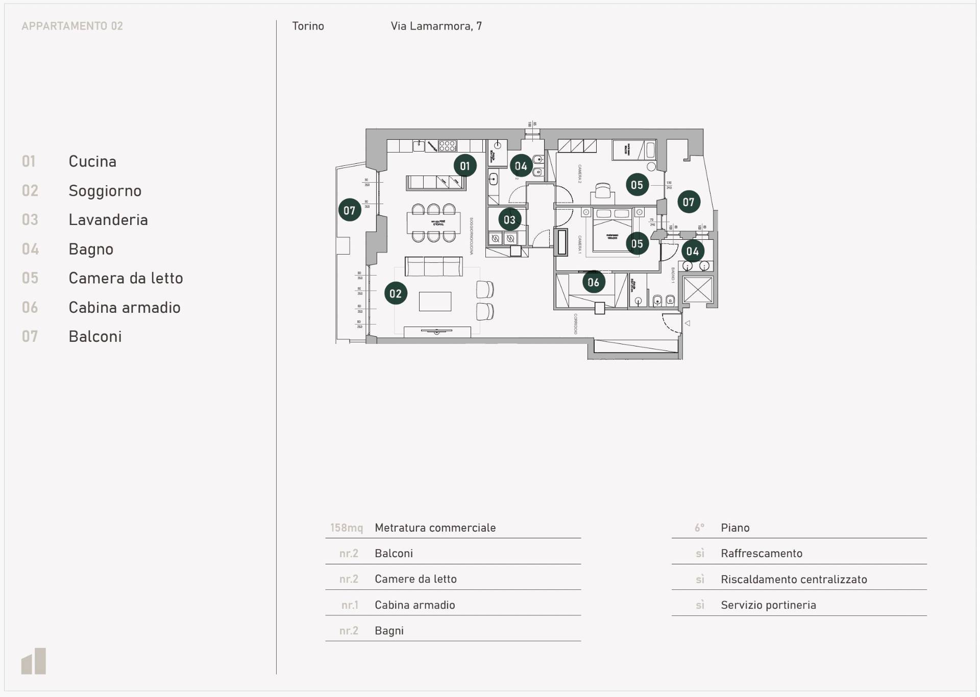 Just steps from the center of Turin and Porta Nuova Station, on the sixth floor of a stately building from the second half of the 20th century on Via Lamarmora and Corso Stati Uniti, lies Lamarmora 7, an exclusive residential project resulting from a complete and refined renovation. The residence is located on the sixth floor of an elegant 1970s building, with concierge service and two elevators. Its commanding position and open views provide the residence with extraordinary natural light and a constant feeling of airiness and comfort. From the terrace, views of the mountains that frame Turin open up, offering a unique and evocative visual experience. The design reinterprets the layout of spaces with a contemporary and functional approach, creating the perfect balance between design, architecture, and quality living.