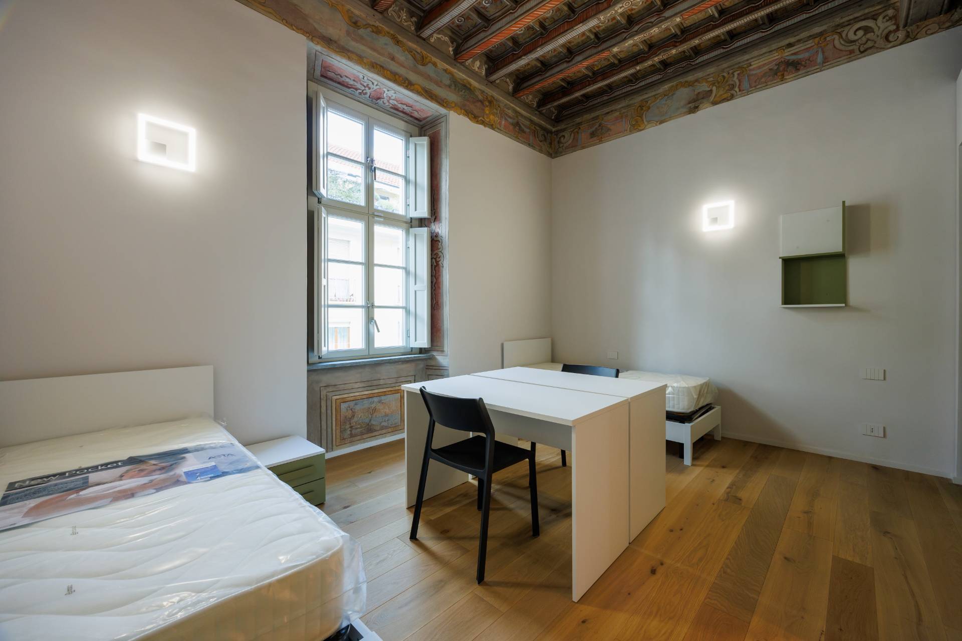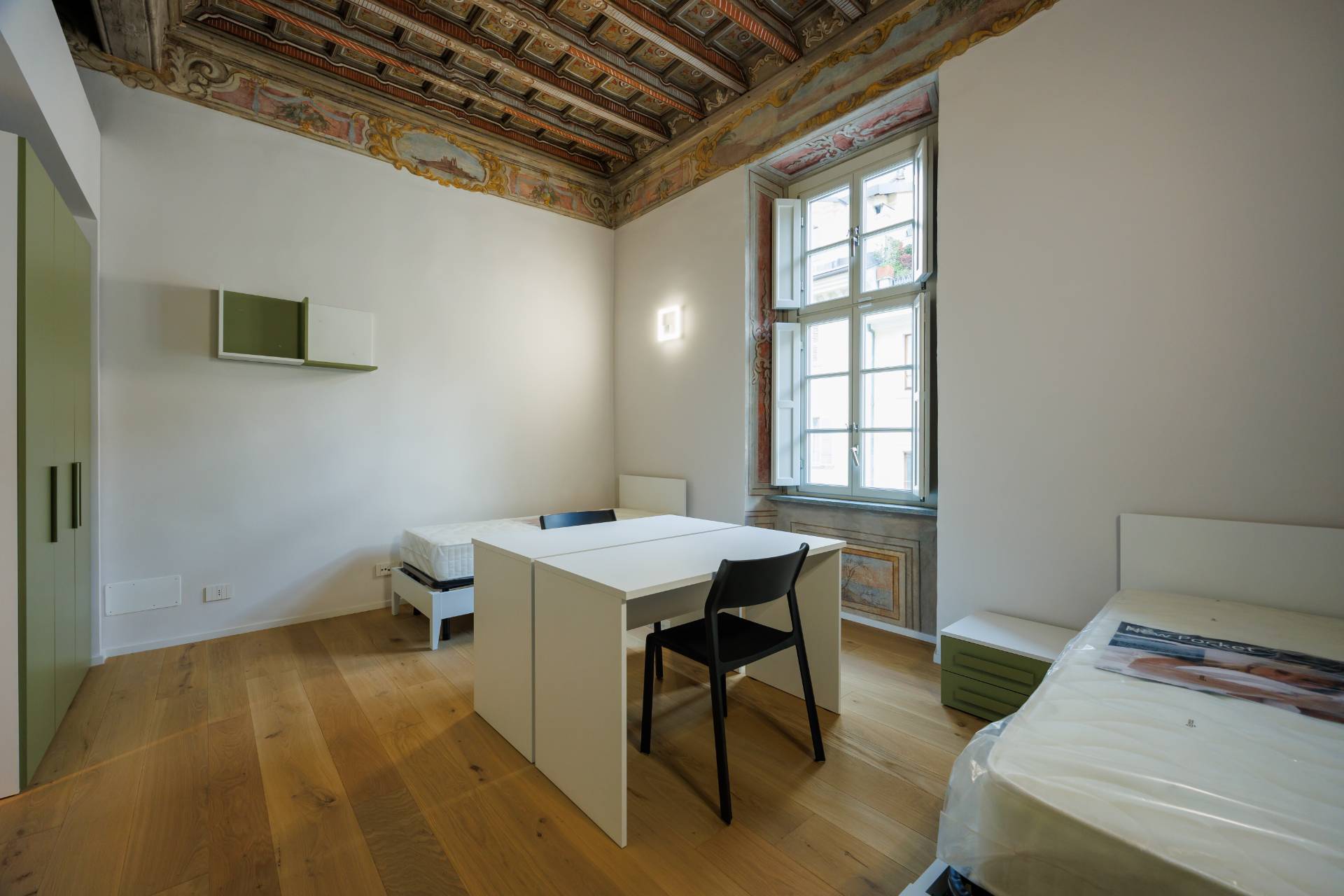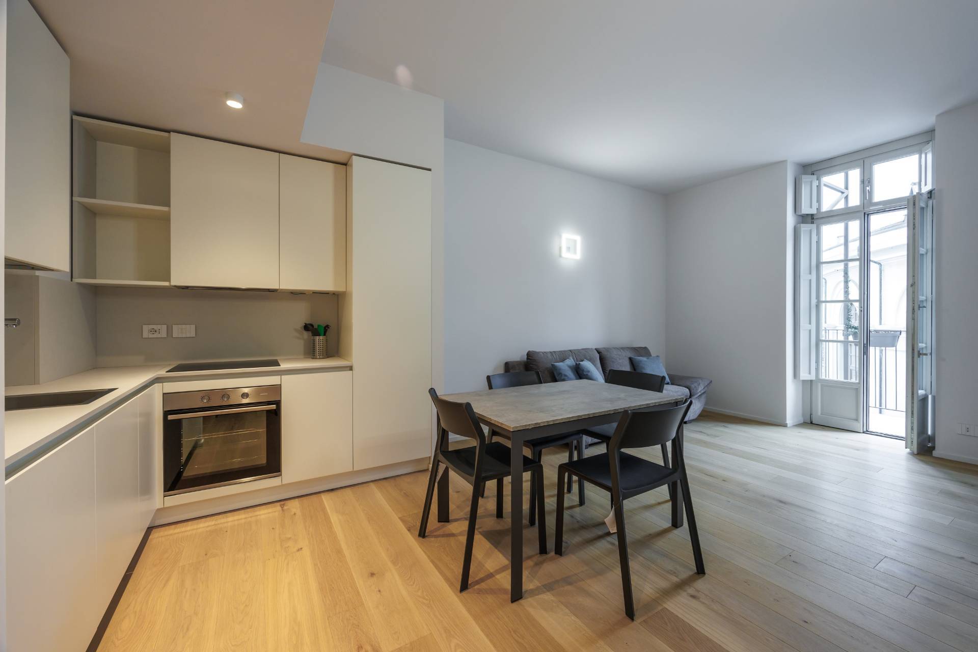 Located on the third floor, the Apartment is Rented fully furnished and comprises an entrance hallway, a living area with an open-plan kitchen equipped with appliances, two bedrooms, and two bathrooms. A balcony overlooks the internal courtyard.