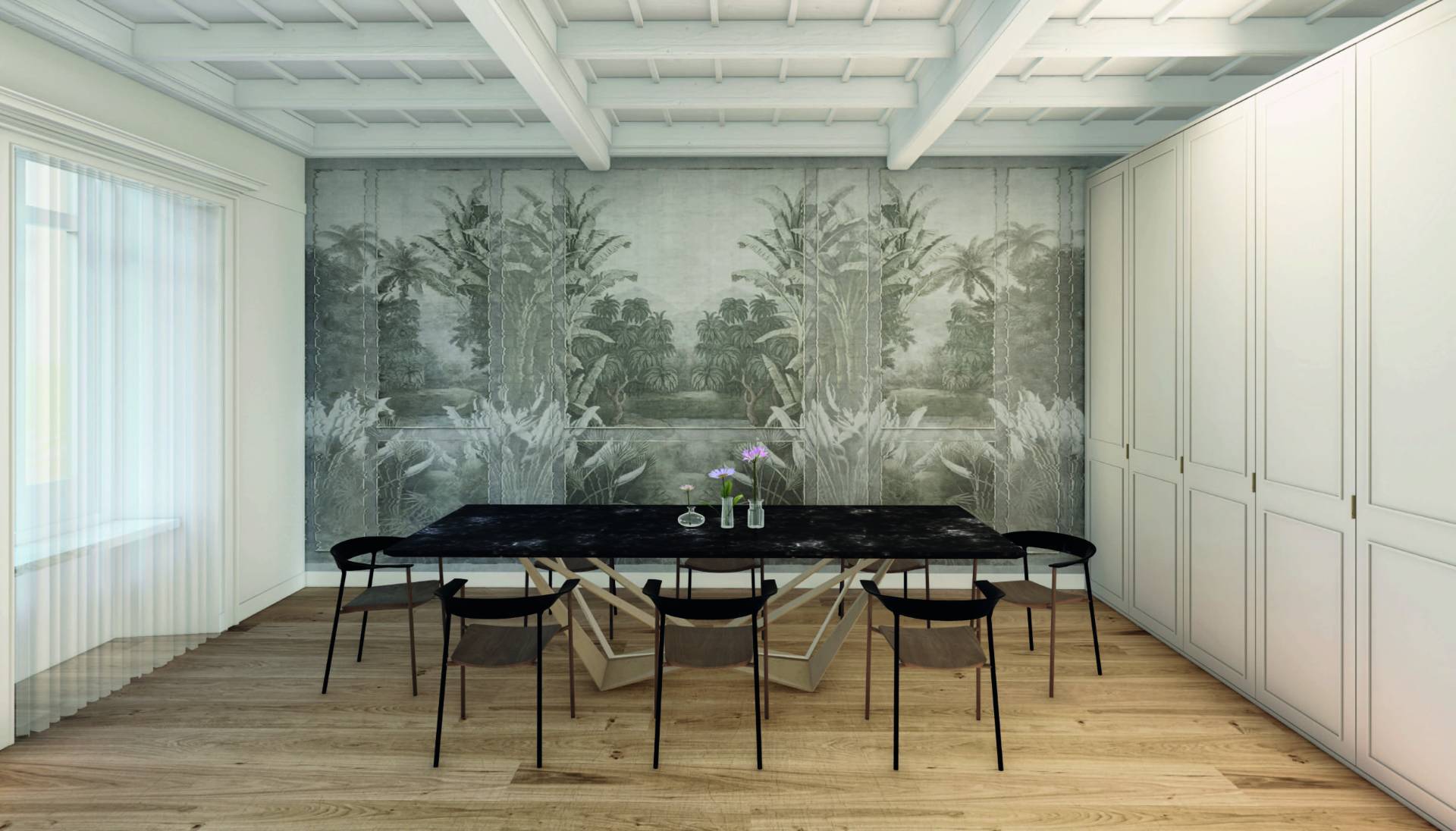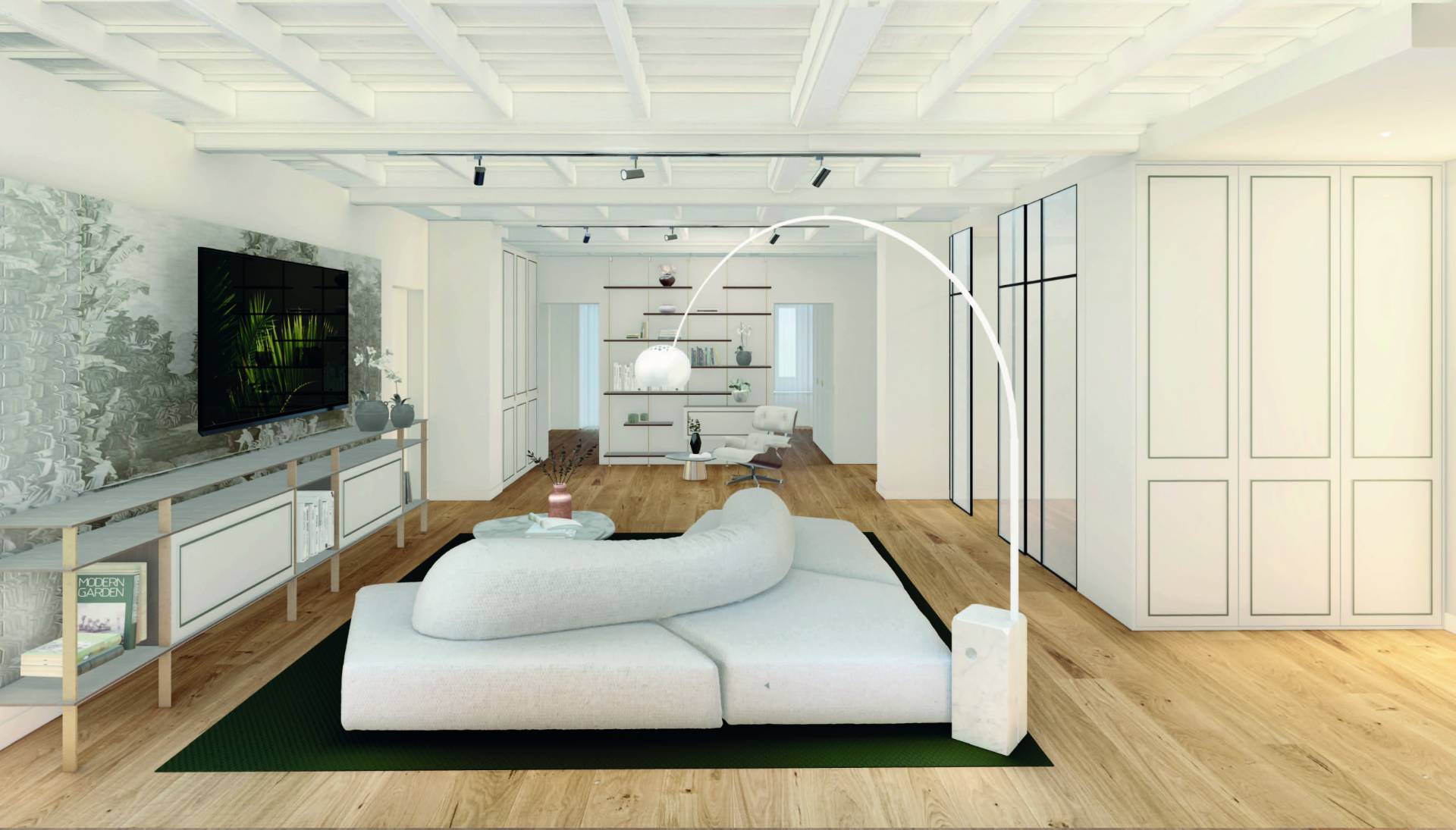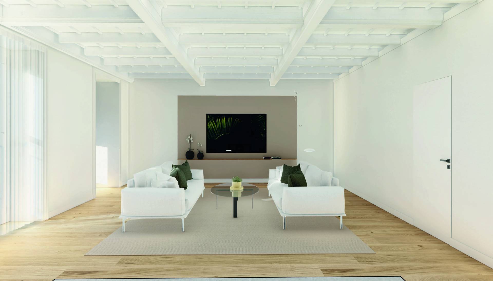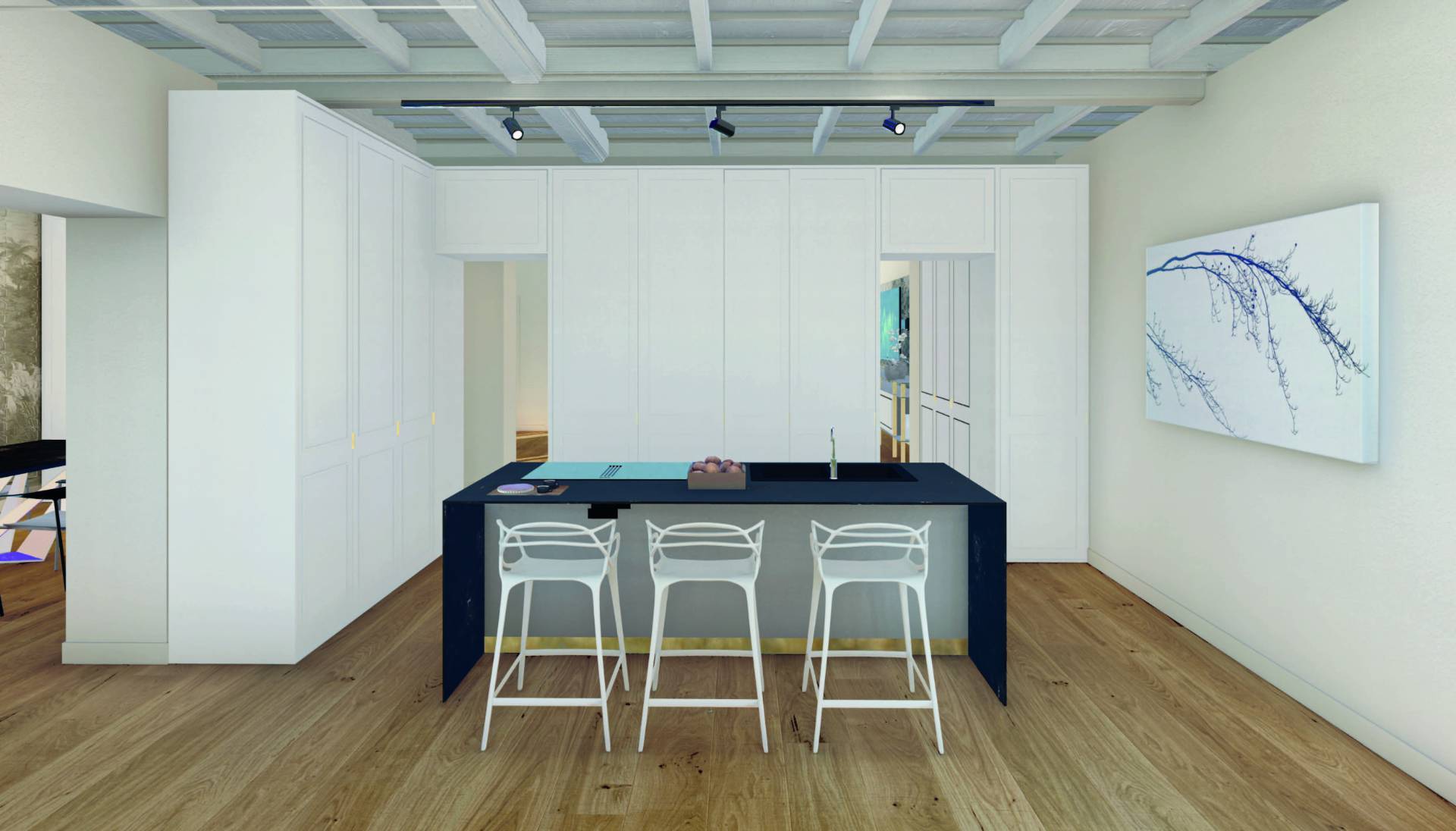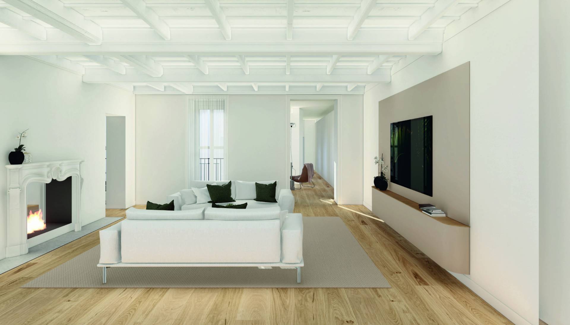The property stands out for its elegant coffered ceilings, which will be repainted white to further enhance the brightness of the rooms.