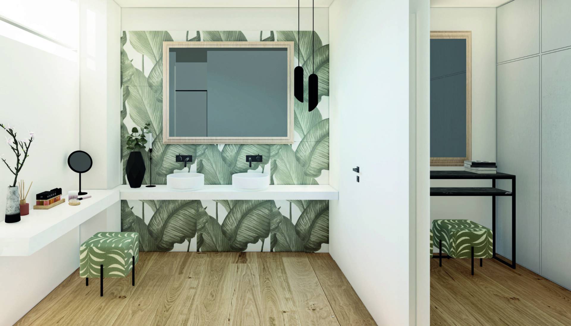 A corridor leads to the main sleeping area, consisting of a master bedroom with walk-in closet and en suite bathroom and a second bedroom with private bathroom.