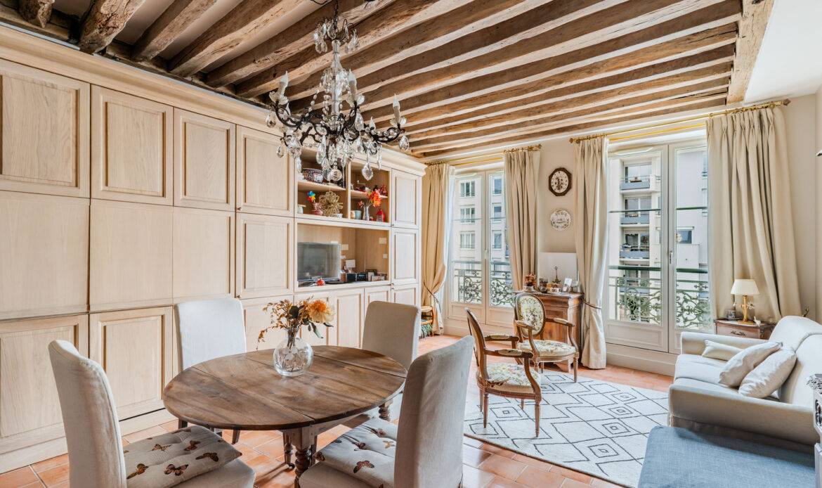Overlooking Rue du Grenier-Saint-Lazare, it enjoys unobstructed views of Rue Beaubourg and excellent natural light (southwest exposure). Period details such as wooden beams and independent electric heating ensure energy efficiency rating (D). The Apartment boasts a prime location in one of Paris's most central and sought-after neighborhoods, making it an ideal pied-à-terre or investment opportunity.