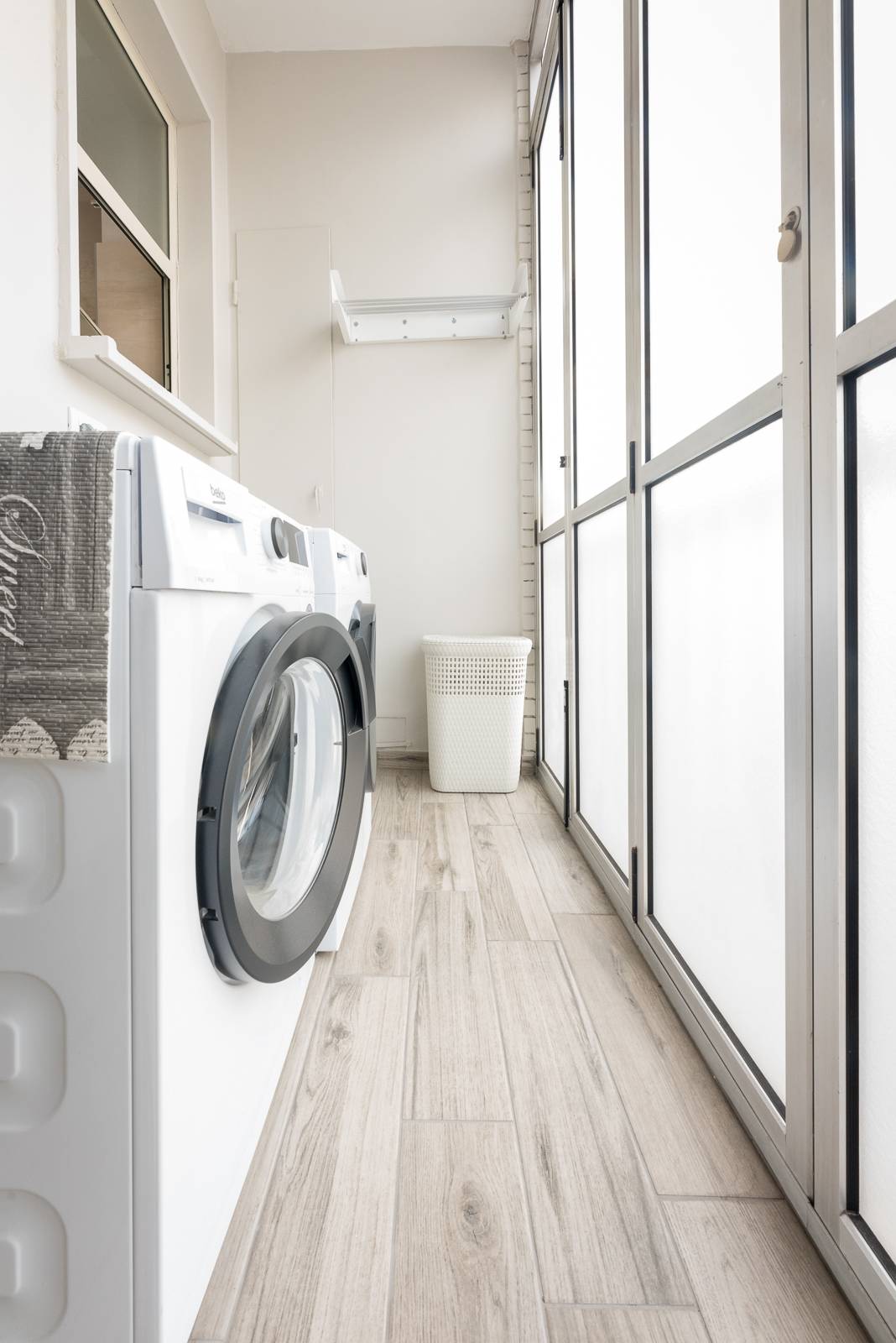 1 Bright, fully and tastefully renovated and furnished Apartment on the third floor with elevator. It comprises an entrance hall, a good-sized living room with access to the balcony via a large French window, a spacious dining room with kitchenette, a covered balcony with laundry room, two bedrooms, a bathroom, and a cellar in the basement.
