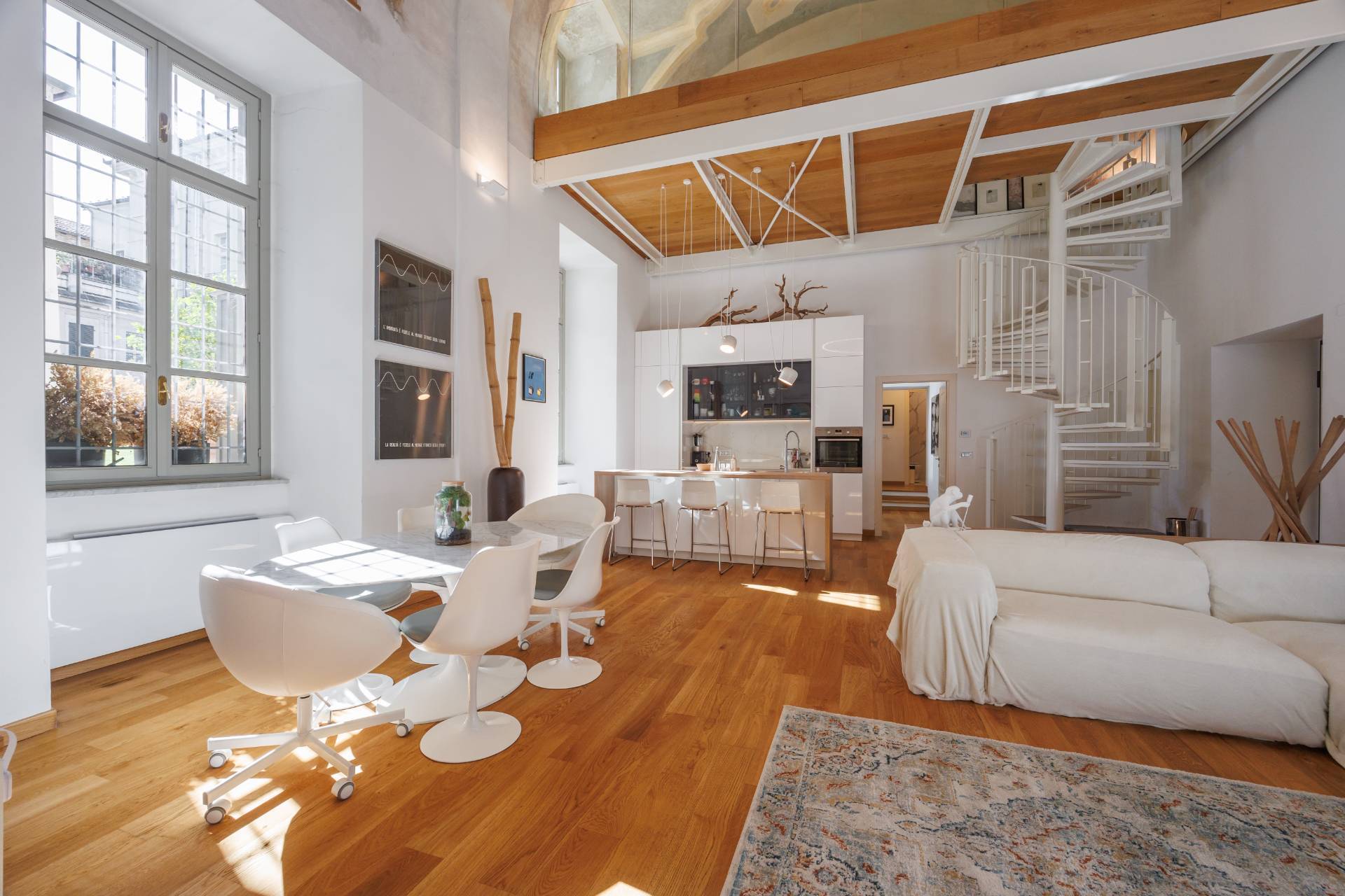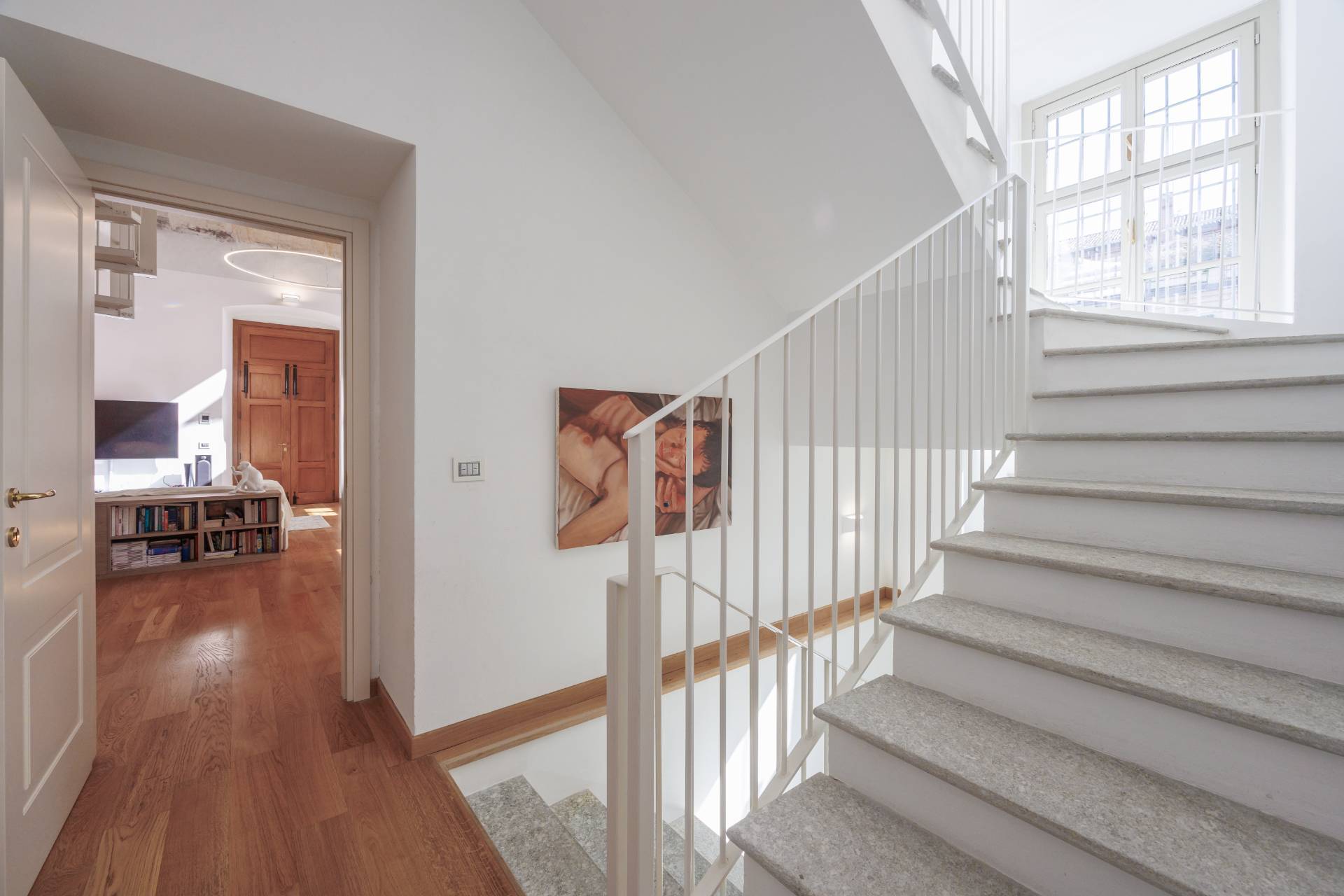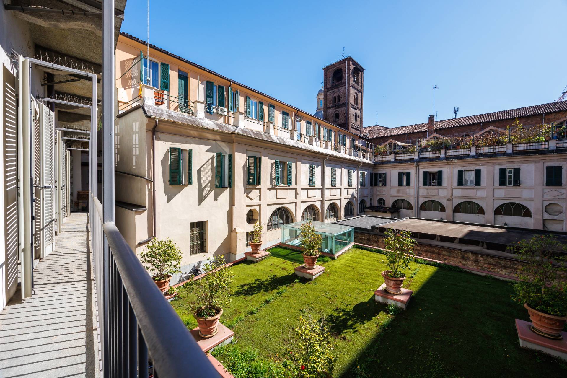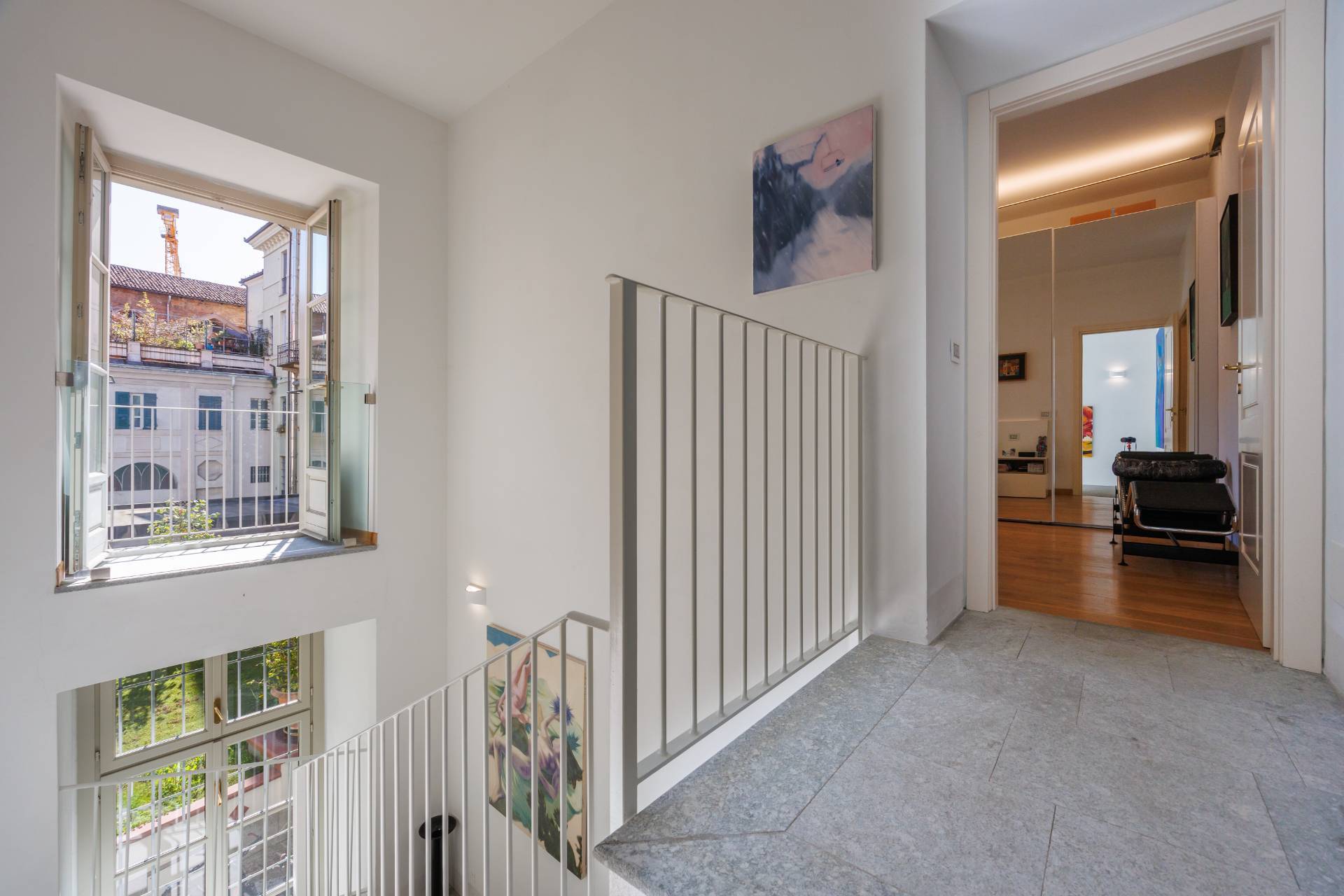 2 PALAZZO SAN LIBORIO - Via Bellezia, in Turin's historic center, this prestigious and bright Apartment on several levels has been renovated in a period building, secured by a concierge. The ground floor comprises an entrance hall leading to a spacious living room with a charming frescoed ceiling, an open-plan kitchen, a mezzanine level that can be used as an additional bedroom, a bedroom, a bathroom, and a laundry room. A comfortable internal stone staircase leads to the first floor, which features a master bedroom with ensuite bathroom and a balcony overlooking a delightful and quiet courtyard. The same staircase leads to a large cellar in the basement. The property has undergone a meticulous and harmonious renovation using high-quality, designer materials. Parquet flooring is throughout, and double-glazed wooden window frames are featured. Independent underfloor heating is provided.