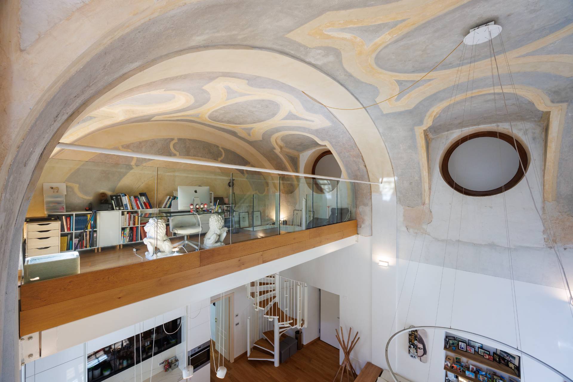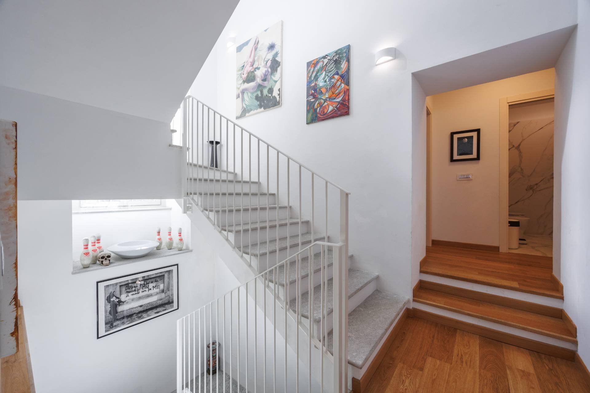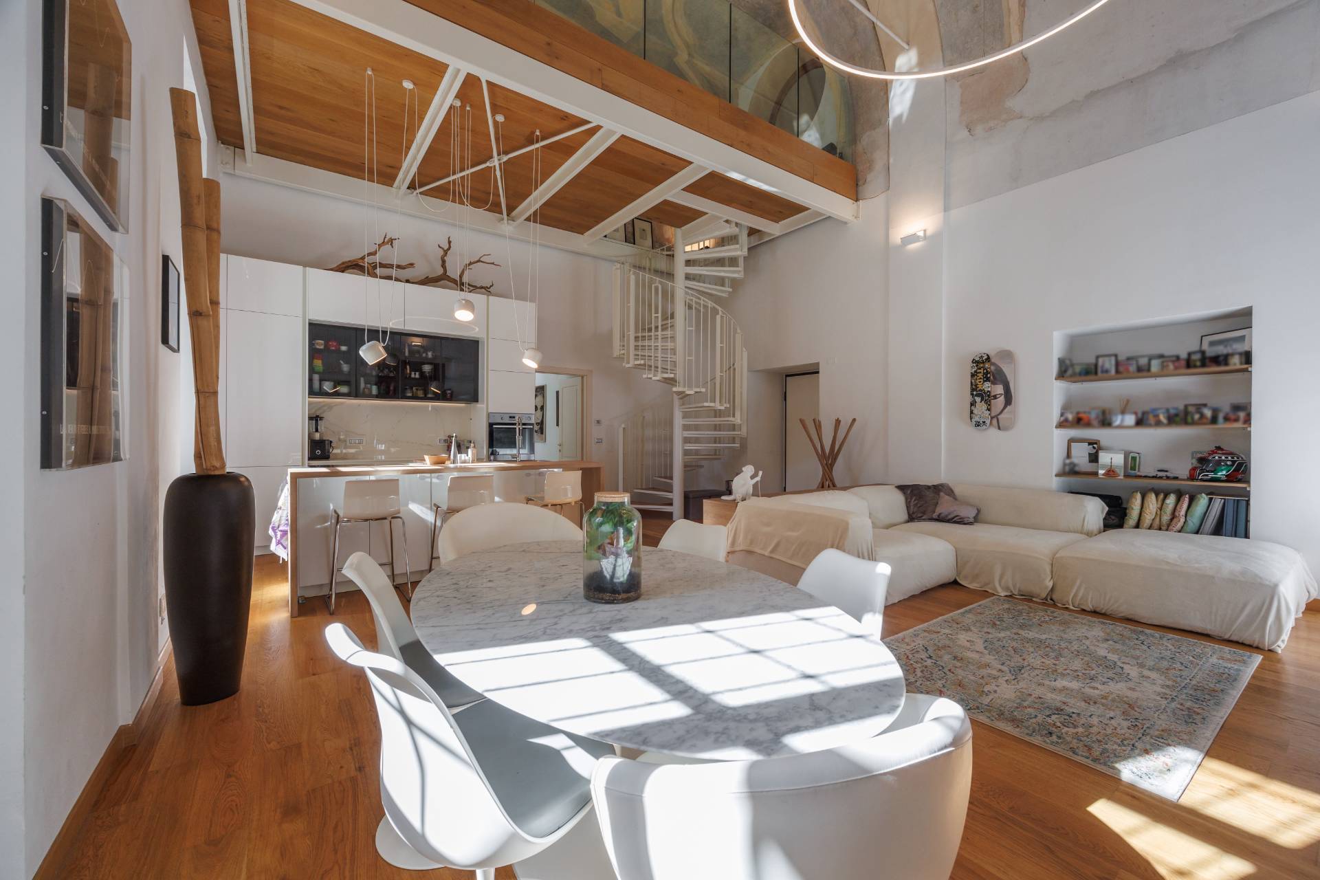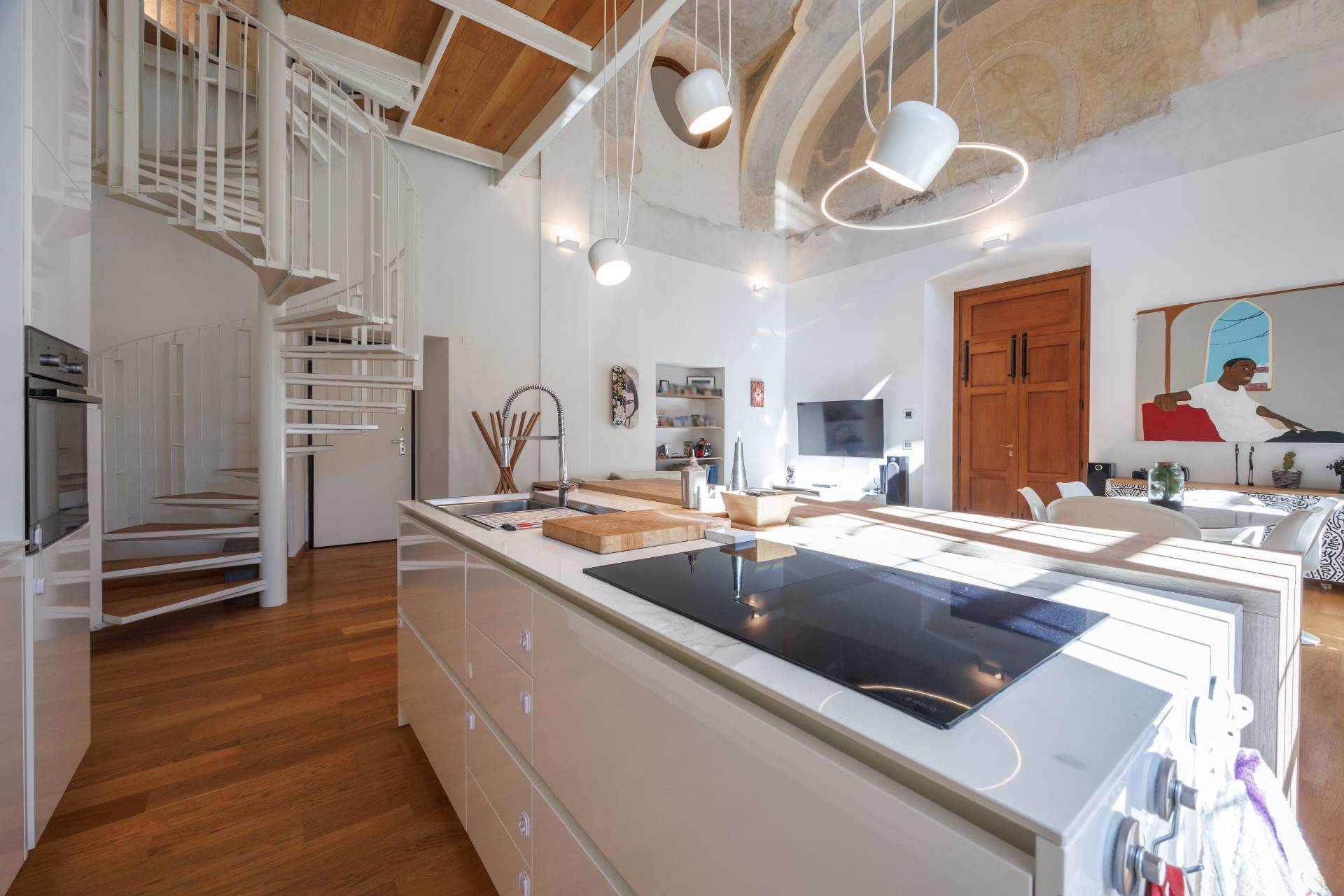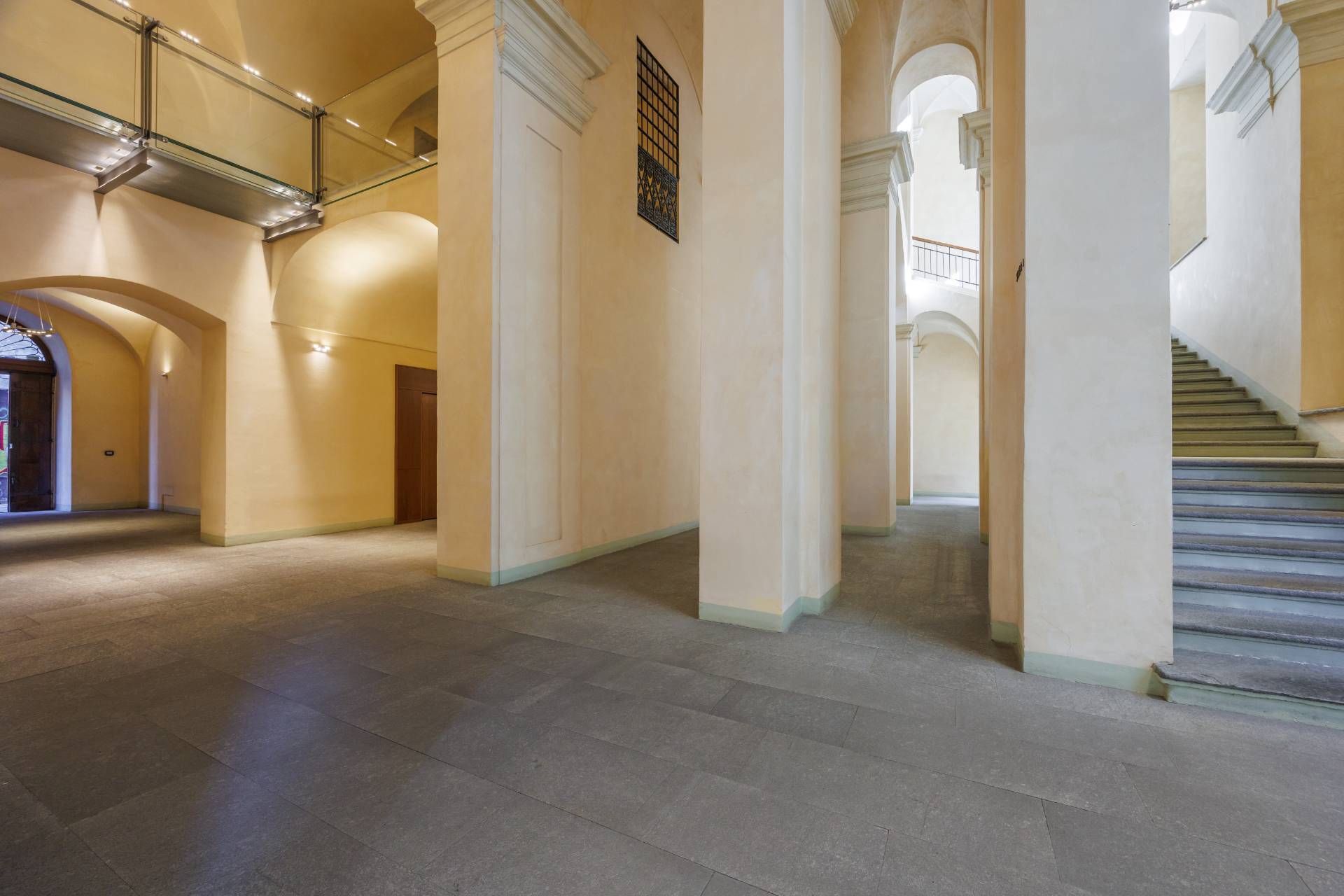 2 PALAZZO SAN LIBORIO - Via Bellezia, in Turin's historic center, this prestigious and bright Apartment on several levels has been renovated in a period building, secured by a concierge. The ground floor comprises an entrance hall leading to a spacious living room with a charming frescoed ceiling, an open-plan kitchen, a mezzanine level that can be used as an additional bedroom, a bedroom, a bathroom, and a laundry room. A comfortable internal stone staircase leads to the first floor, which features a master bedroom with ensuite bathroom and a balcony overlooking a delightful and quiet courtyard. The same staircase leads to a large cellar in the basement. The property has undergone a meticulous and harmonious renovation using high-quality, designer materials. Parquet flooring is throughout, and double-glazed wooden window frames are featured. Independent underfloor heating is provided.
