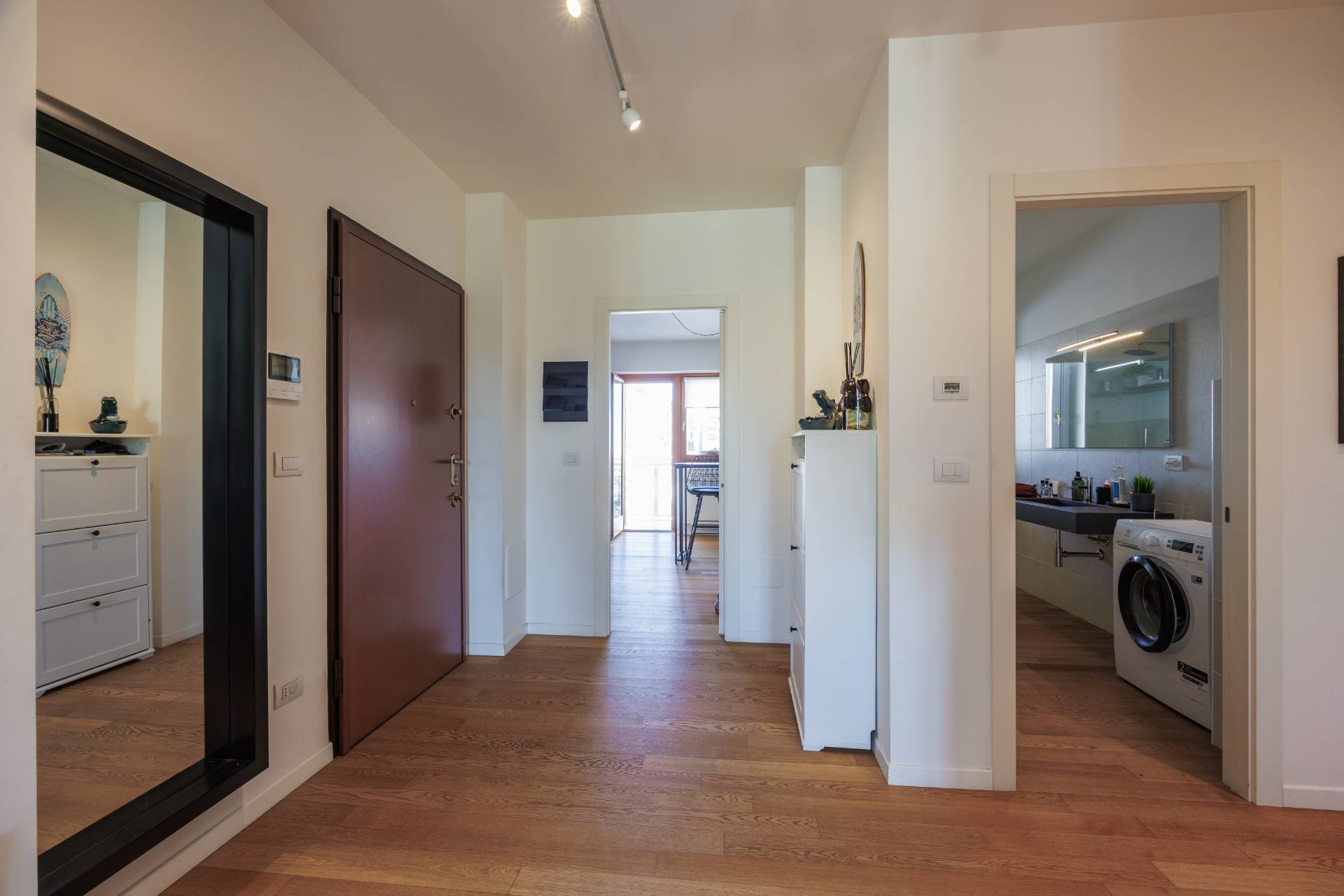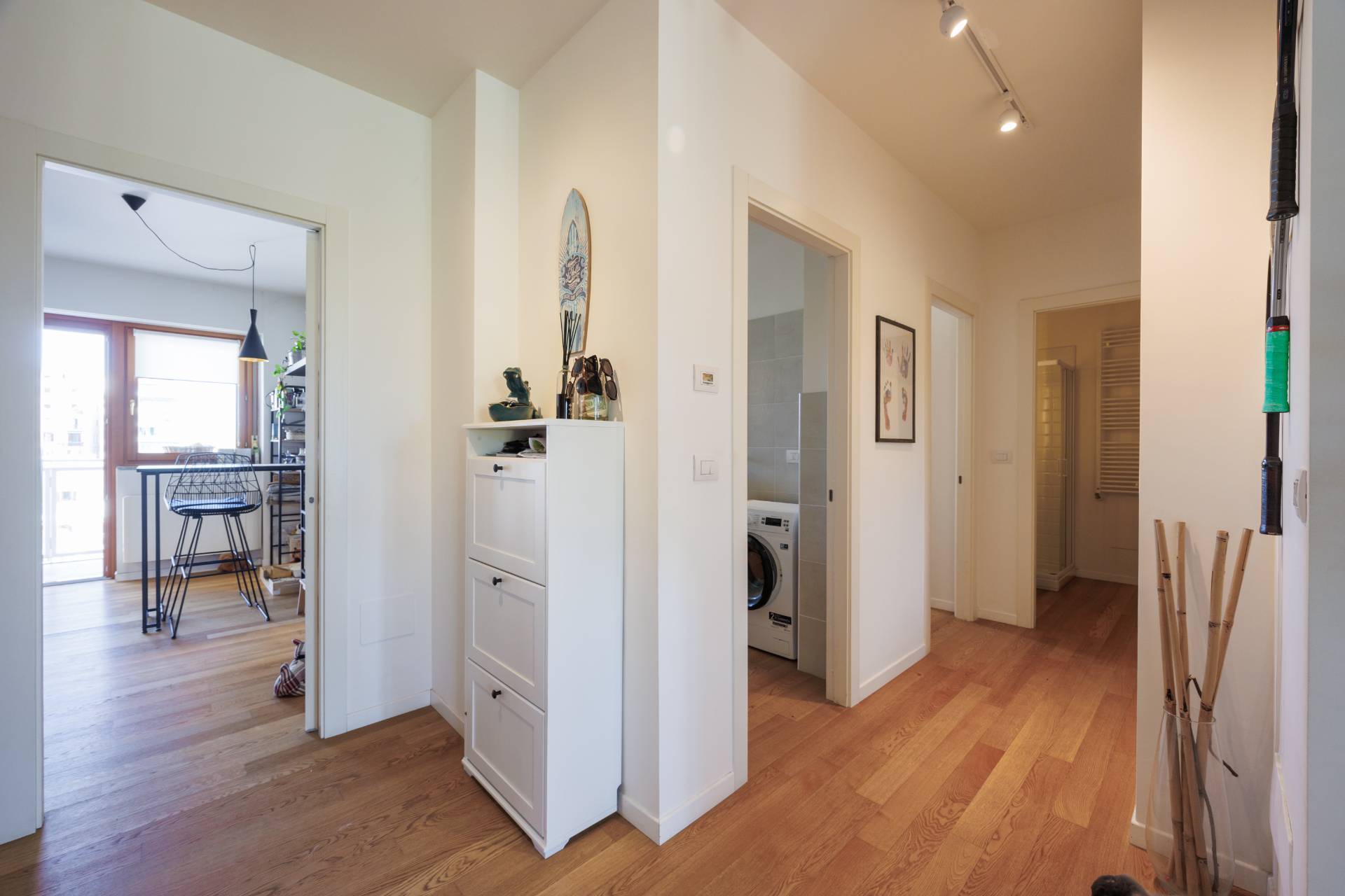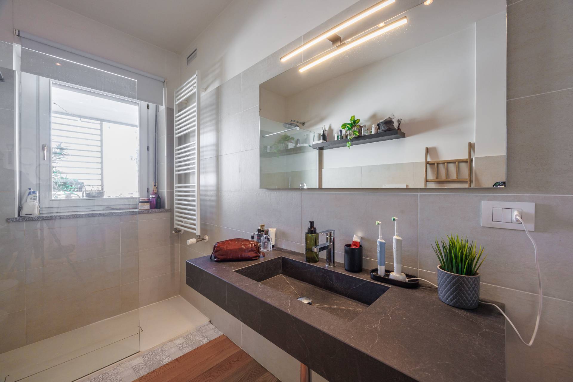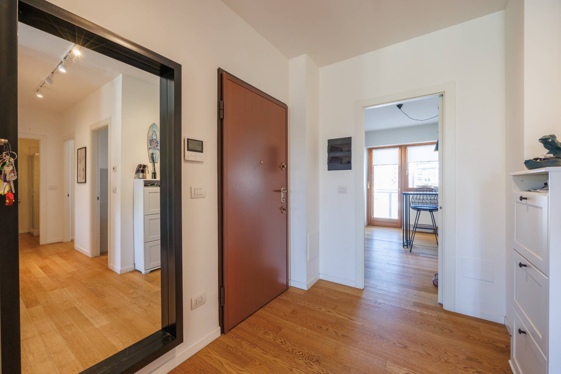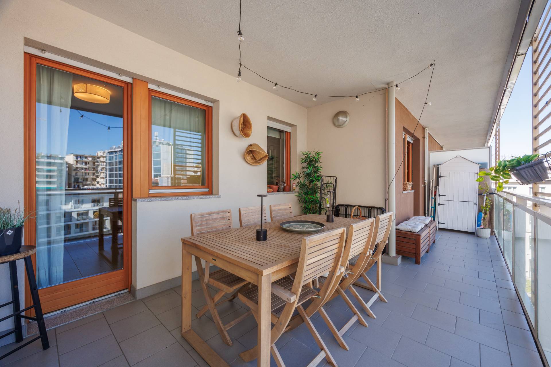 The entrance opens into a spacious, bright, and modern living area, featuring large windows that open to a wonderful terrace that provides natural light throughout the day. The eat-in kitchen is separate and well-organized, with access to a second terrace overlooking the internal courtyard. The sleeping area consists of two bedrooms, both with access to the terraces, and two bathrooms. The property enjoys double exposure.