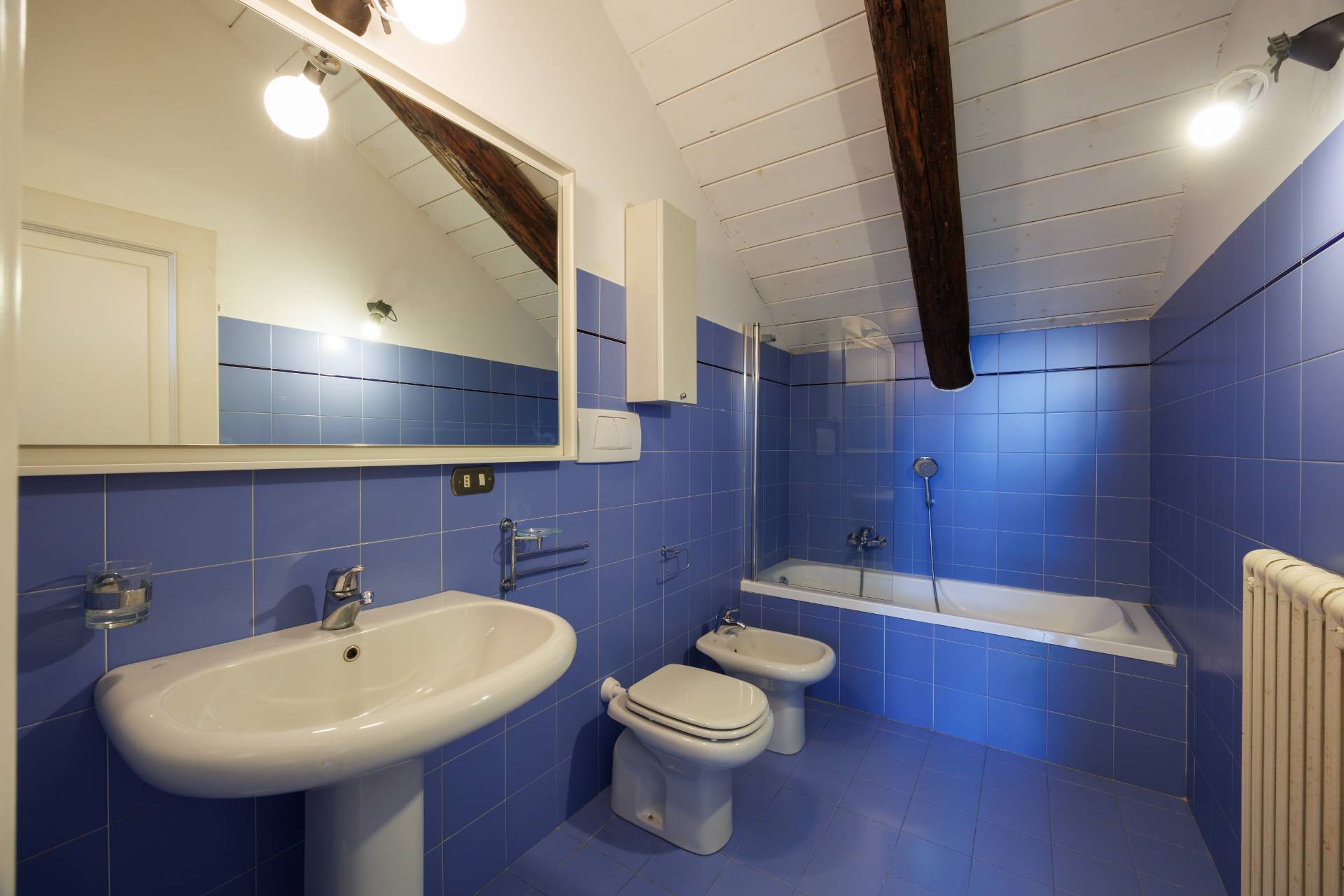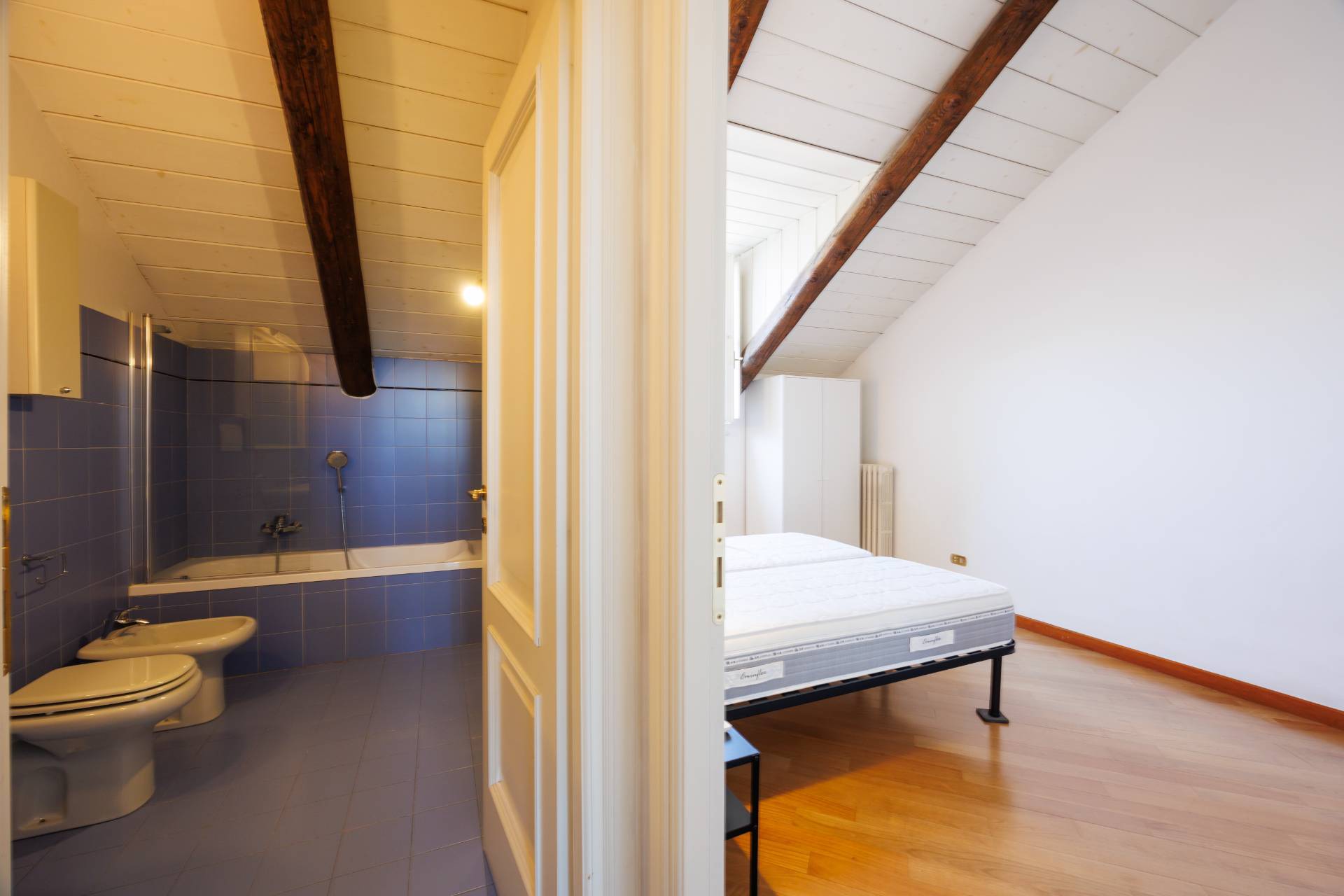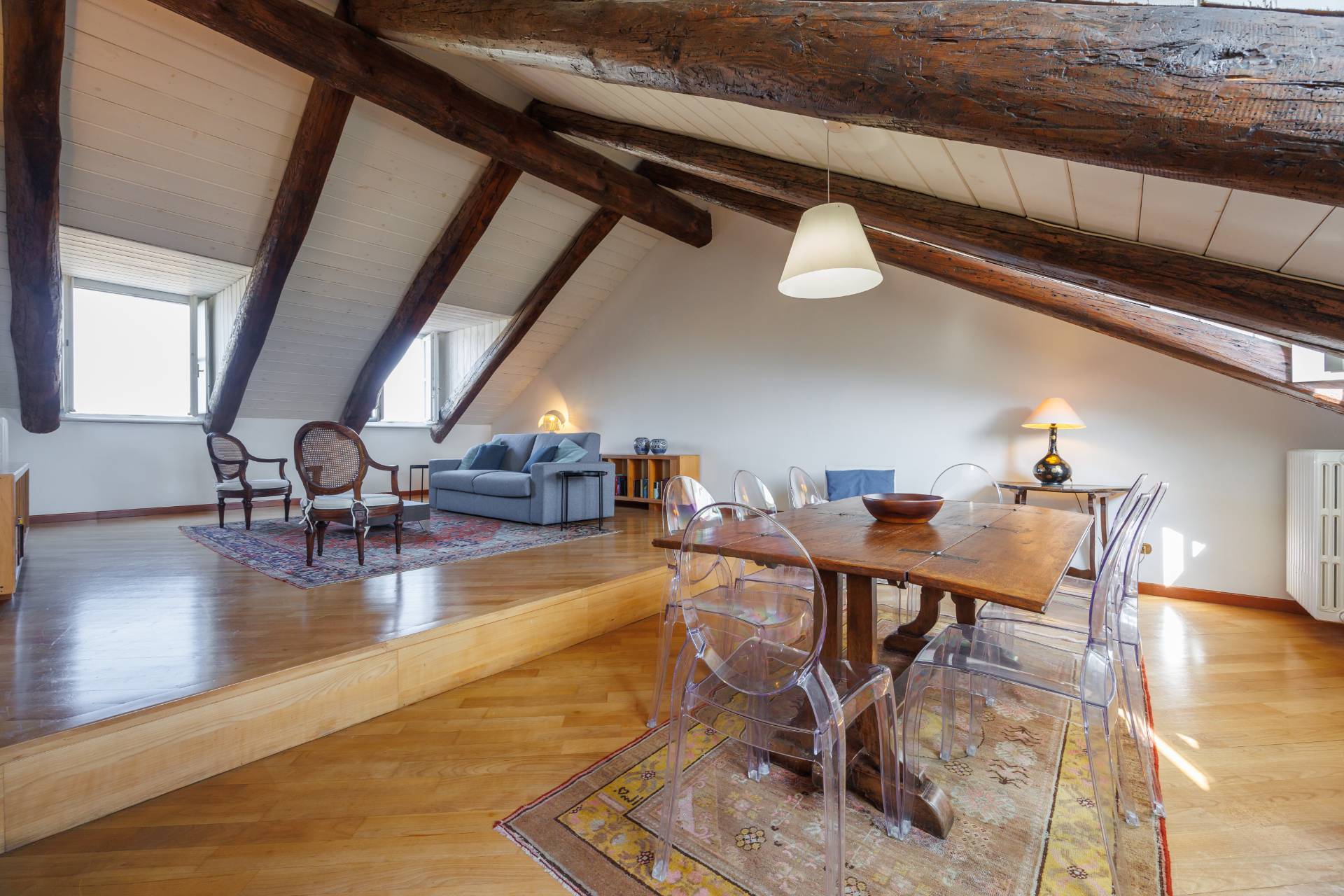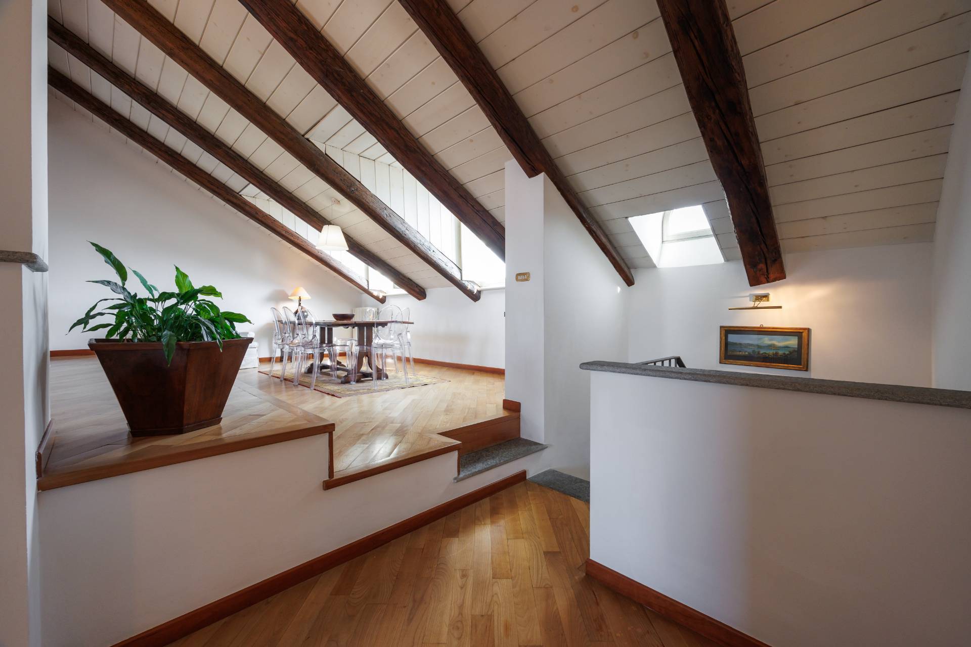 Il livello superiore, mansardato con altezze generose, ospita un magnifico salone di circa 55 mq, impreziosito da una doppia vista straordinaria: da un lato Palazzo Carignano, dall'altro la Mole Antonelliana. Completano il piano una cucina abitabile, una camera da letto e un bagno, per ulteriori 120 mq circa.