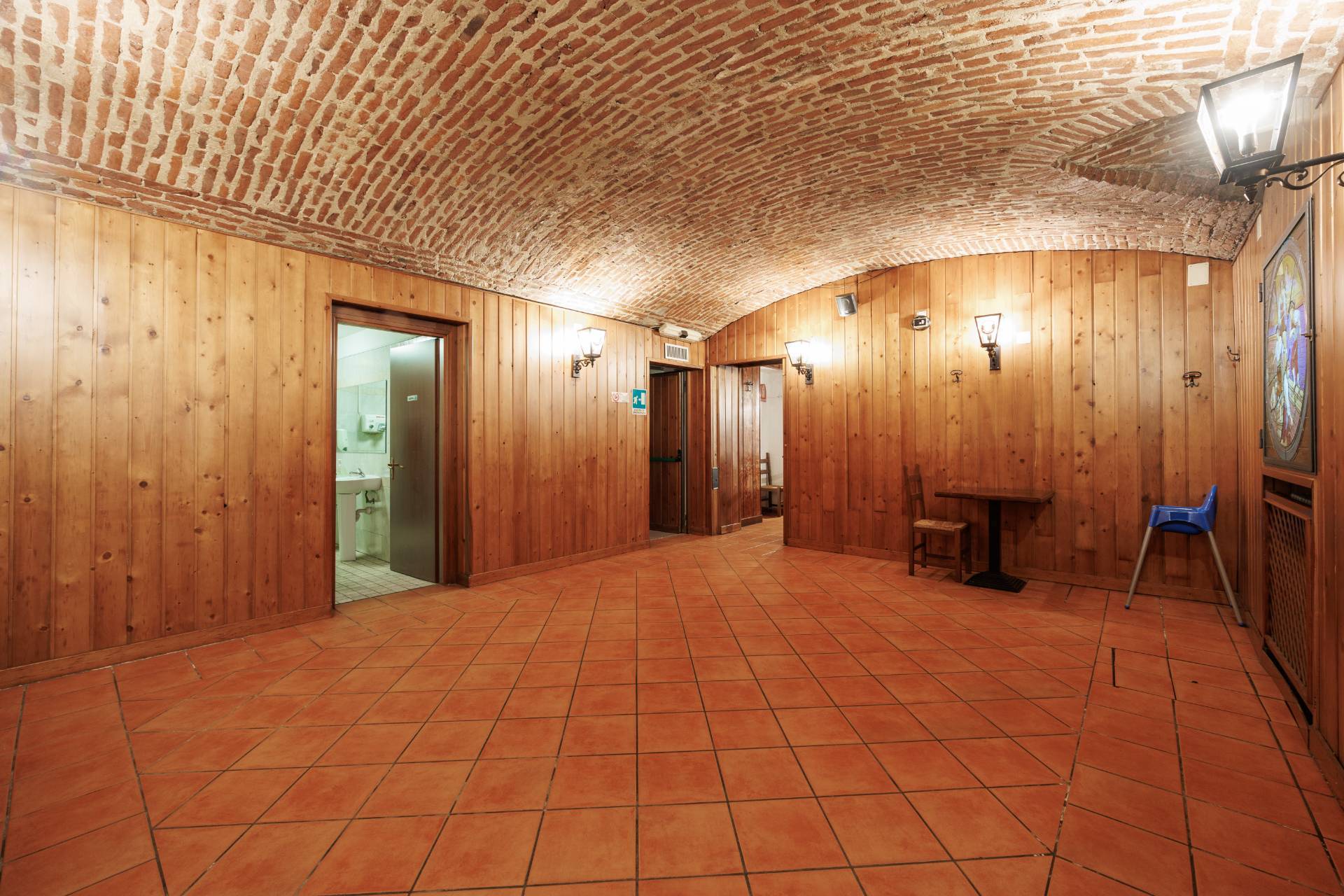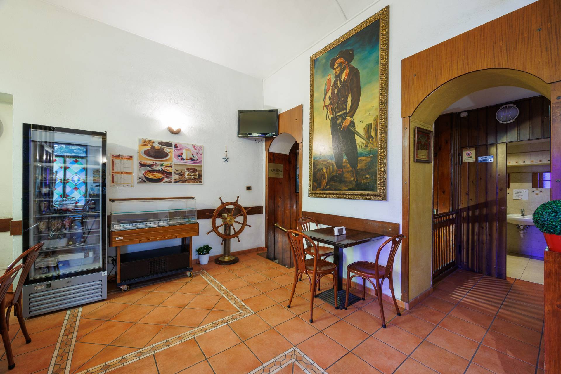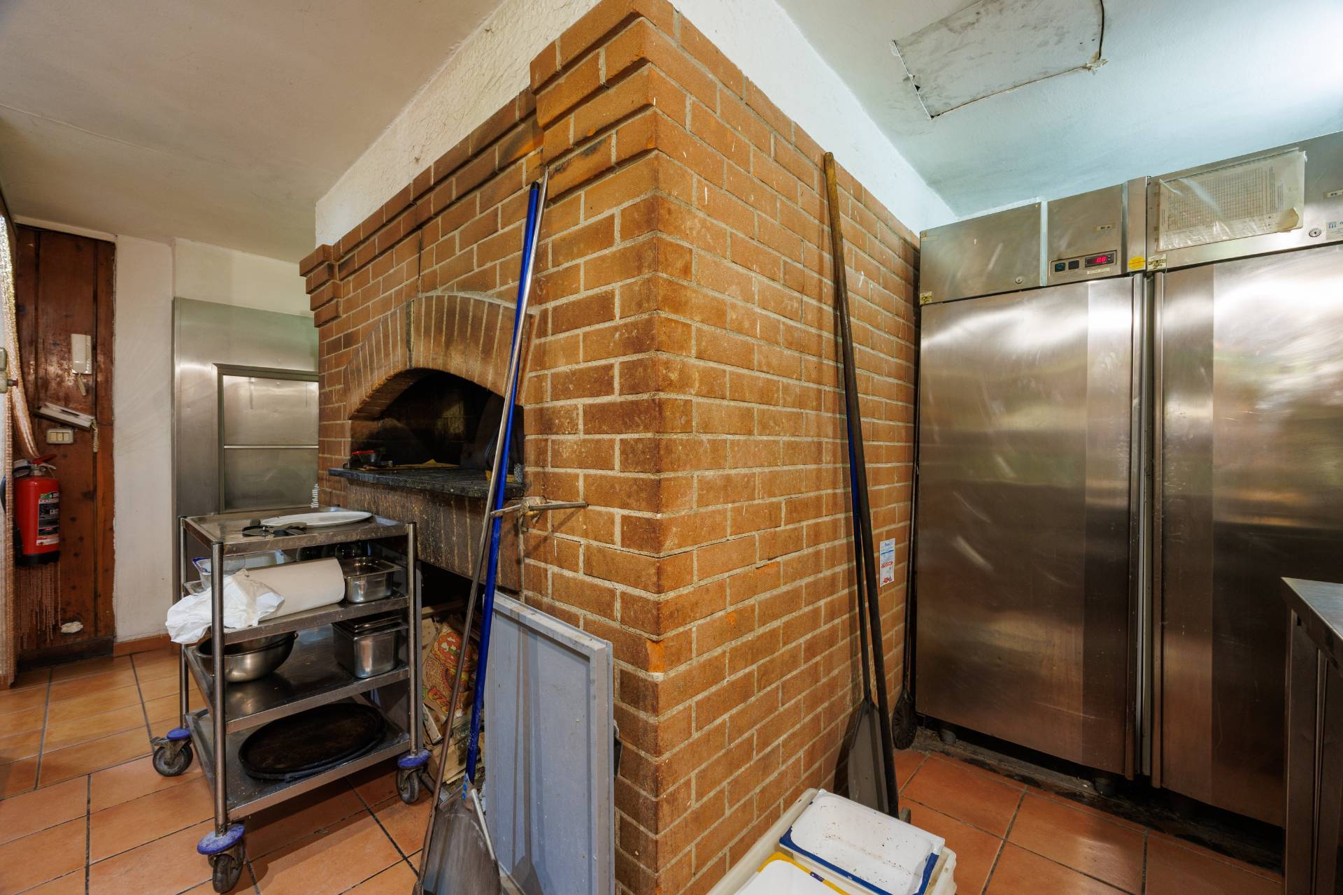Al piano terra si trova un'ampia sala di somministrazione con bancone bar, ingresso su strada, servizi per i clienti e locale retro con aspirazione forzata. Al piano interrato sono presenti cucina attrezzata, forno a legna, deposito, legnaia, servizi per il personale e una seconda sala di somministrazione.