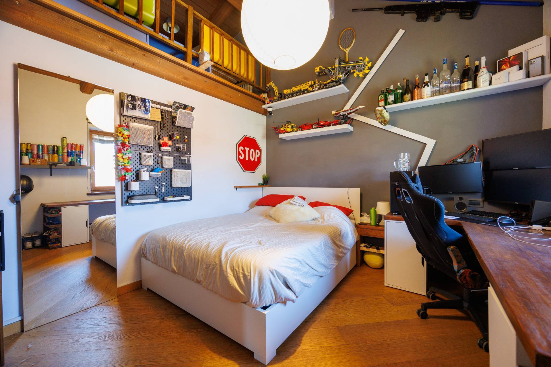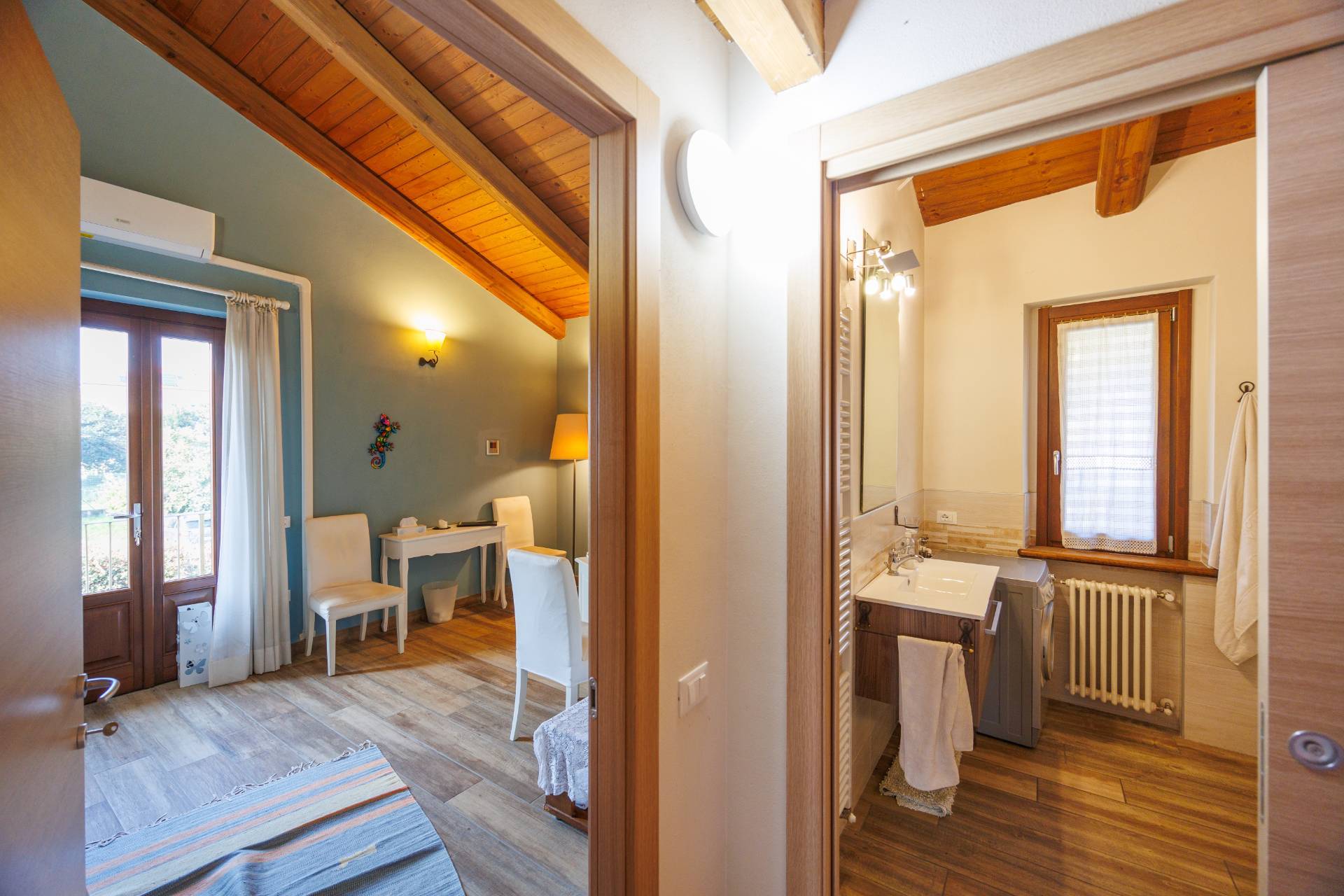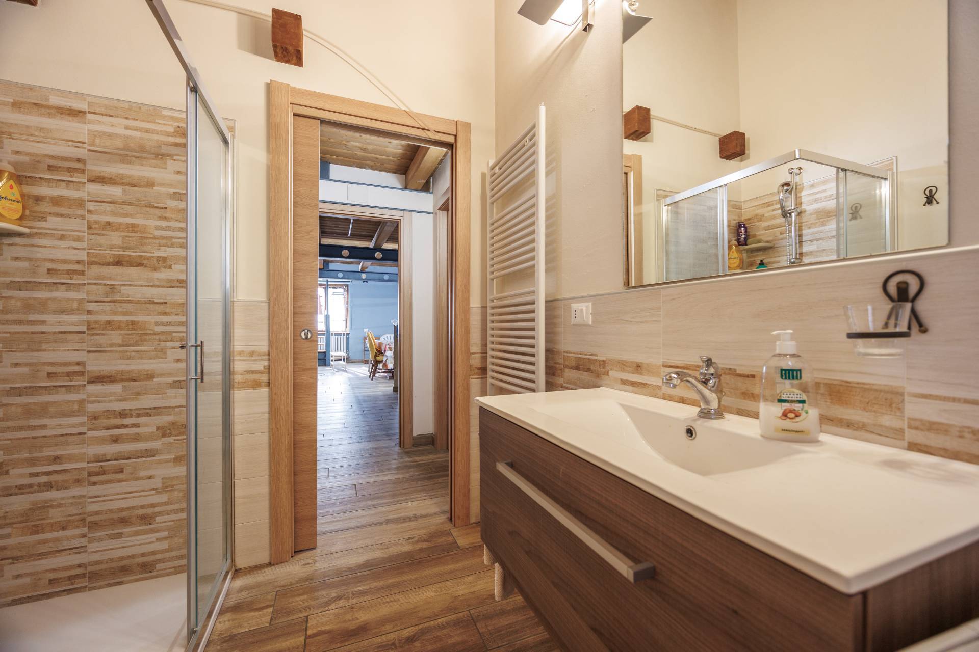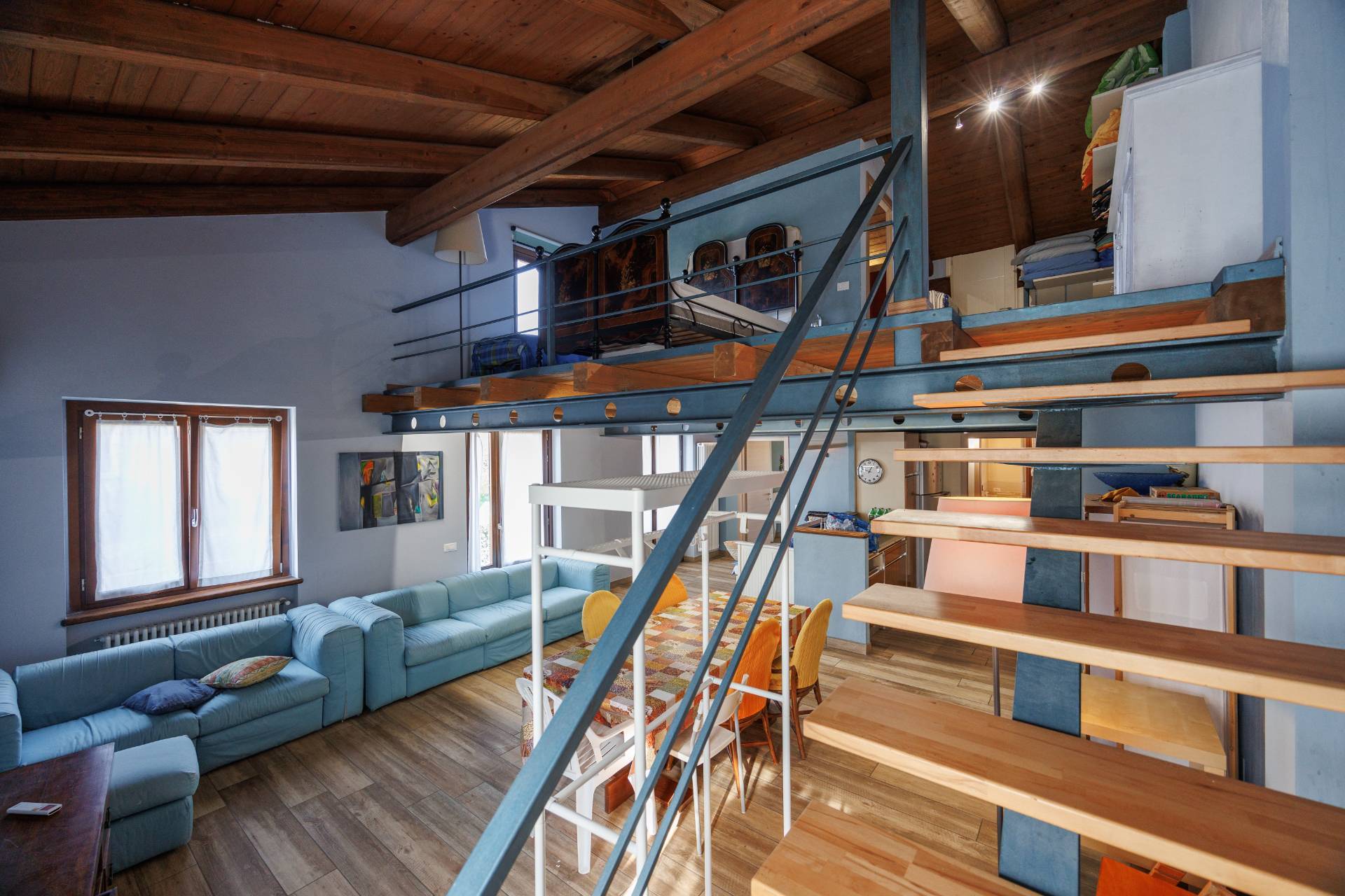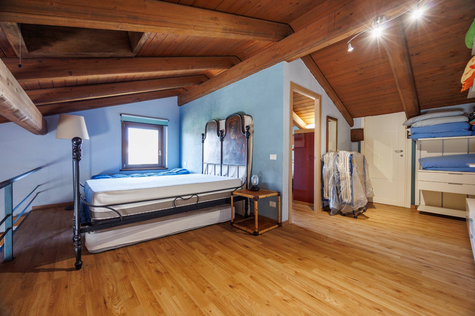 -al primo piano è presente un alloggio indipendente, composto da salone con cucina a vista, camera da letto, bagno e tramite una comoda scala raggiungiamo il soppalco comprensivo di una camera da letto e zona giorno.