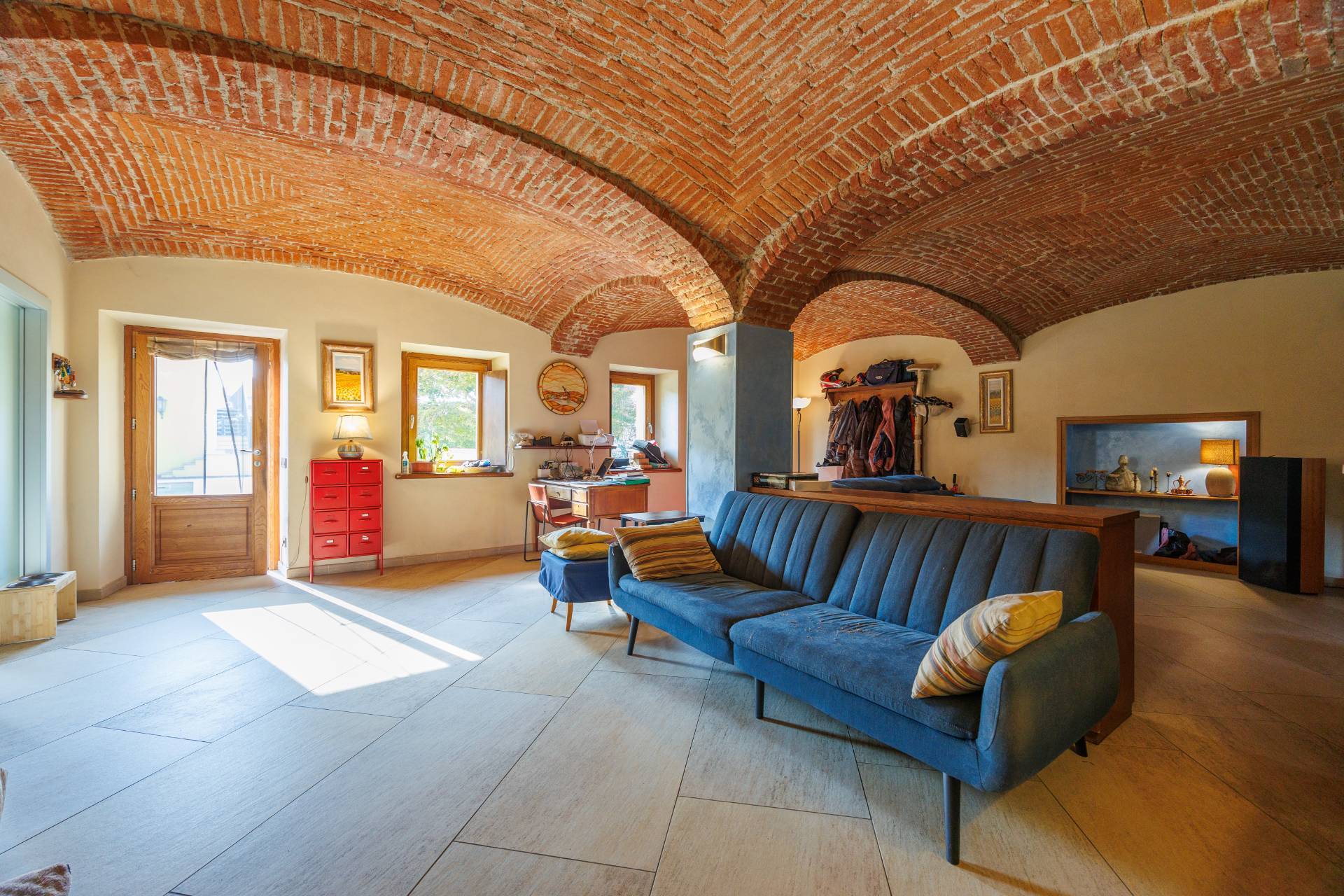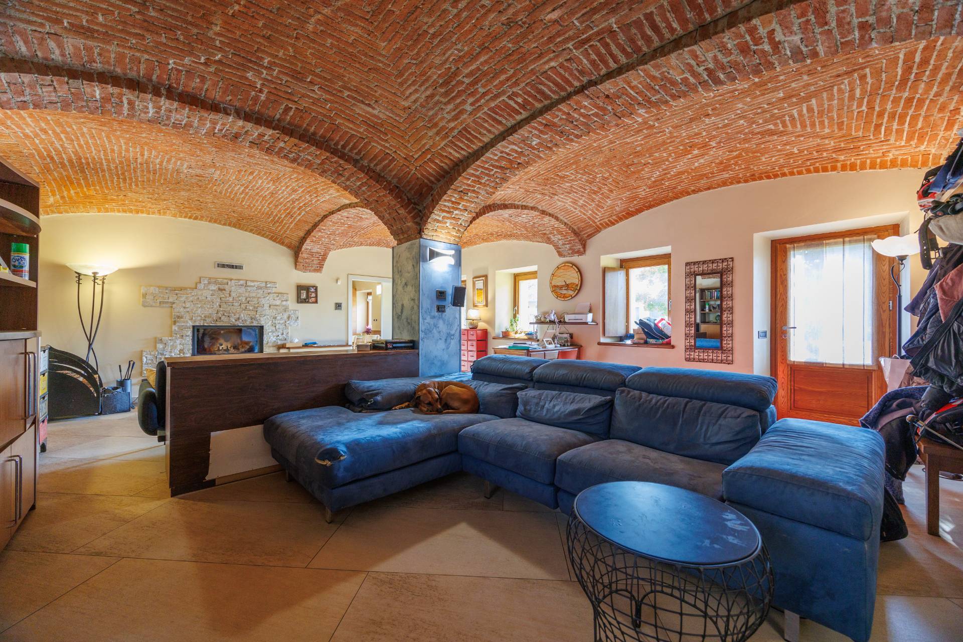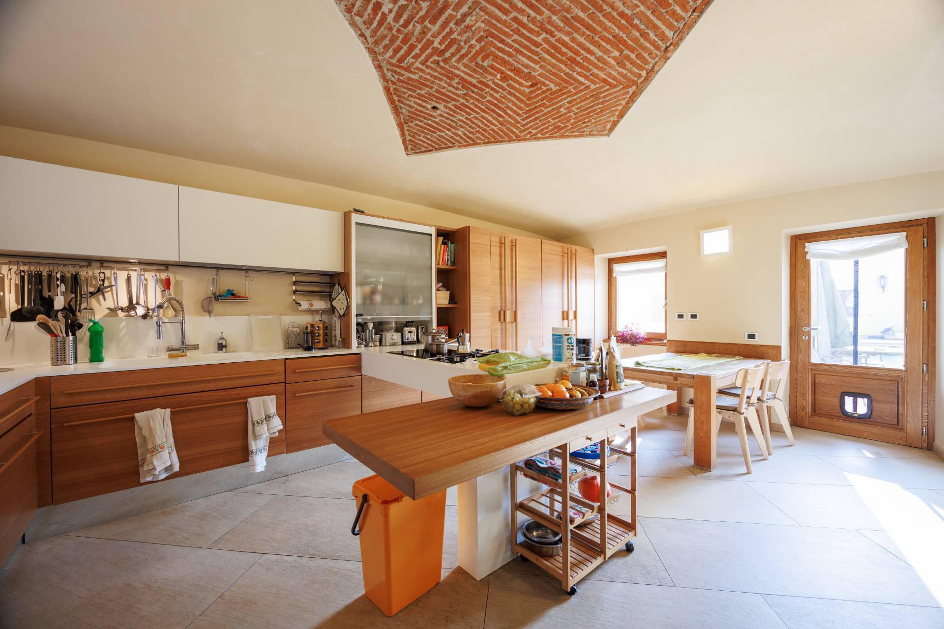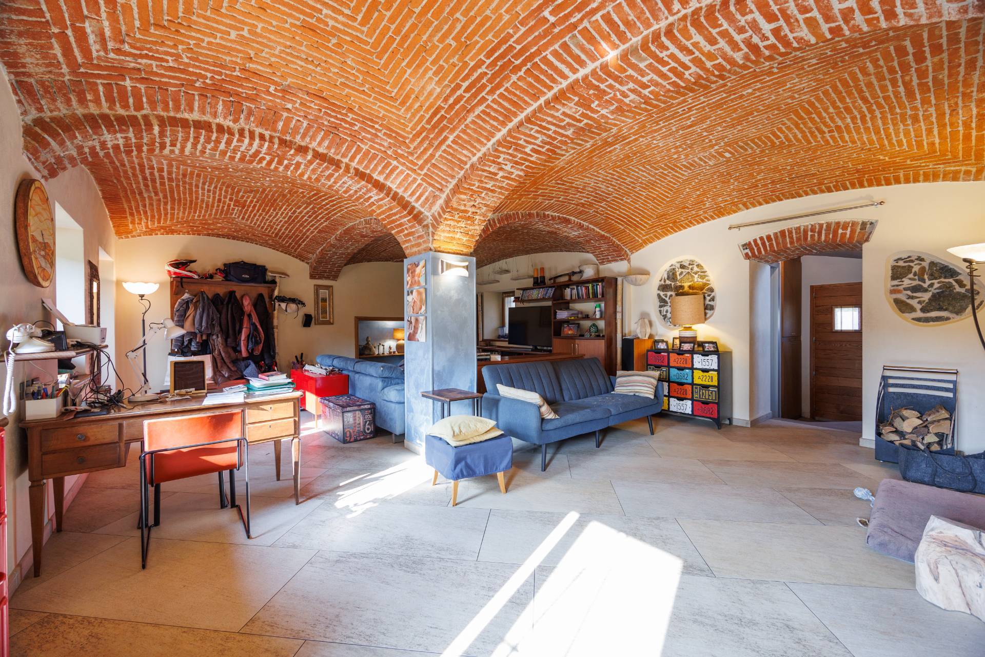 -al piano terra l'ingresso si affaccia sulla zona giorno composta da grande salone con soffitto con volte a botte e mattoni a vista, camino, una grande cucina abitabile con penisola all'americana e accesso diretto al giardino privato, oltre ad un bagno di servizio.