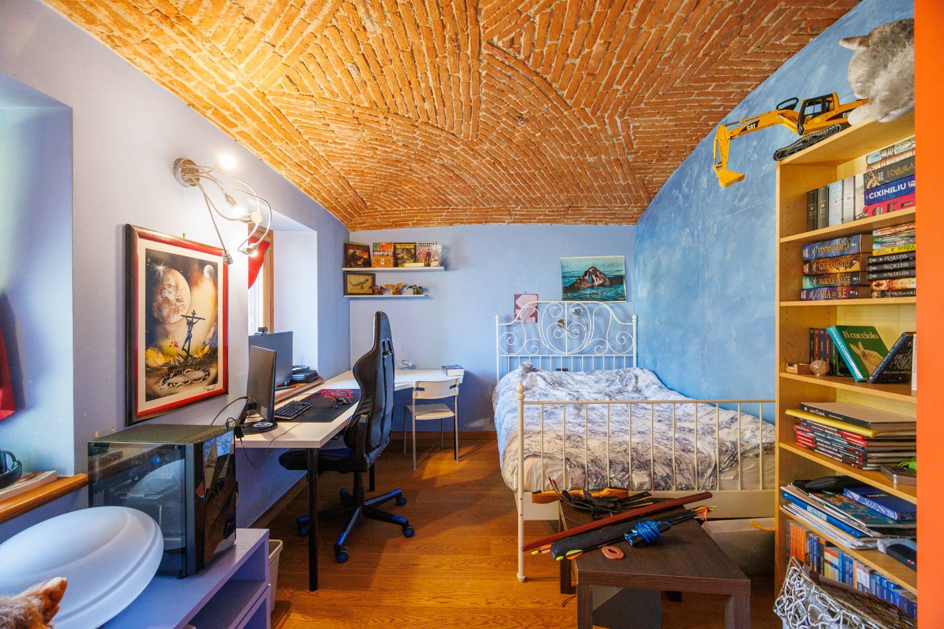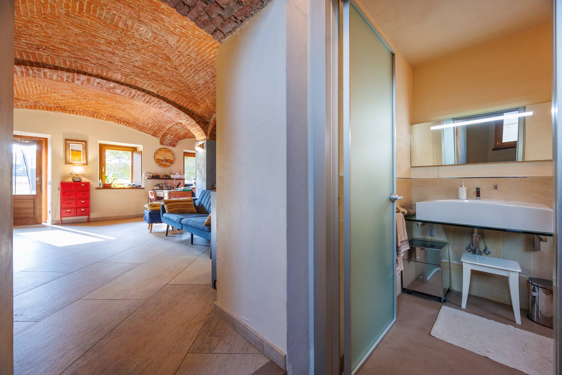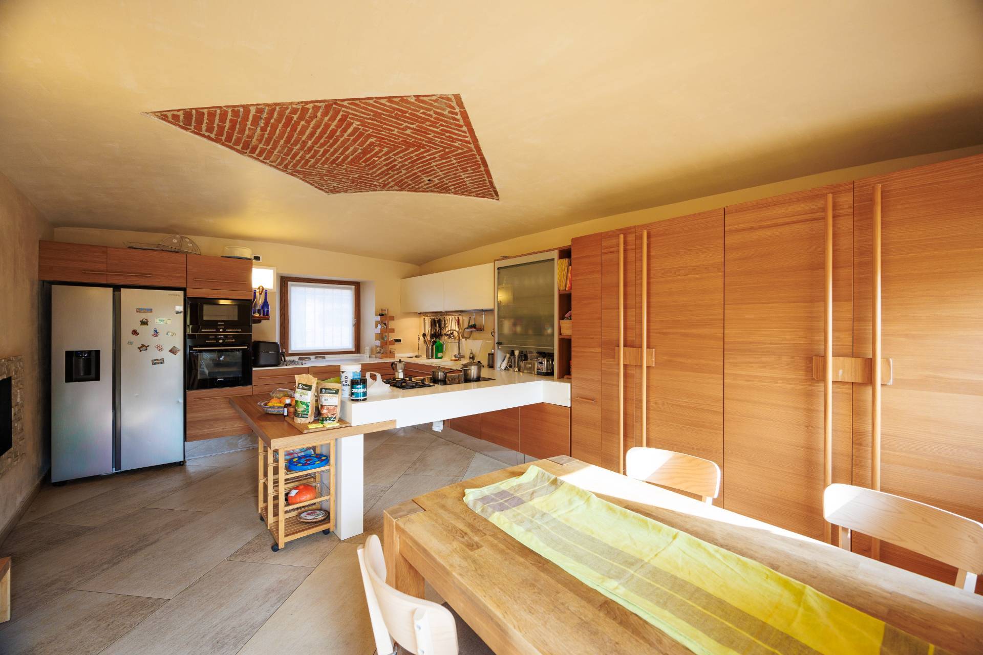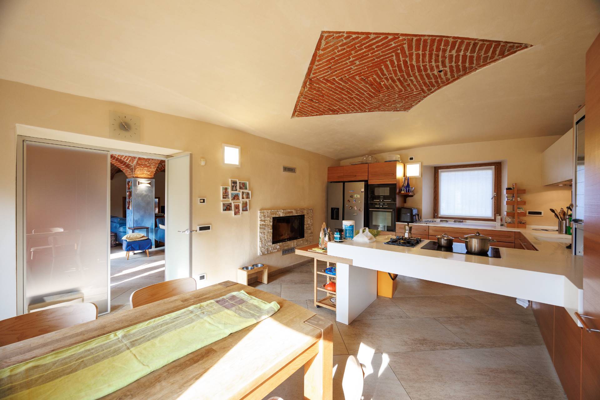 -al piano terra l'ingresso si affaccia sulla zona giorno composta da grande salone con soffitto con volte a botte e mattoni a vista, camino, una grande cucina abitabile con penisola all'americana e accesso diretto al giardino privato, oltre ad un bagno di servizio.