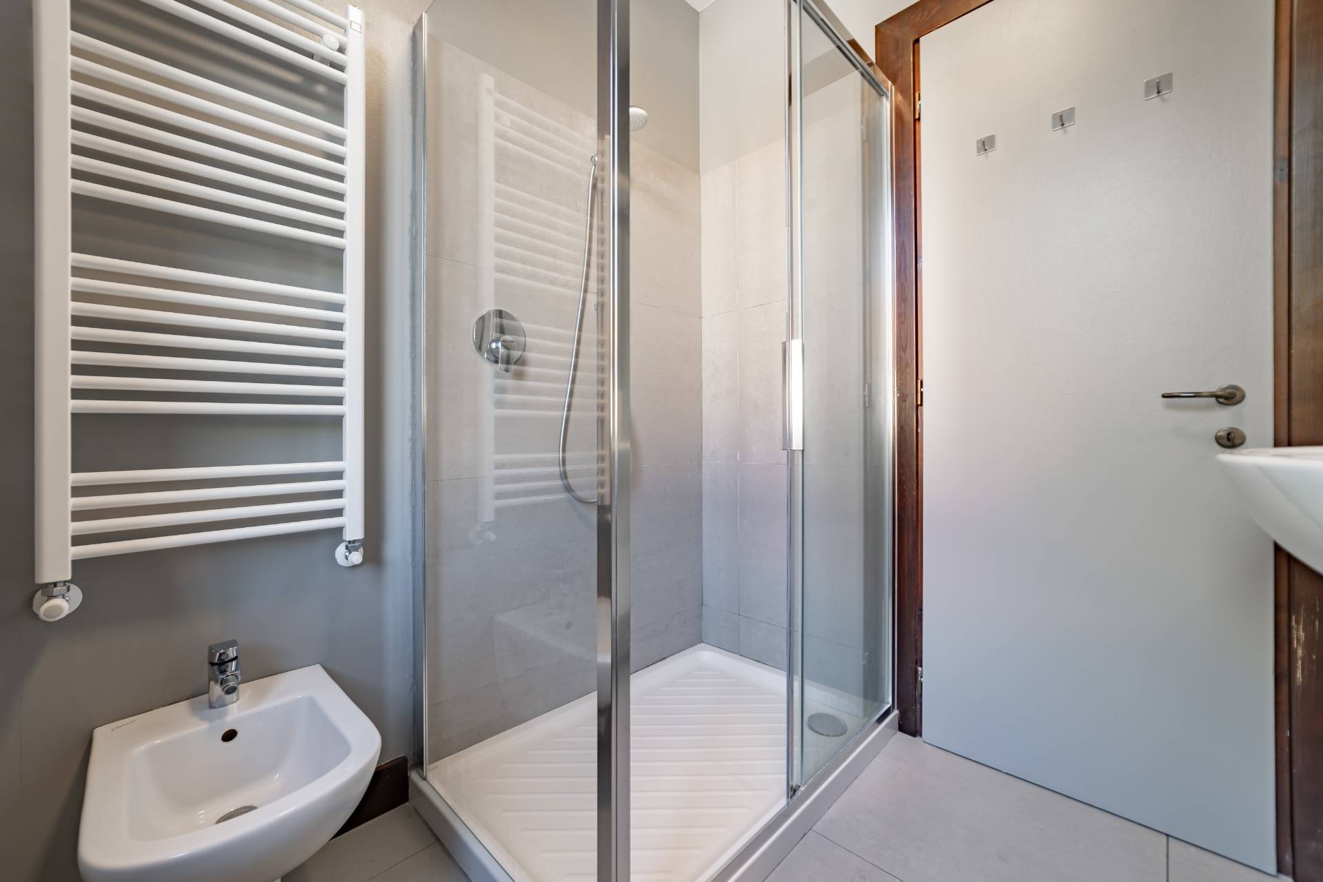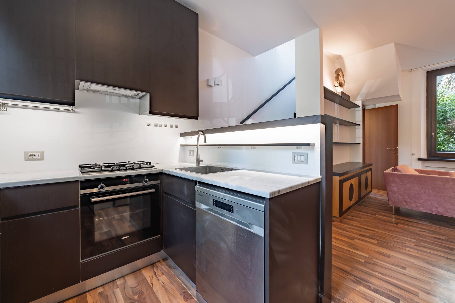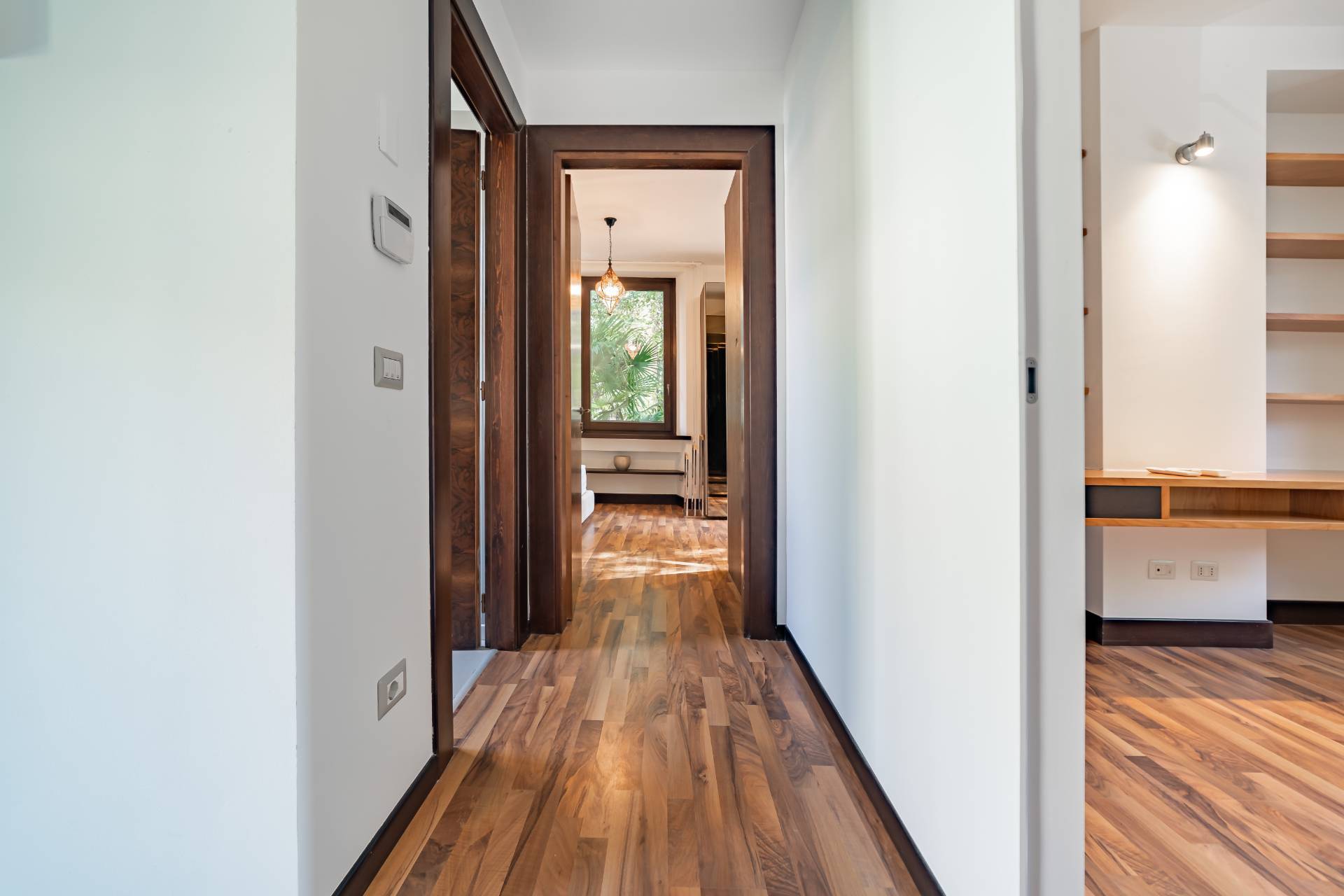 La casa proposta, si sviluppa su tre piani ed è composta da ingresso al piano rialzato, ampio soggiorno con cucina all'americana e uscita sul giardino, al primo piano ci sono due camere di cui una con terrazzo e cabina armadio, servizio e mansarda, al piano seminterrato invece, una grande taverna con camino, zona armadi, lavanderia e servizio.
