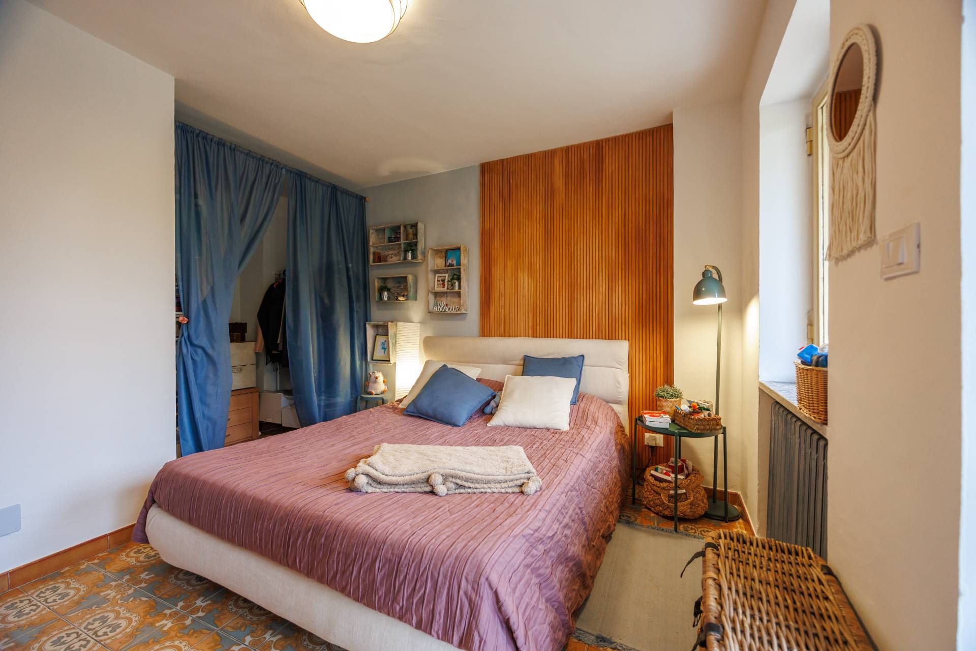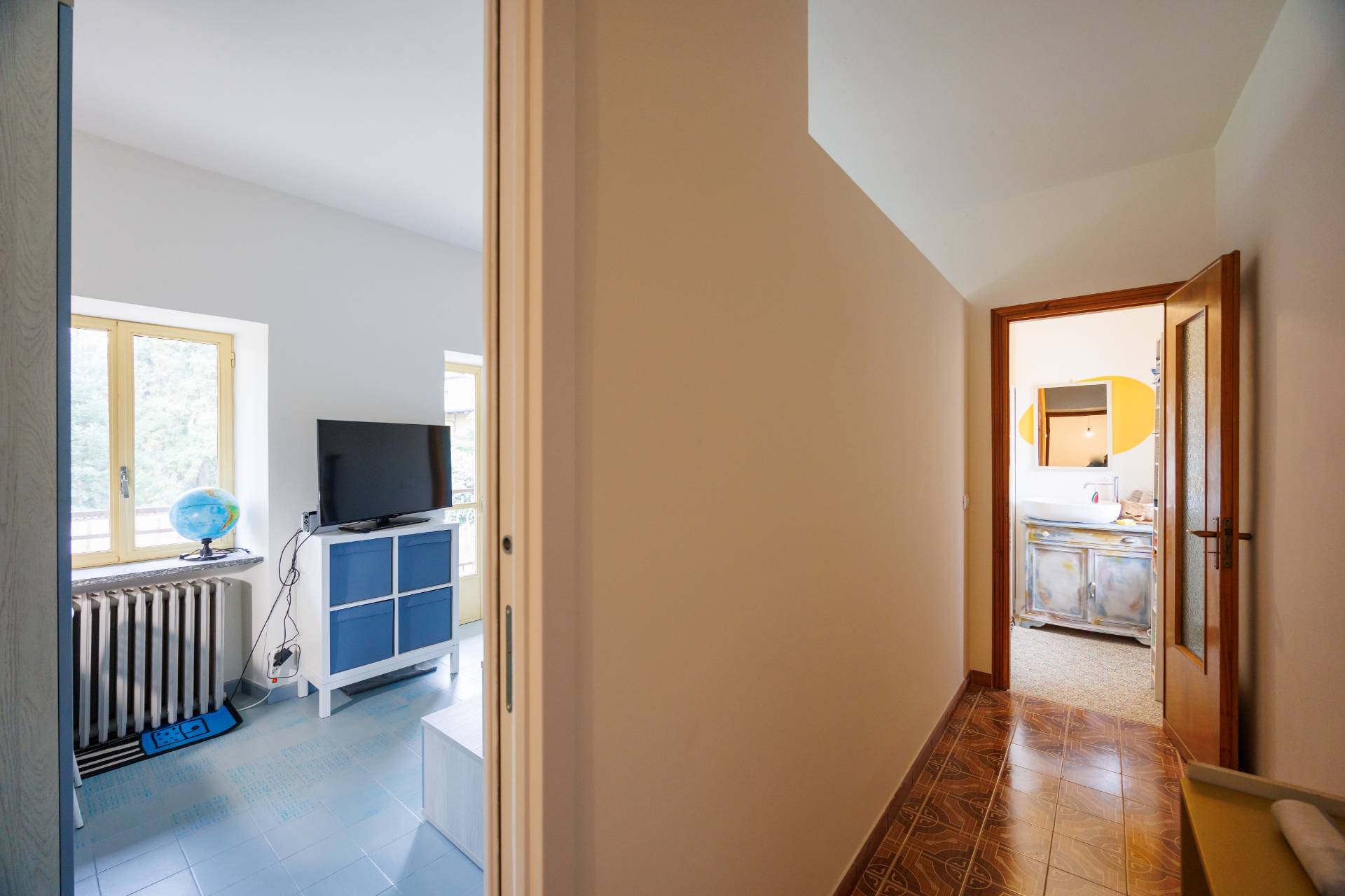 La seconda parte della proprietà anch'essa con ingresso su disimpegno e scala, offre sulla destra un locale di circa 20mq collegabile al salone dell'altra unità, un ripostiglio e, al piano superiore, una camera con terrazzino annesso.