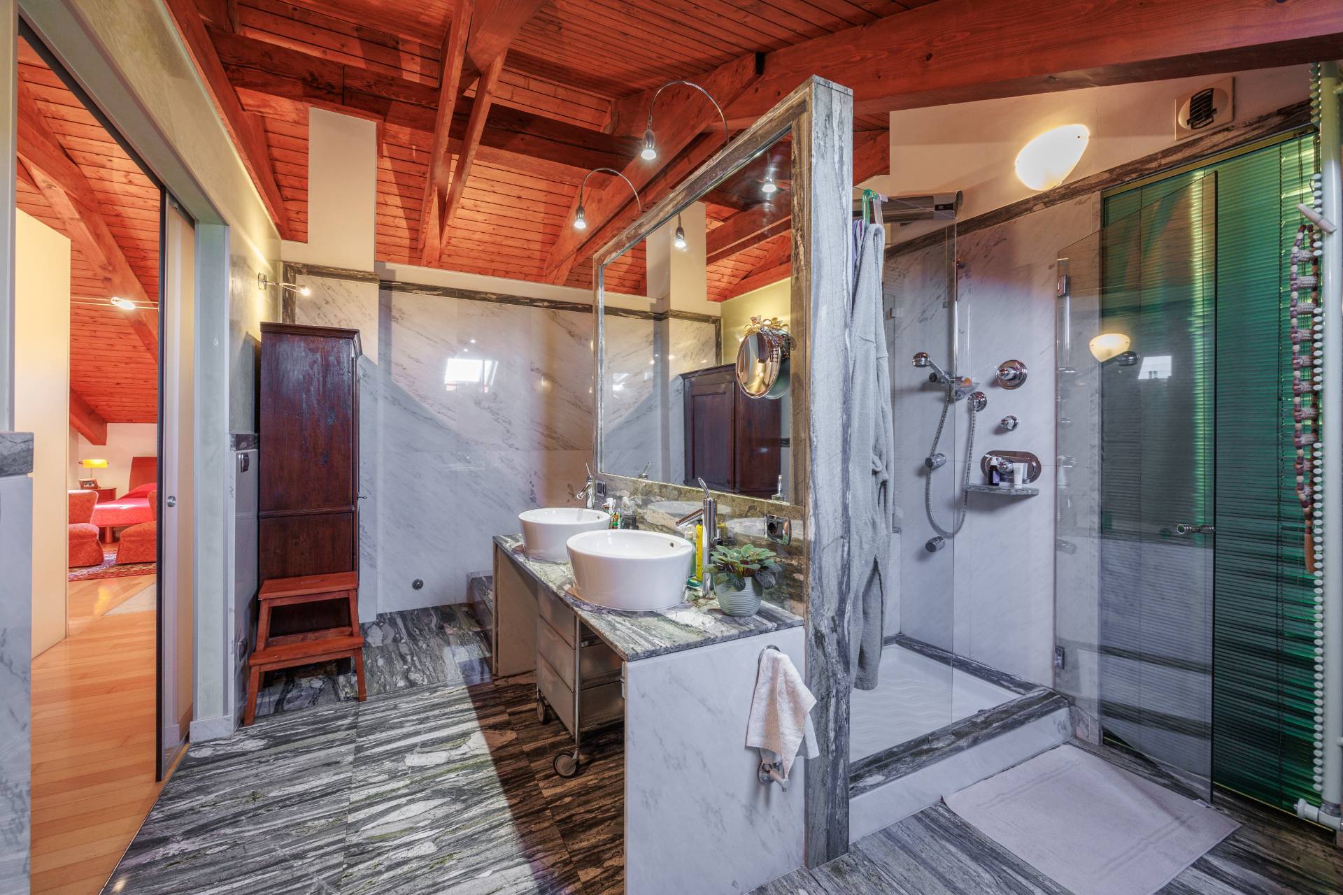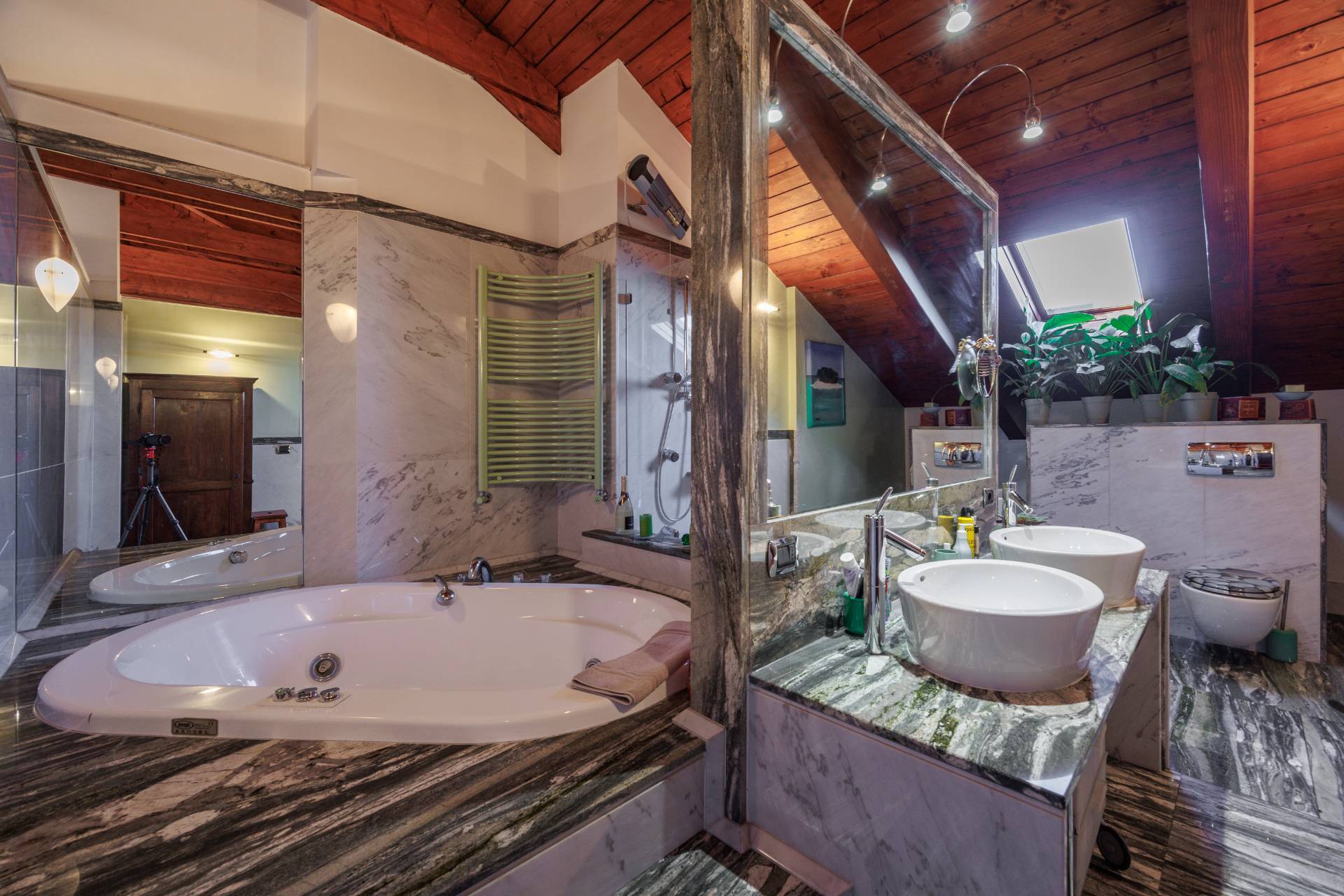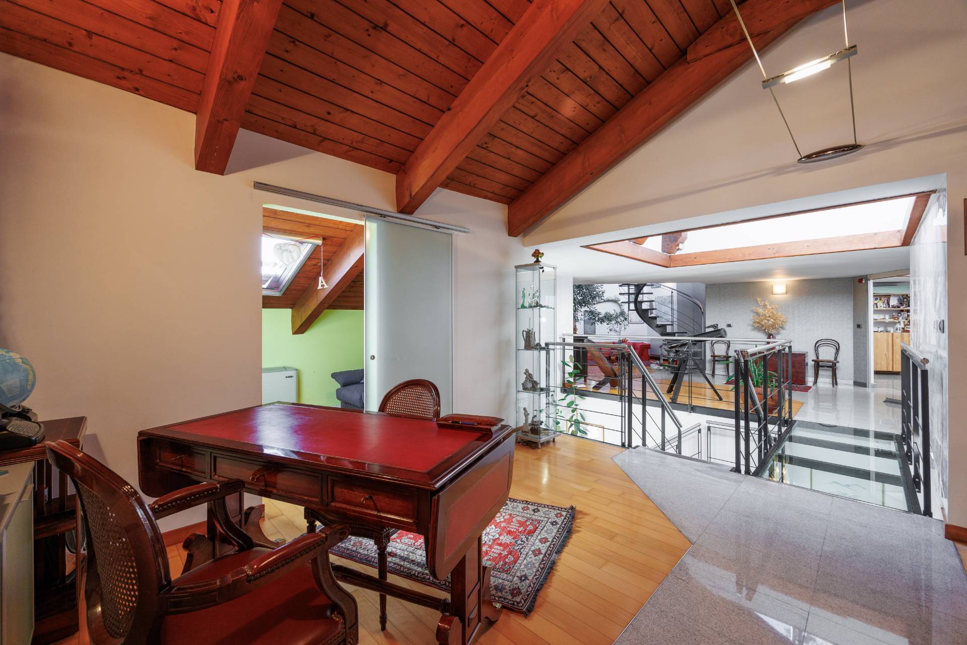 Una moderna scala interna conduce al piano superiore, dotato anche di ingresso indipendente, dove troviamo due ampie zone studio, una camera padronale con bagno en suite completo di doppi lavabi, vasca Jacuzzi e doccia, una camera singola con bagno privato con doccia. Da una delle zone studio è possibile ricavare una terza camera da letto.