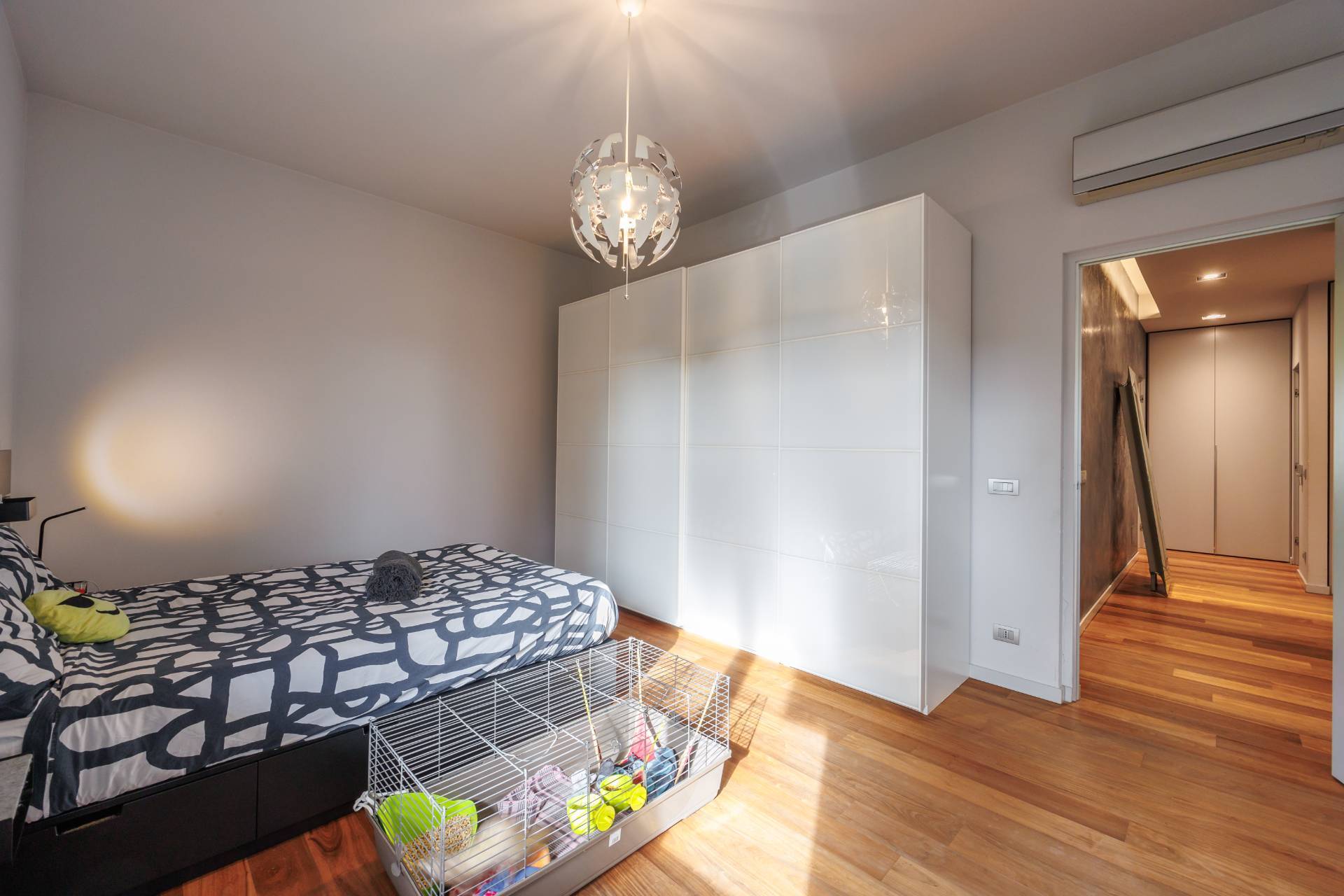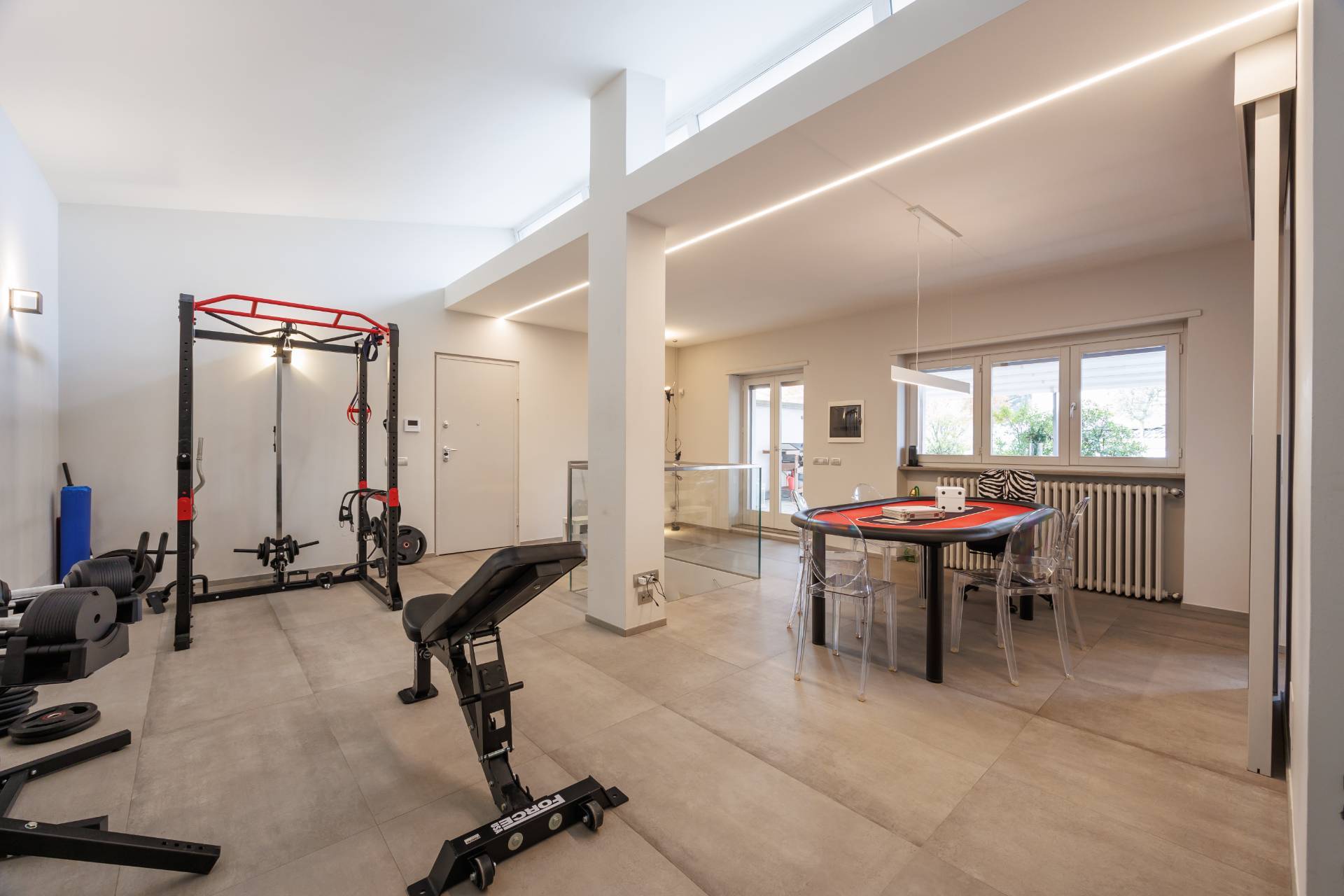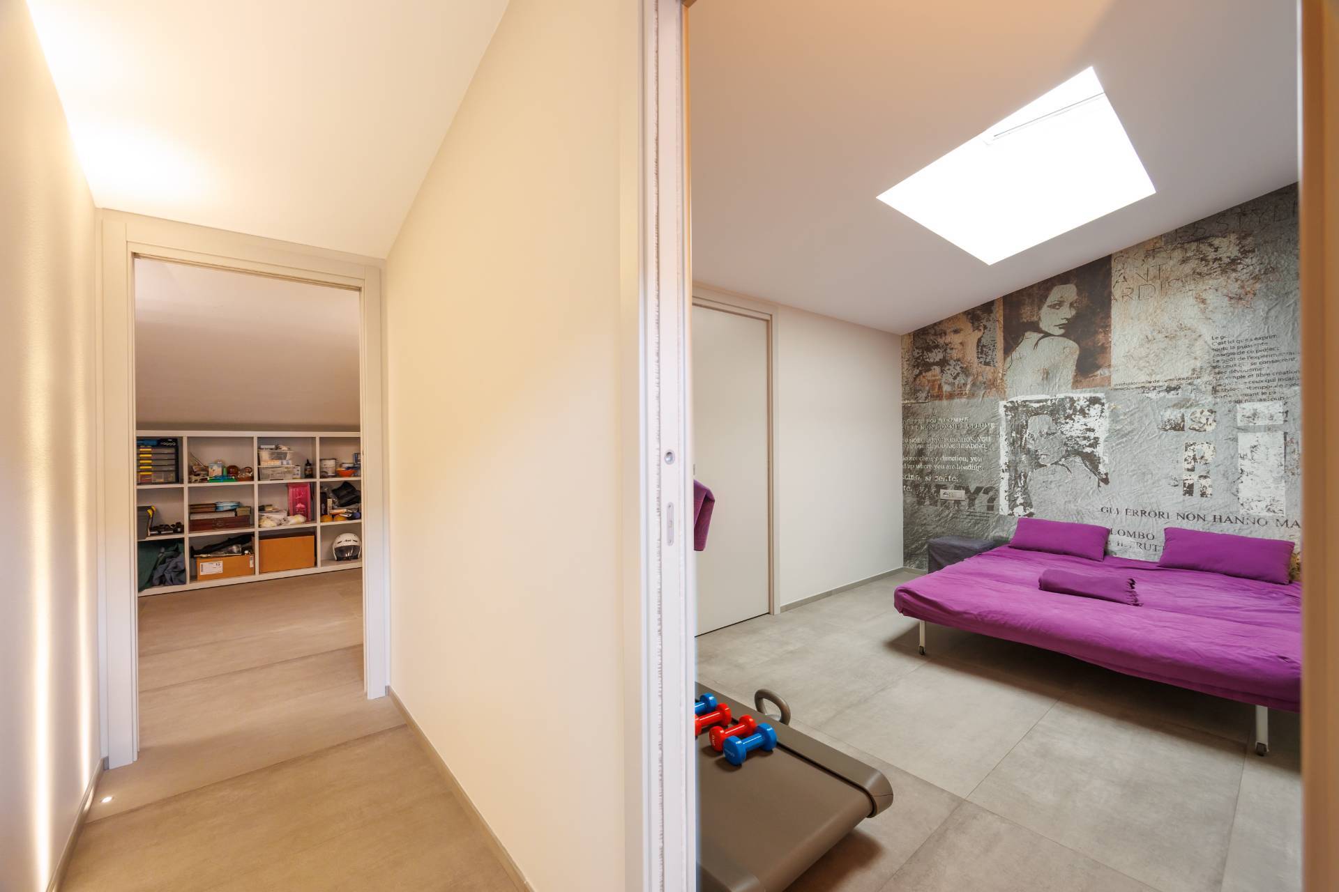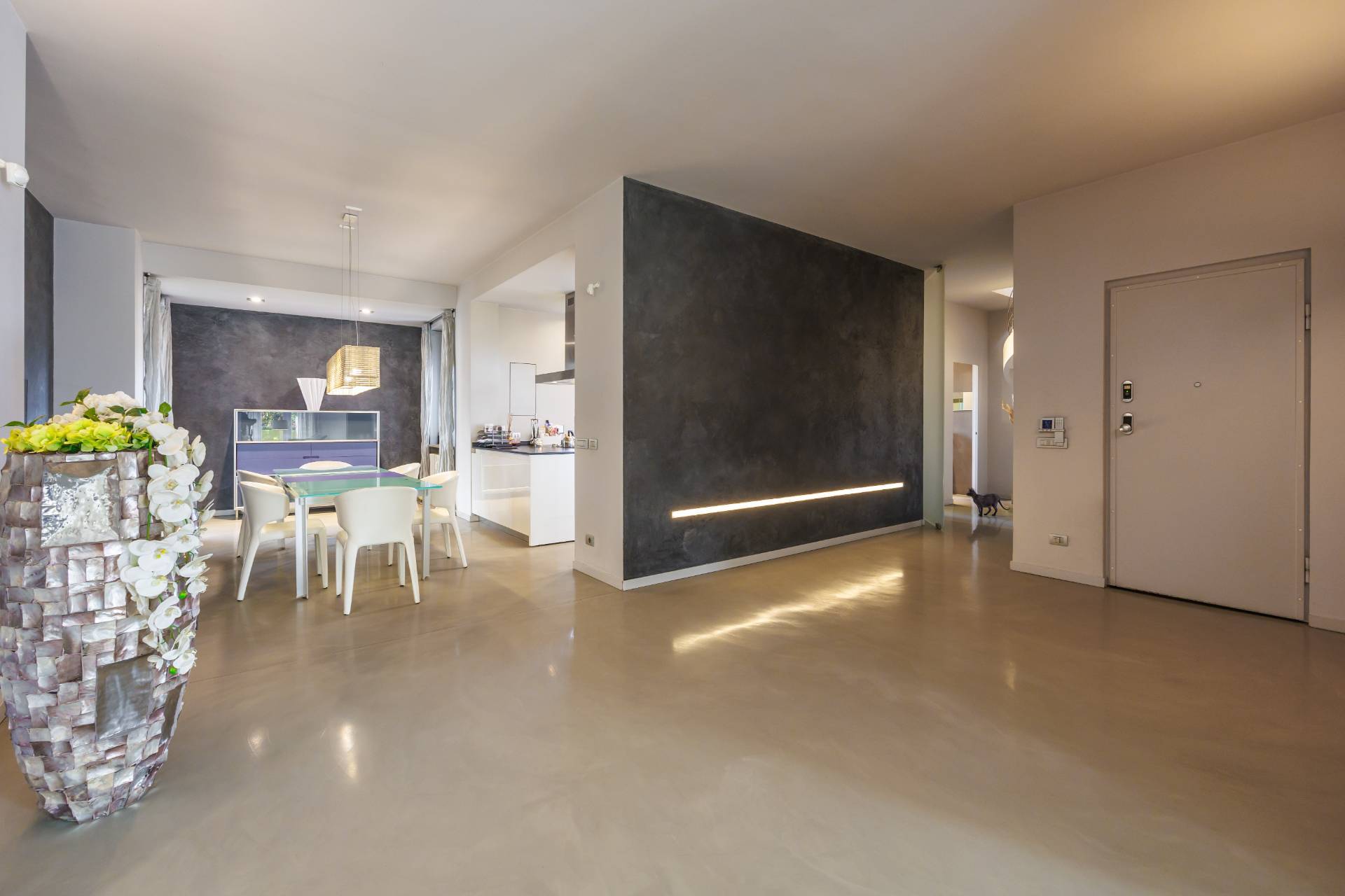 Pavimenti in resina nella zona giorno e parquet nella zona notte, arredi su misura, finiture curate, tecnologie di ultima generazione come impianto antifurto con barriere a infrarossi, porta blindata con ingresso a scheda, tapparelle elettriche con chiusura centralizzata, vetri di sicurezza e impianto di condizionamento.