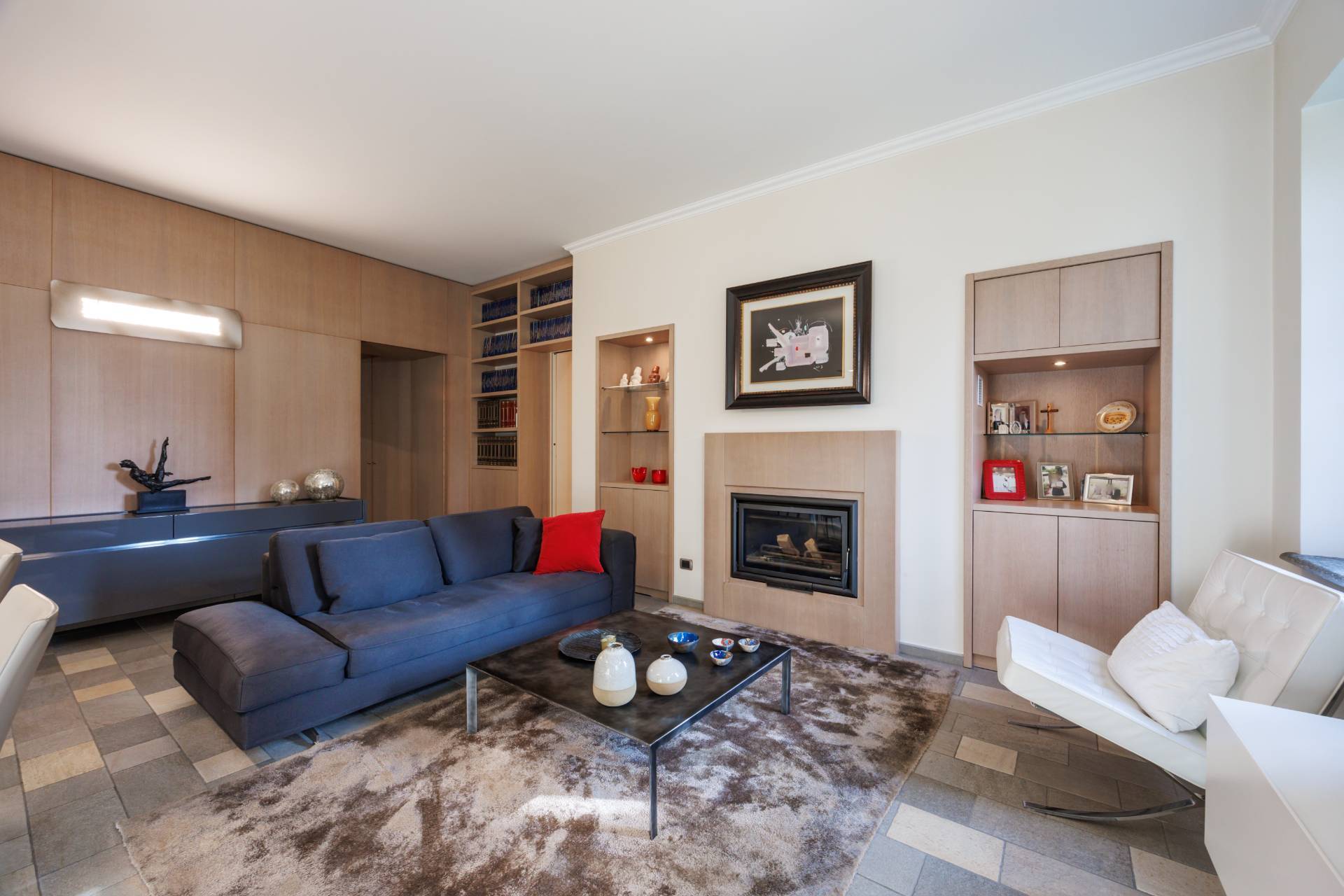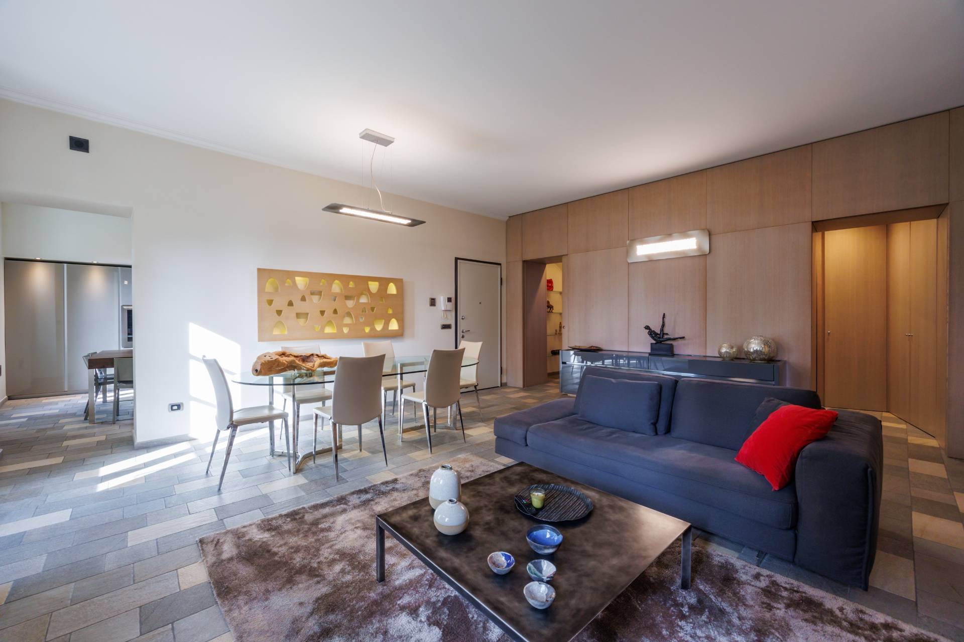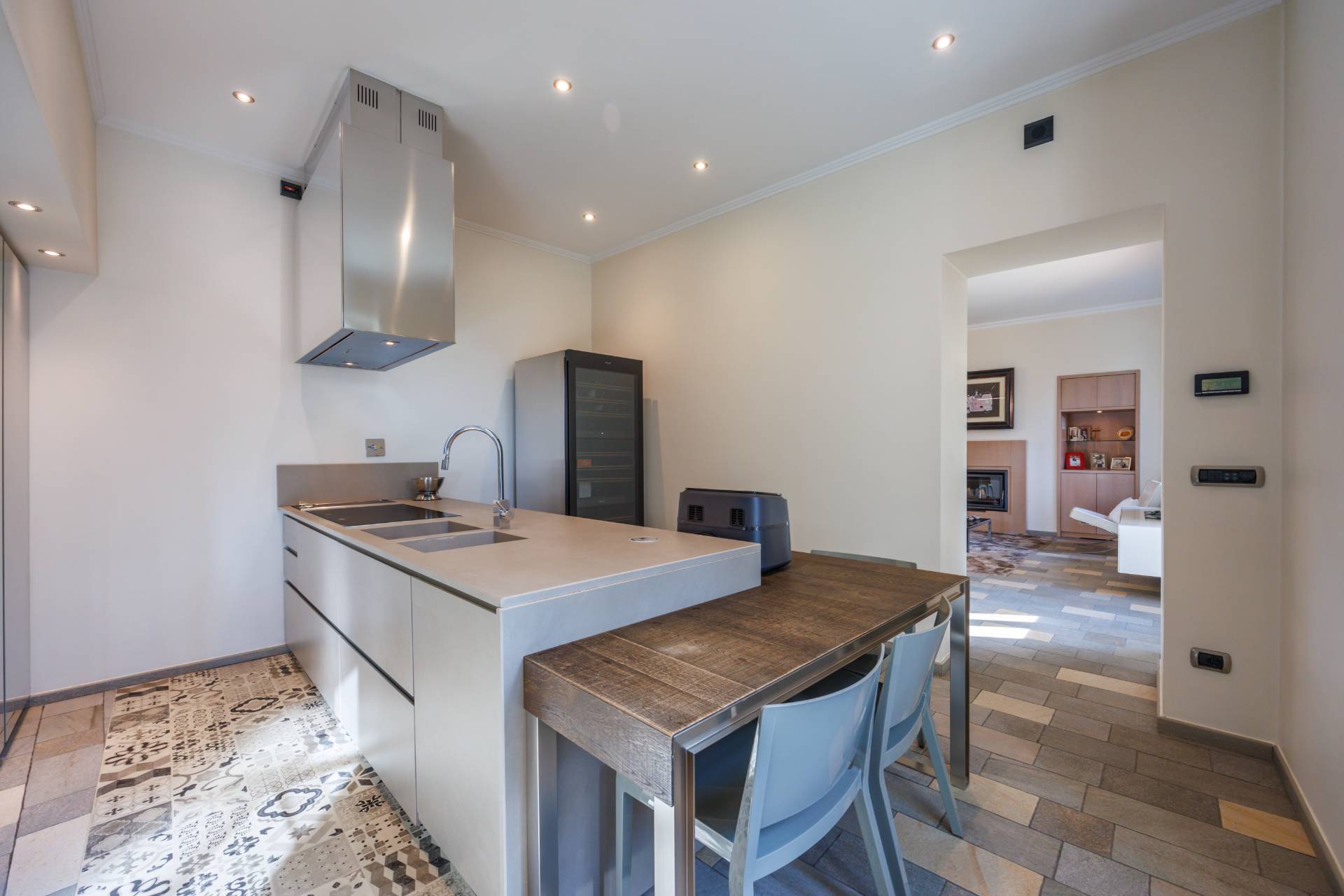 ingresso su zona living con doppio soggiorno, cucina abitabile arredata con cucina su misura ad isola e completa di elettrodomestici di alta gamma, tre camere da letto di cui una con ampia cabina armadio e bagno en suite, due bagni ed una lavanderia.