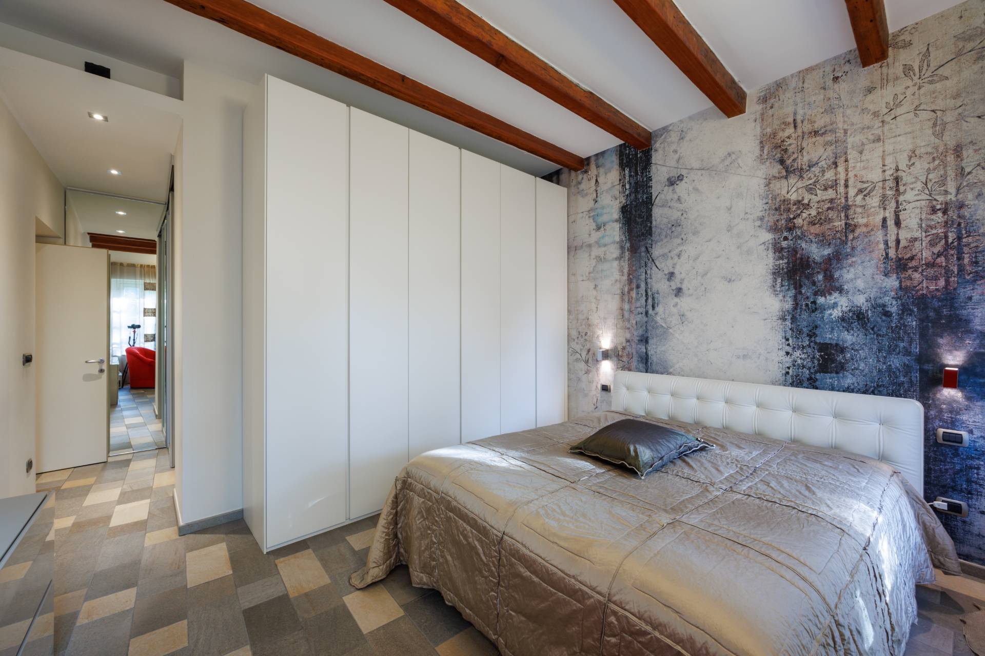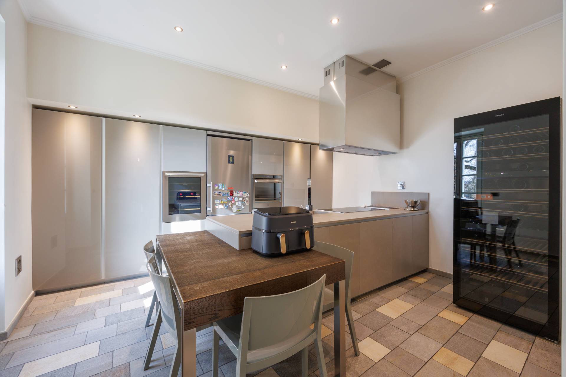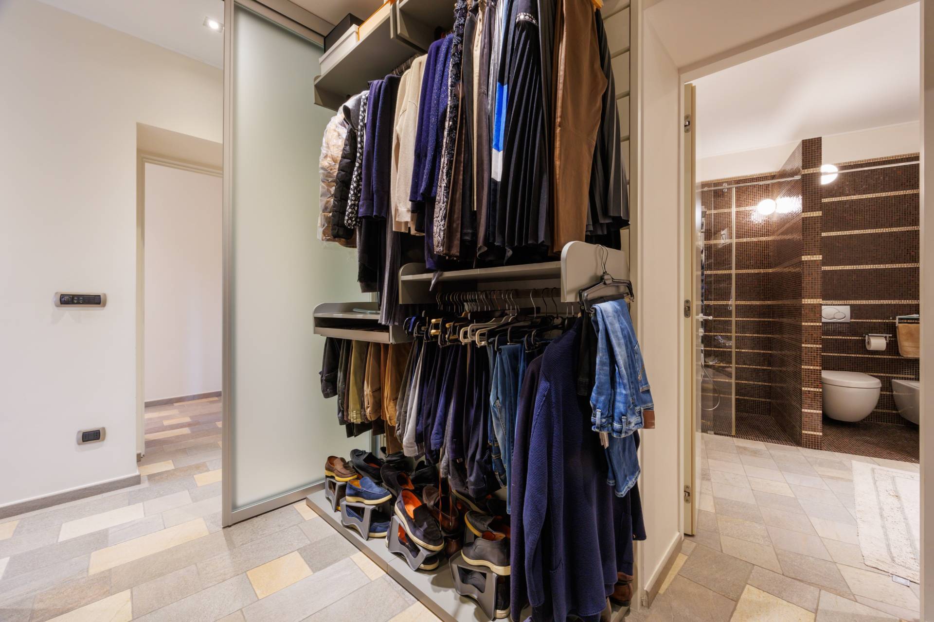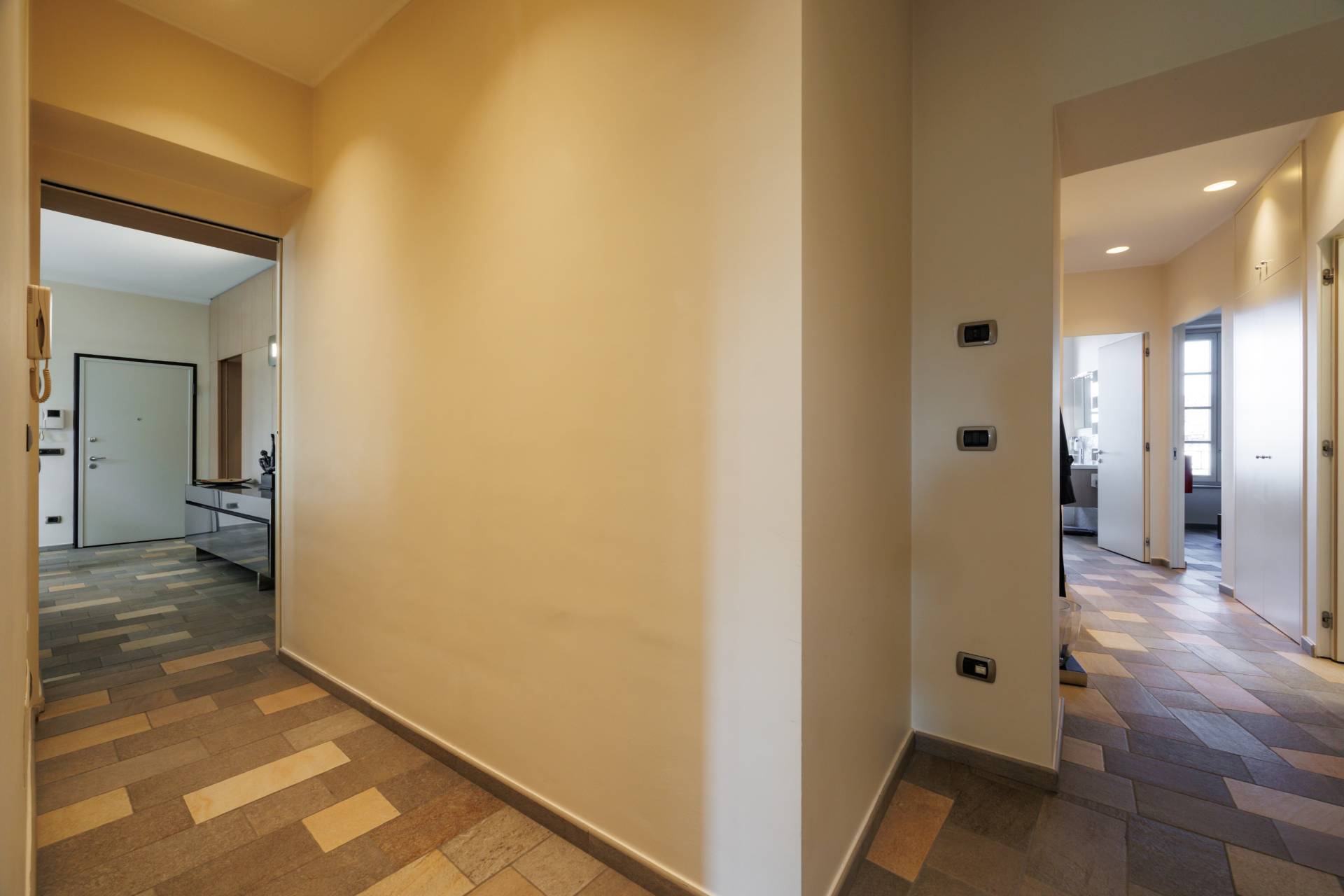 ingresso su zona living con doppio soggiorno, cucina abitabile arredata con cucina su misura ad isola e completa di elettrodomestici di alta gamma, tre camere da letto di cui una con ampia cabina armadio e bagno en suite, due bagni ed una lavanderia.