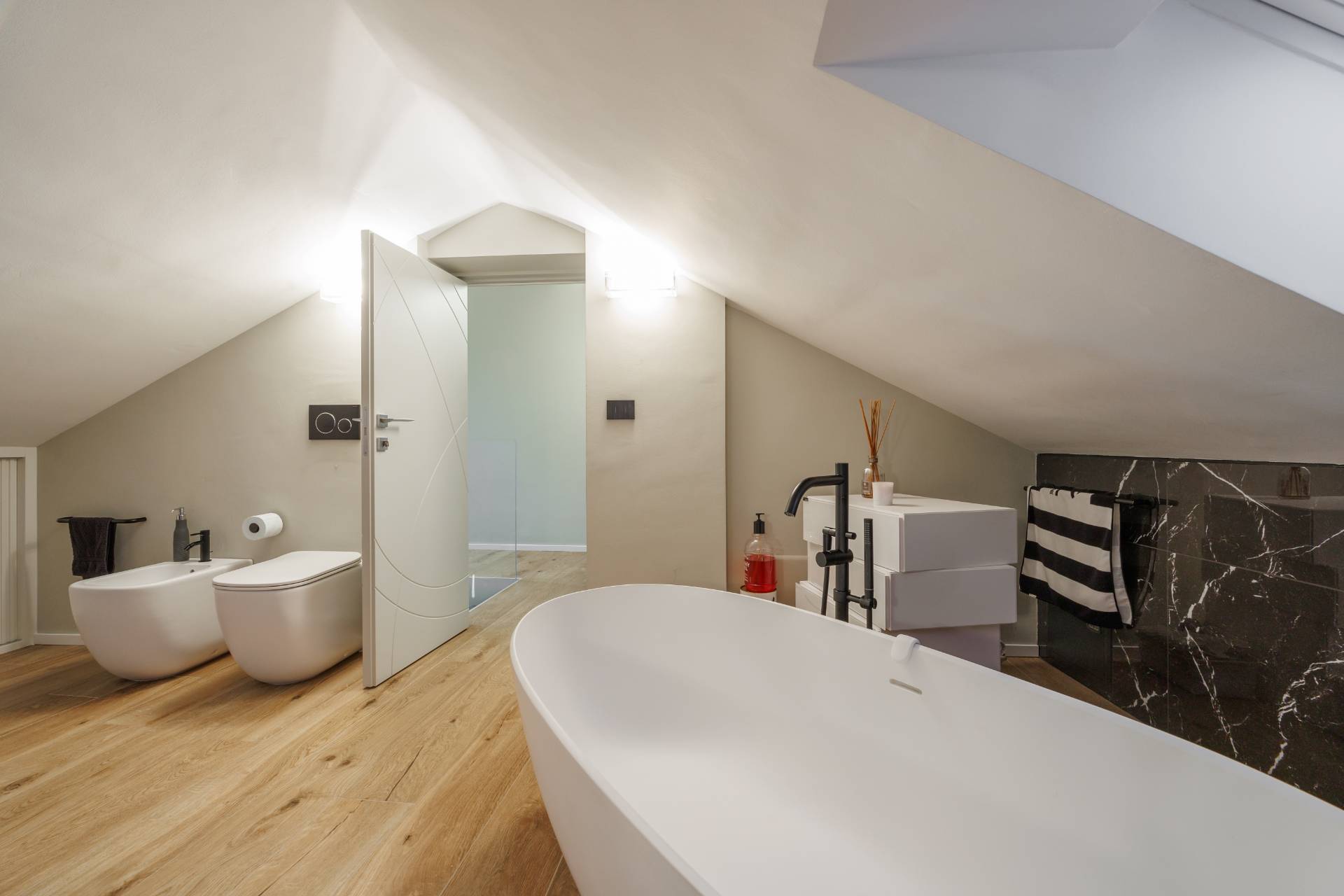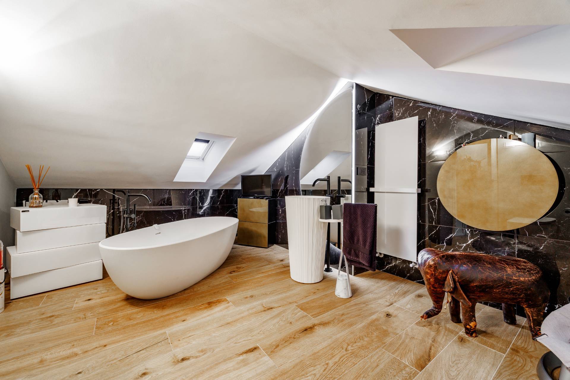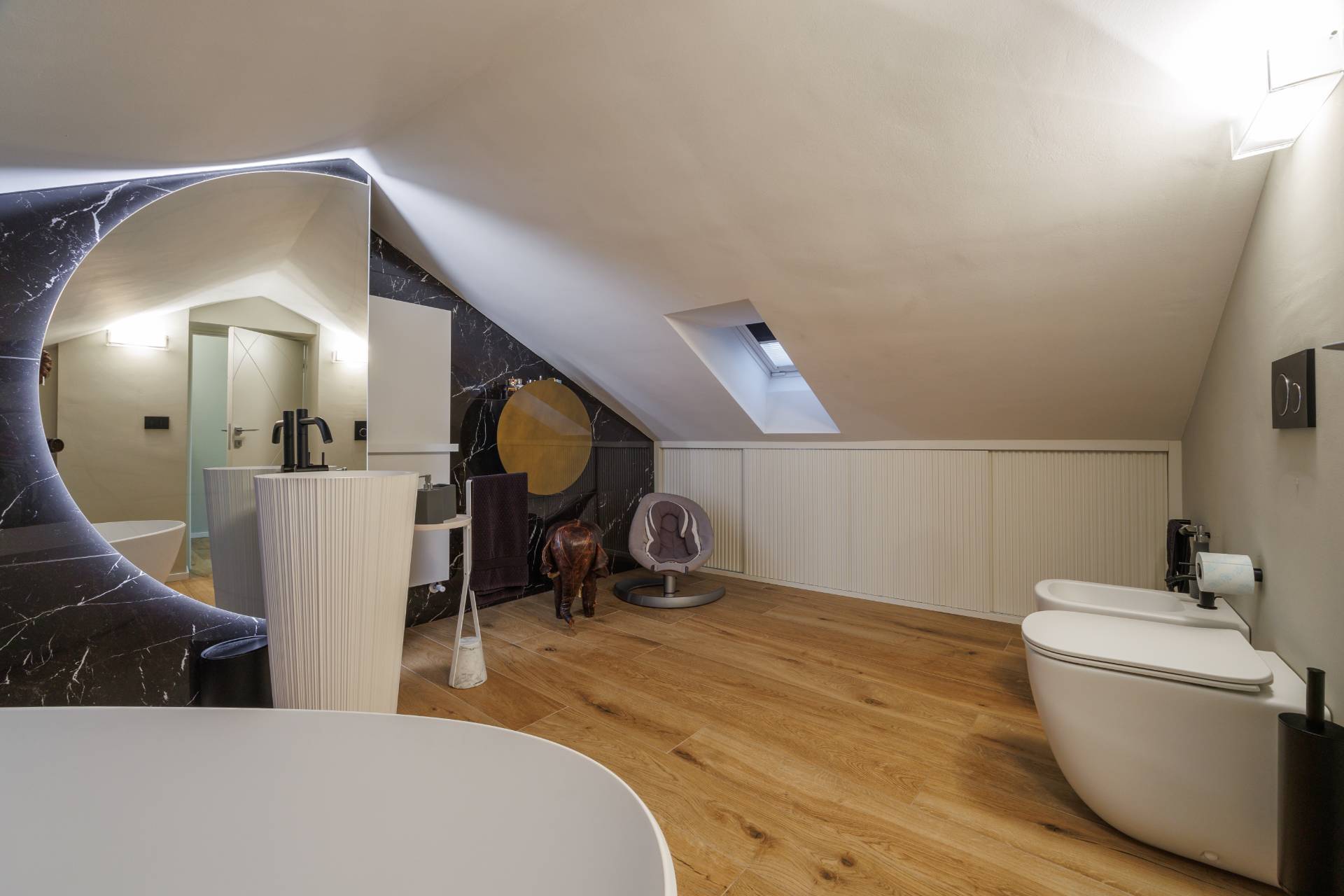 - piano 7: una bella scale di design conduce al piano superiore in cui troviamo una grande camera doppia, un bagno con vasca (lavabo e specchio firmati Antonio Lupi) e un accesso su un terrazzino panoramico;