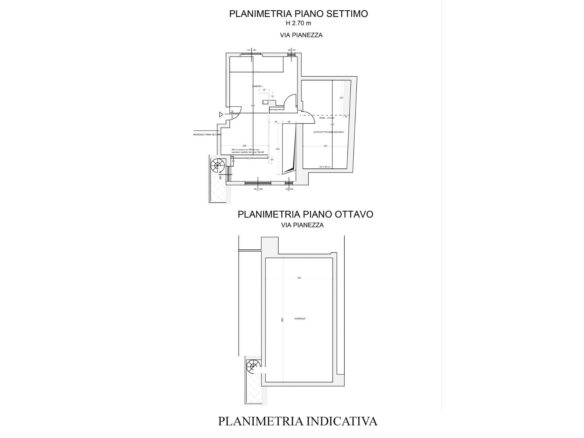 - piano 6: ingresso su soggiorno doppio con cucina a vista completa di isola, un terrazzo coperto completo di tende da sole, con tavolo e sedie, la vista è sulla collina e Superga, sul lato opposto un altro grande terrazzo attrezzato con pergola motorizzata elettricamente e vista su arco alpino, una camera matrimoniale e un bagno con doccia;