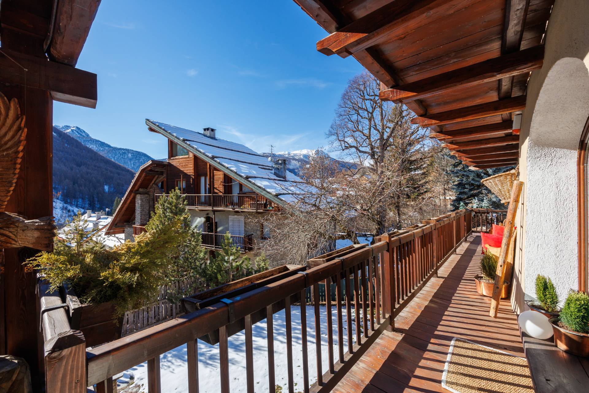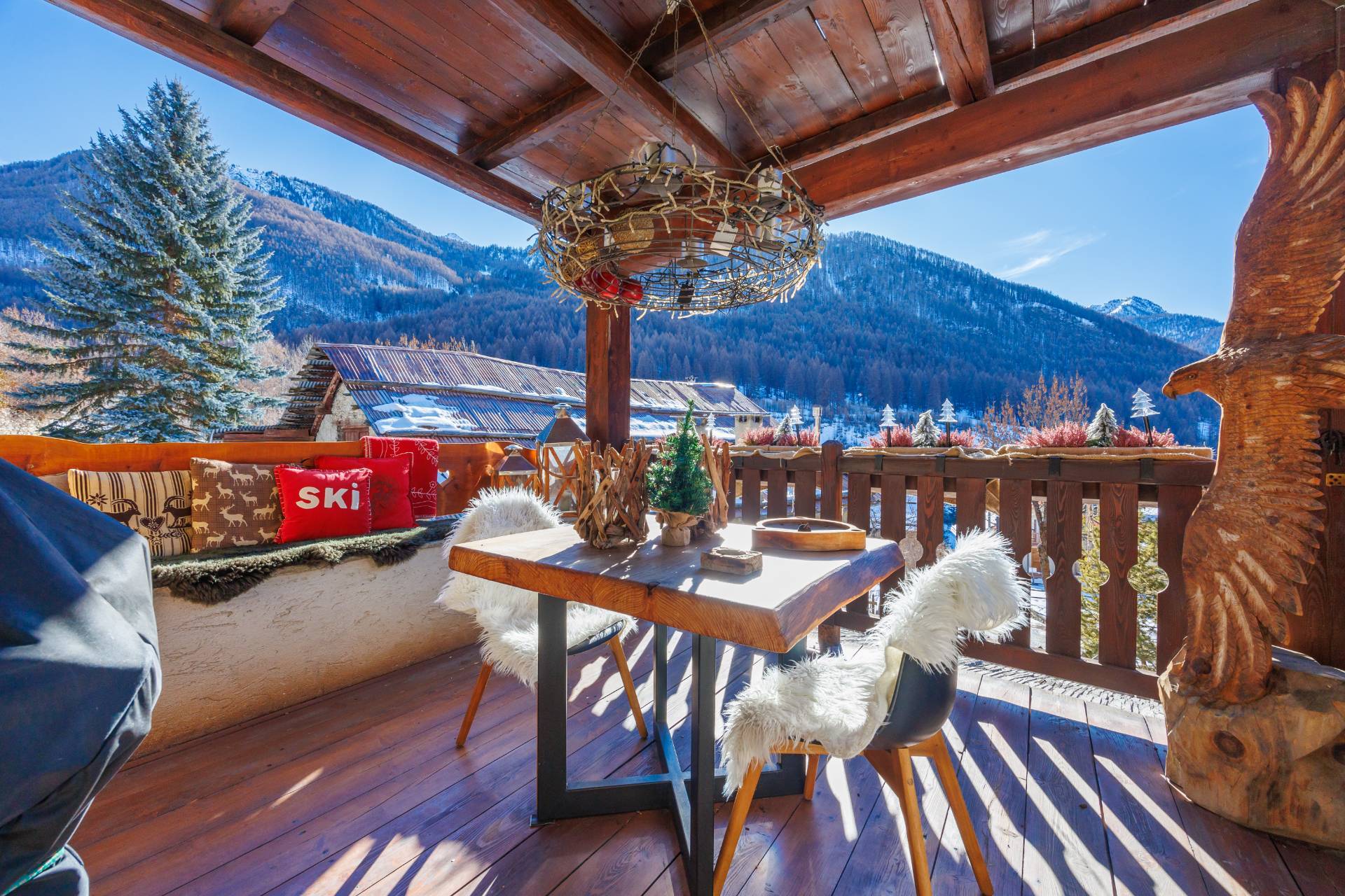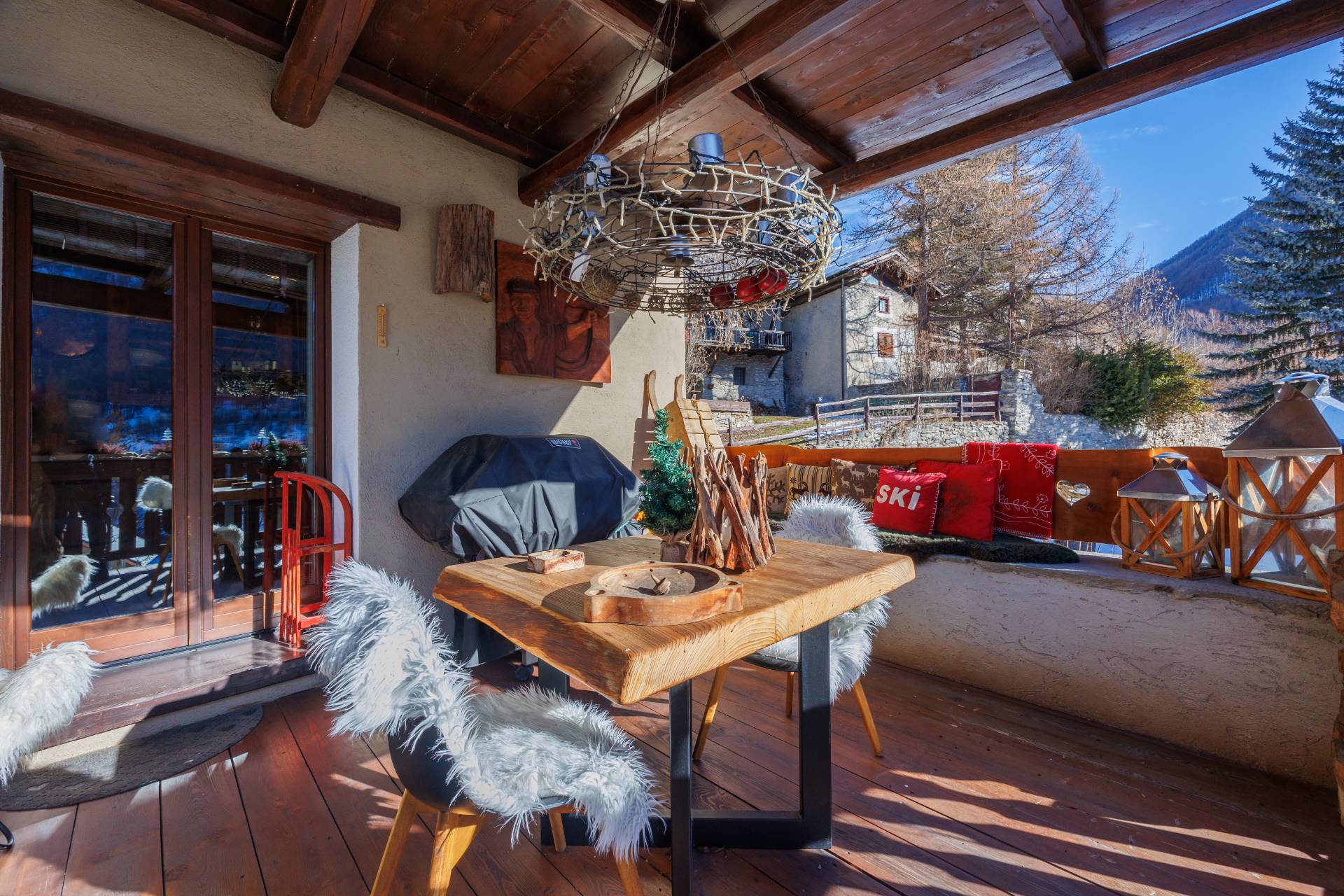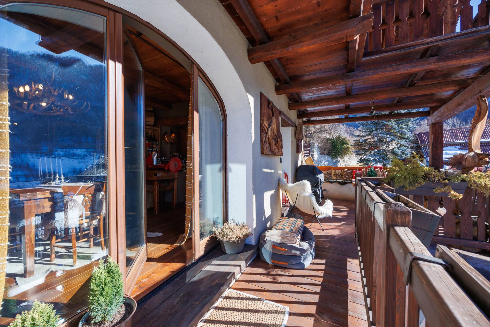 All'esterno troviamo un lungo balcone panoramico che accompagna l'abitazione e conduce ad un terrazzo vivibile, arredato e coperto con una splendida vista aperta sulle montagne e sul paesaggio innevato.