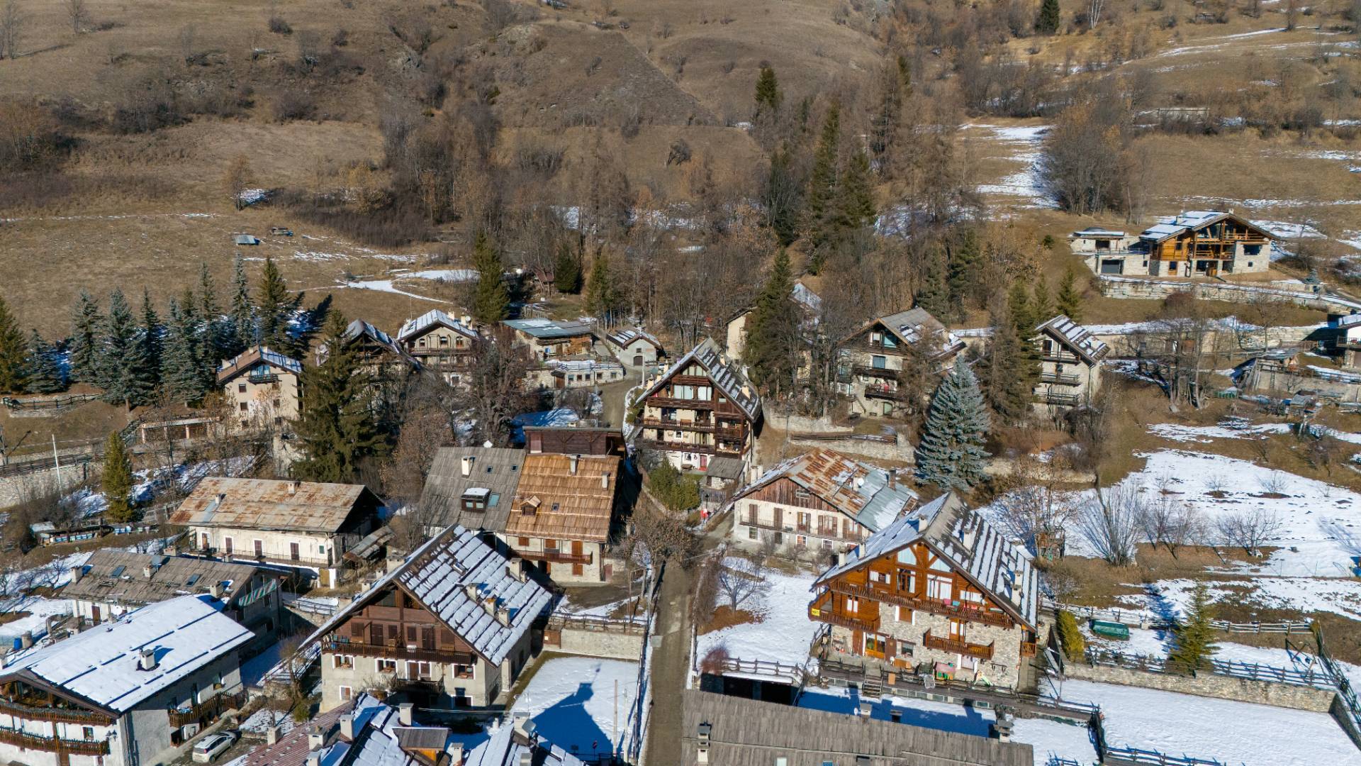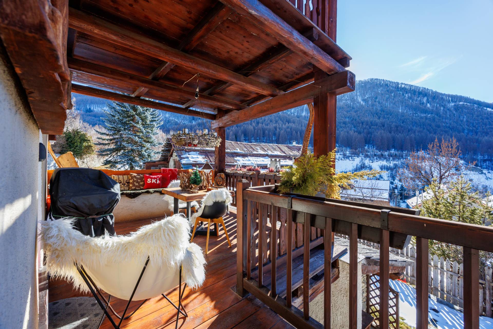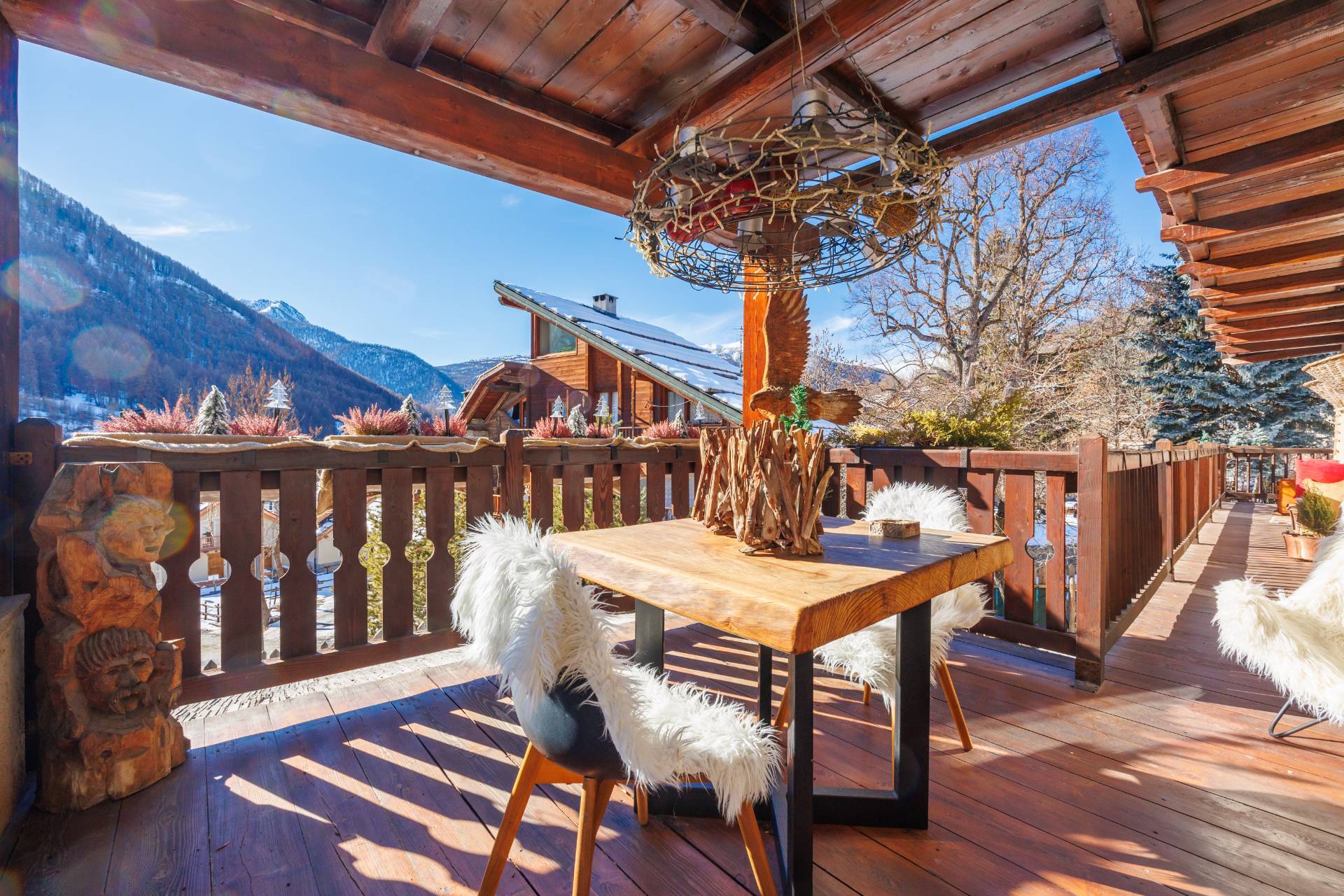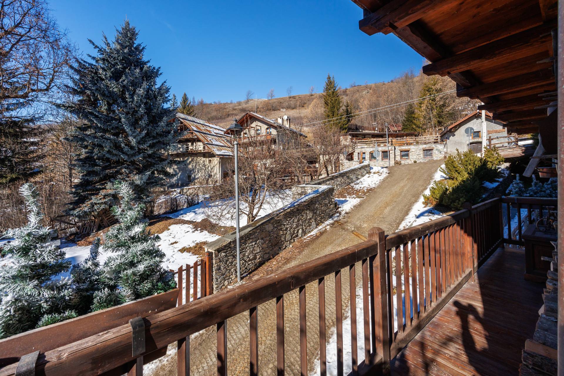 All'esterno troviamo un lungo balcone panoramico che accompagna l'abitazione e conduce ad un terrazzo vivibile, arredato e coperto con una splendida vista aperta sulle montagne e sul paesaggio innevato.
