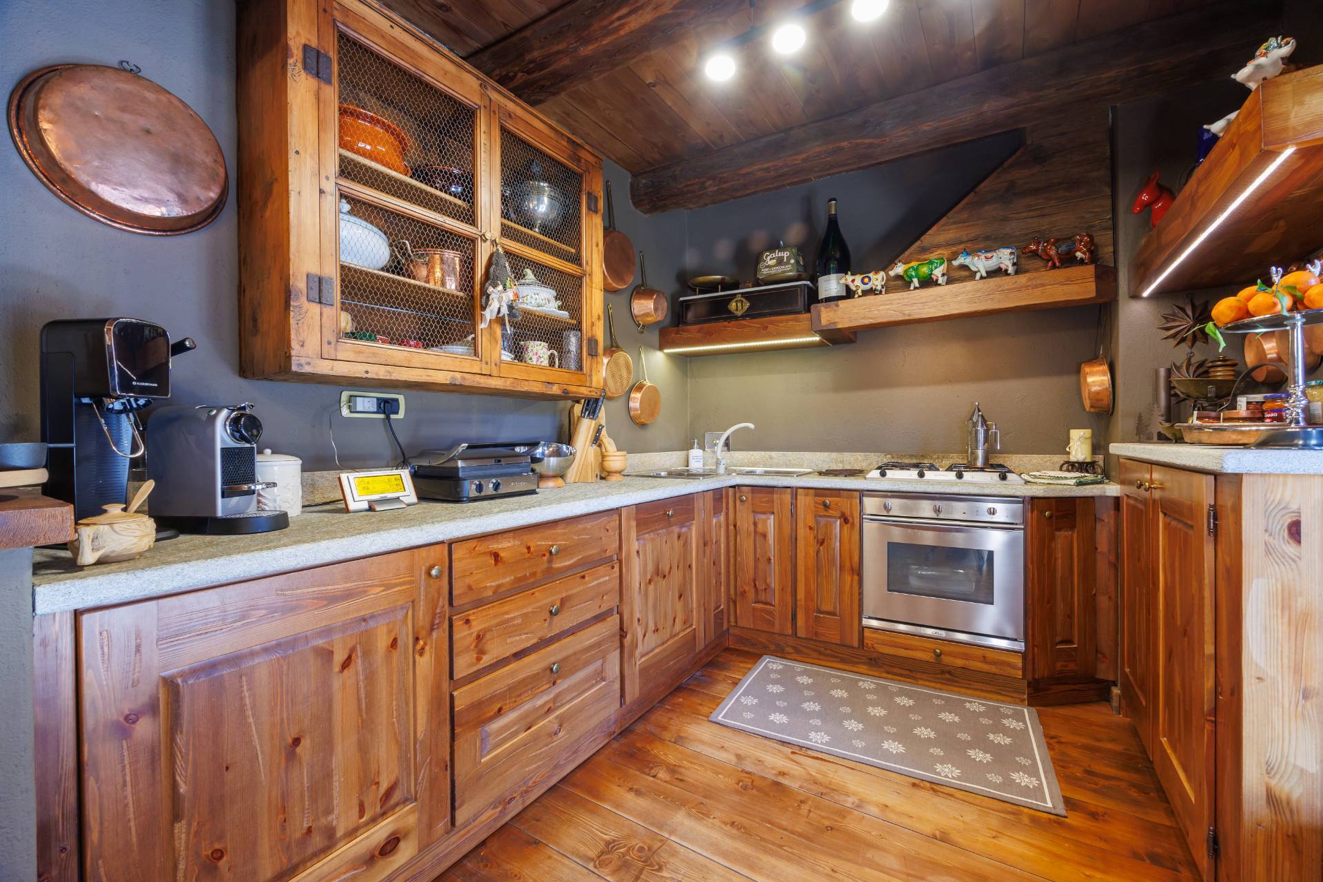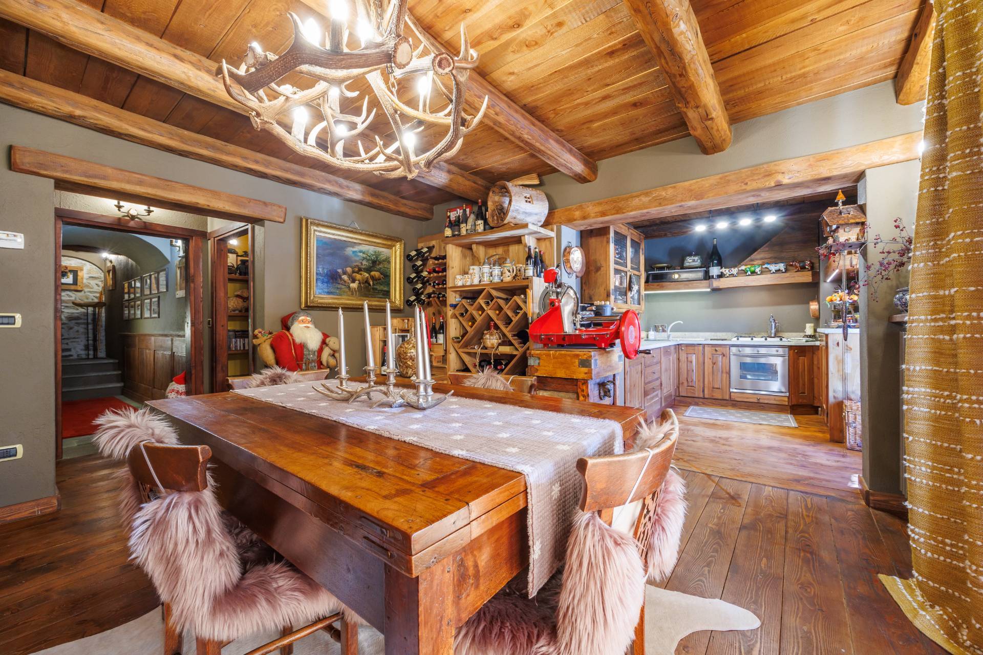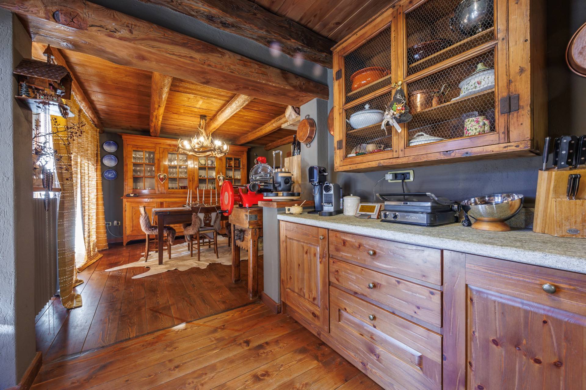 La zona giorno è articolata in modo molto funzionale: grande area pranzo con tavolo conviviale, illuminata da un suggestivo lampadario in stile montano, cucina a vista, ben inserita ma ottimamente disimpegnata, pratica e completa, salone con divani di grandi dimensioni e camino.