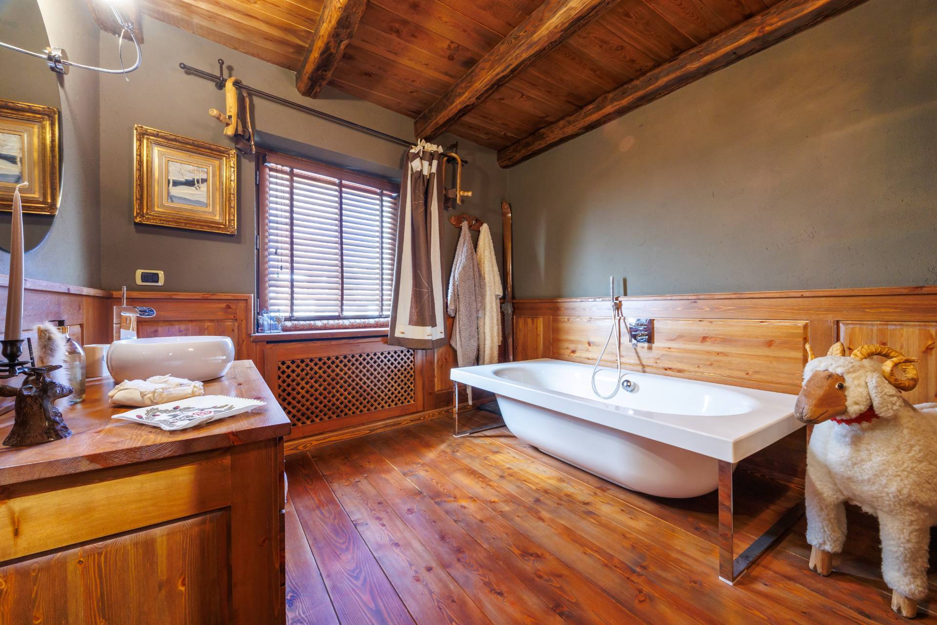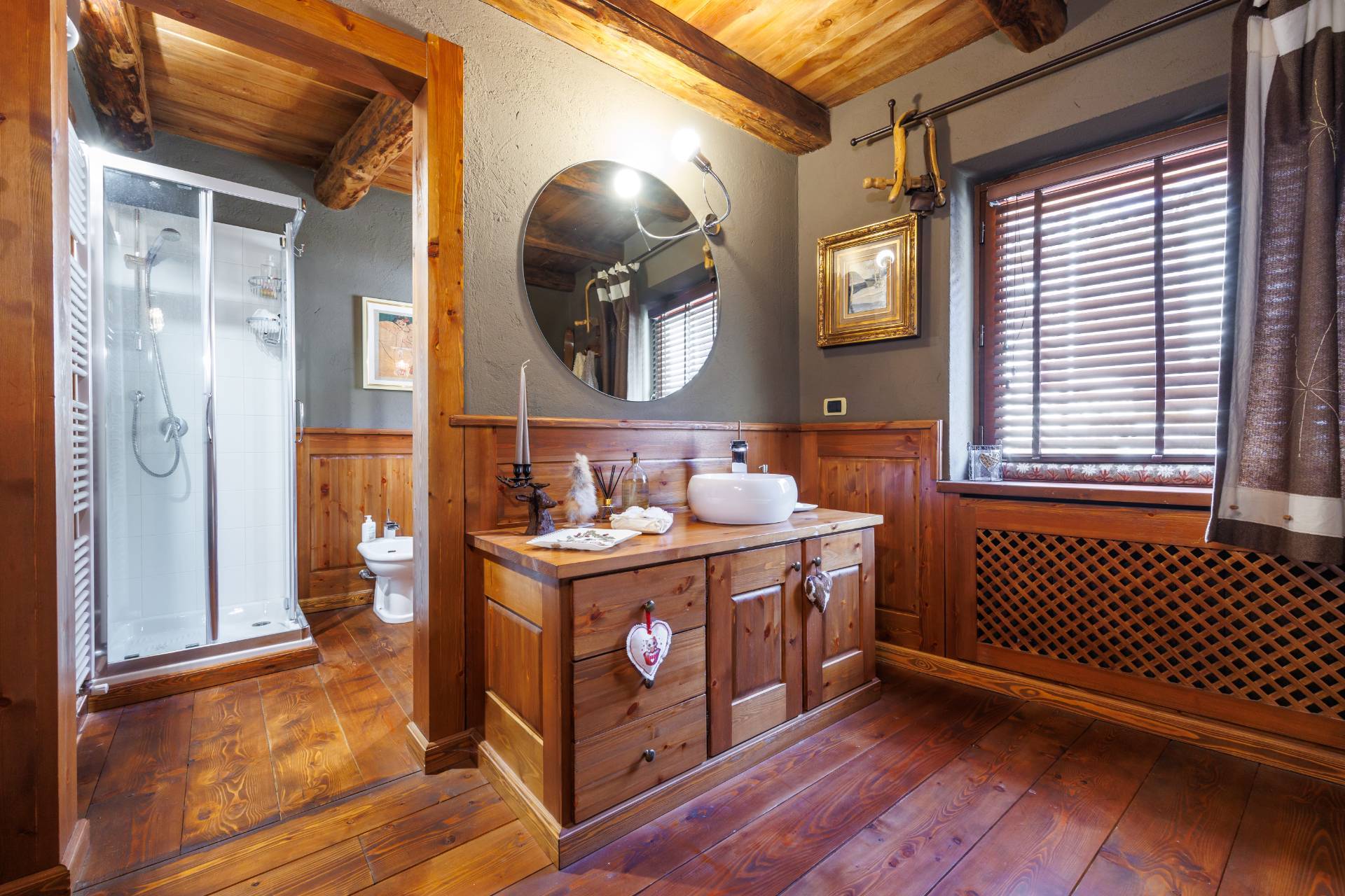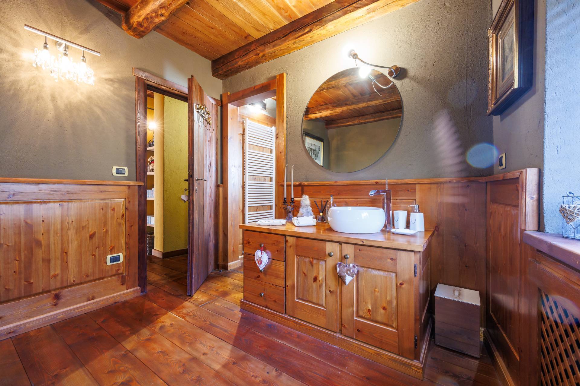 La zona giorno è articolata in modo molto funzionale: grande area pranzo con tavolo conviviale, illuminata da un suggestivo lampadario in stile montano, cucina a vista, ben inserita ma ottimamente disimpegnata, pratica e completa, salone con divani di grandi dimensioni e camino.