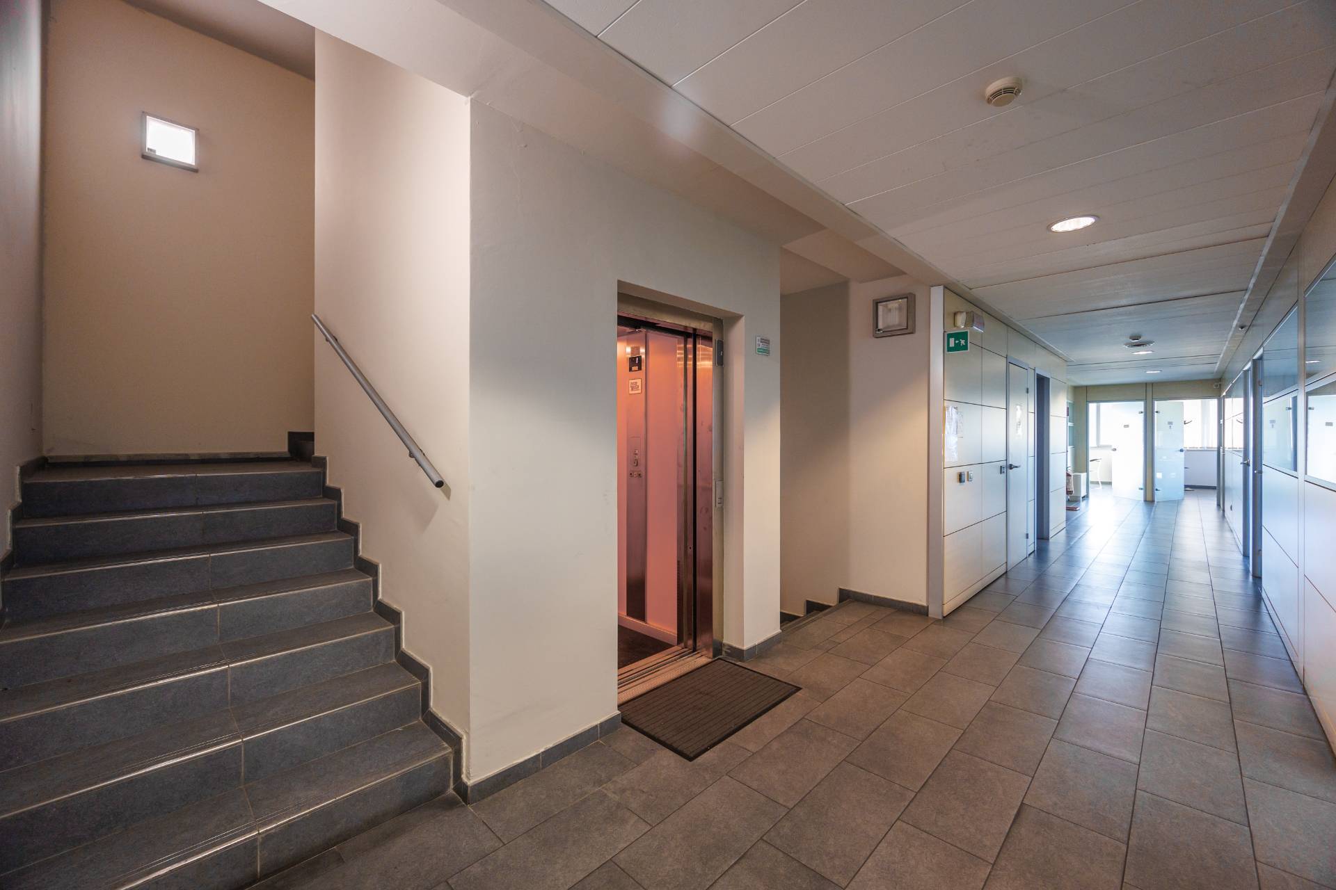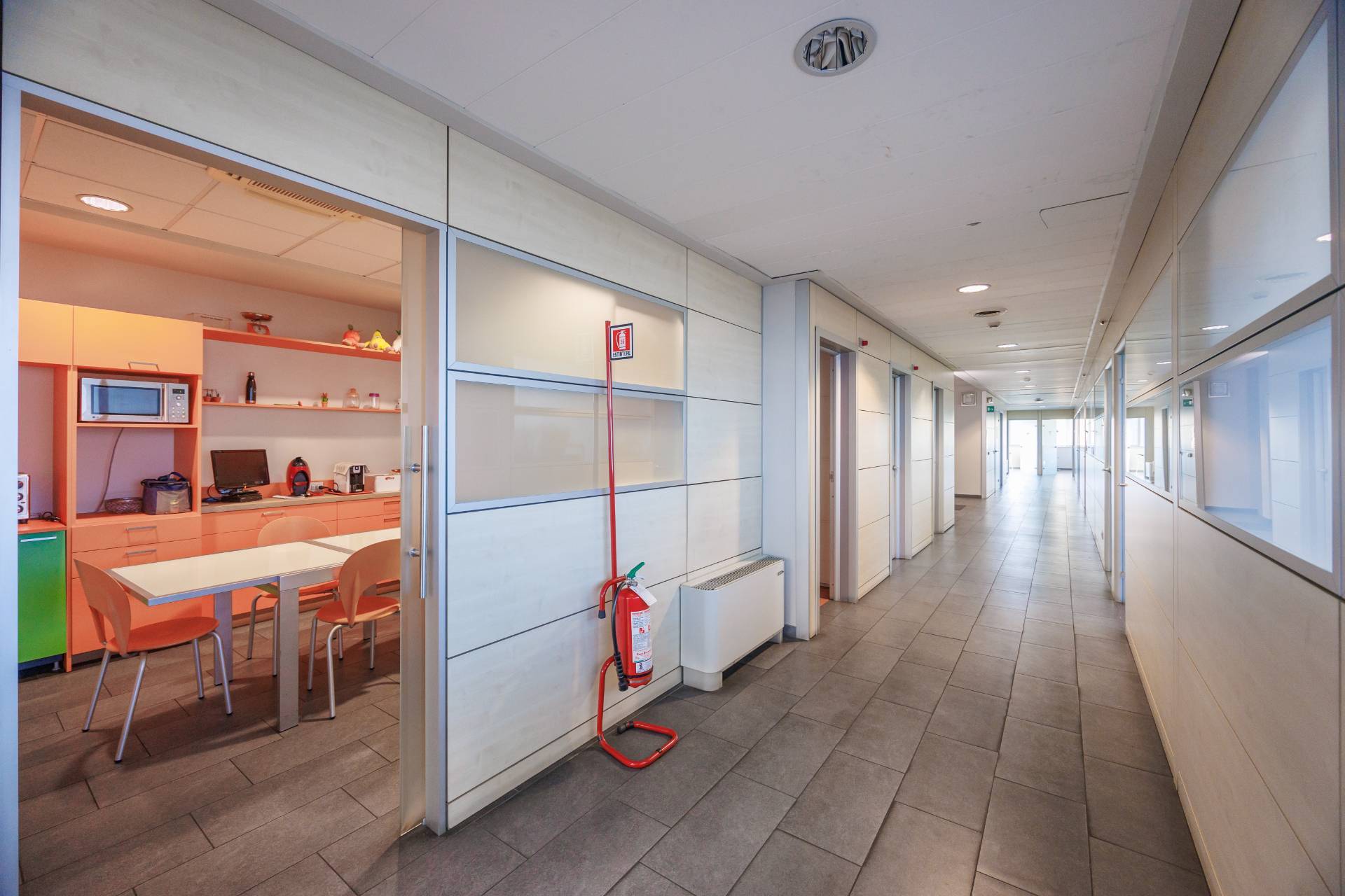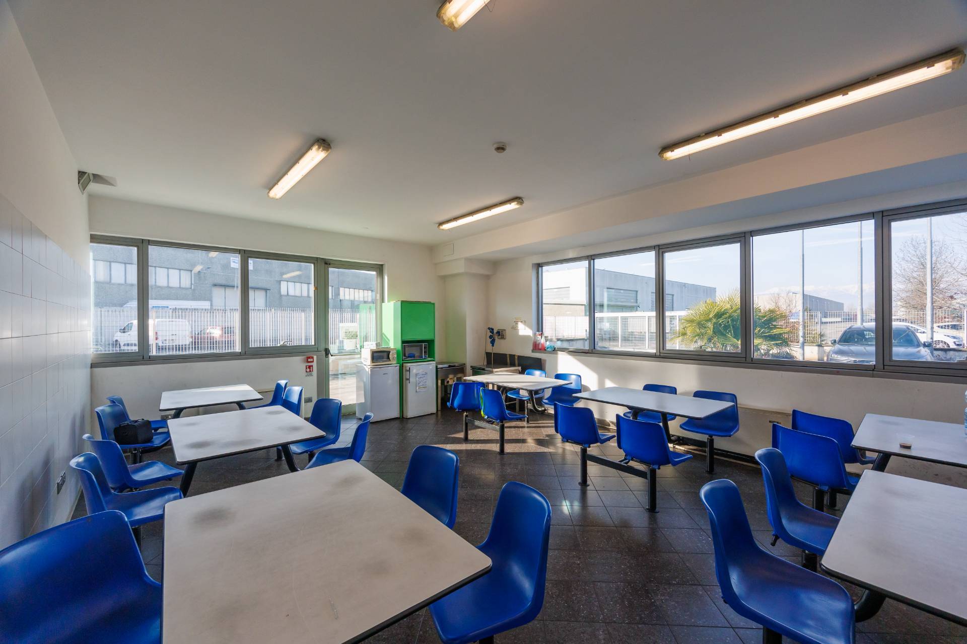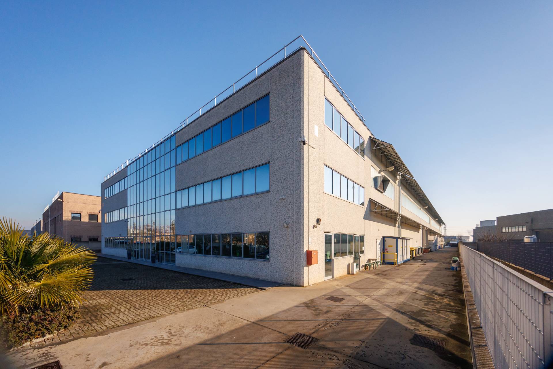 La palazzina uffici di tre piani presenta nella parte centrale delle vetrate di tipo riflettente, colore verde scuro, montanti colorazione grigia.