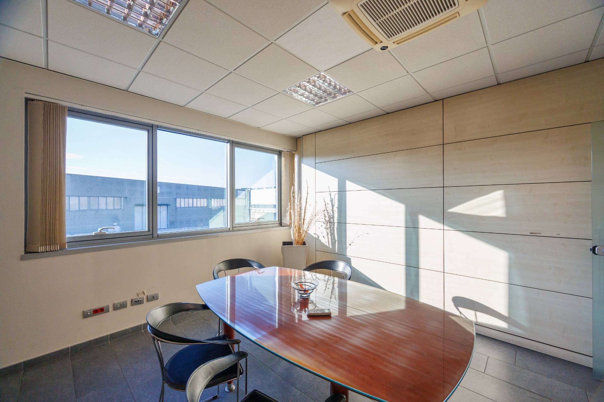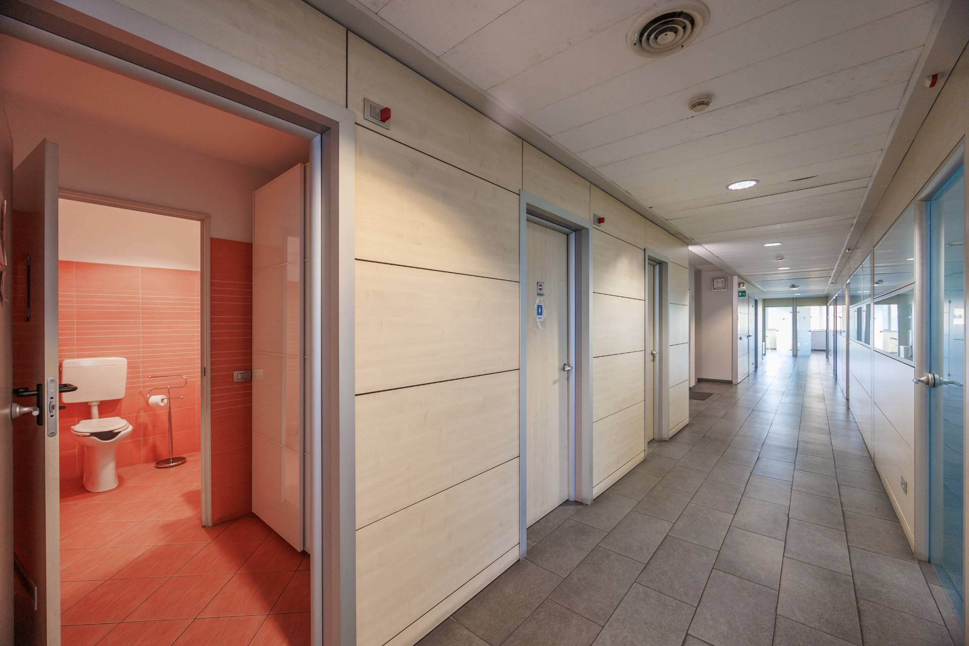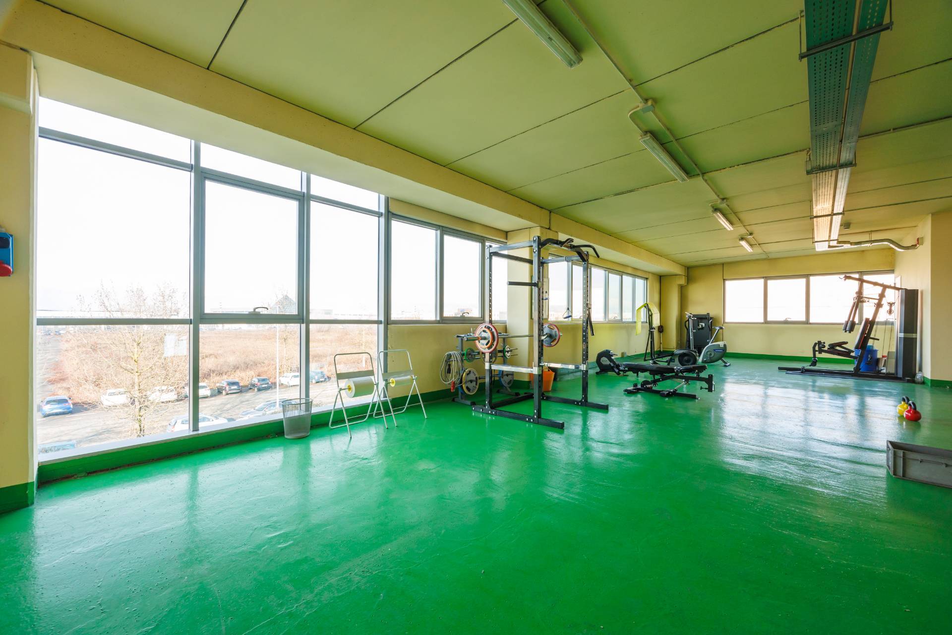La palazzina uffici di tre piani presenta nella parte centrale delle vetrate di tipo riflettente, colore verde scuro, montanti colorazione grigia.