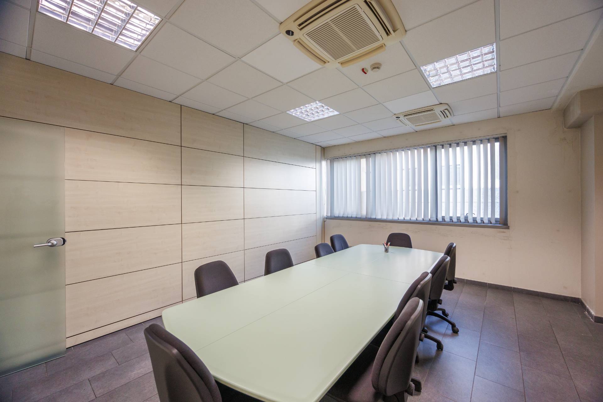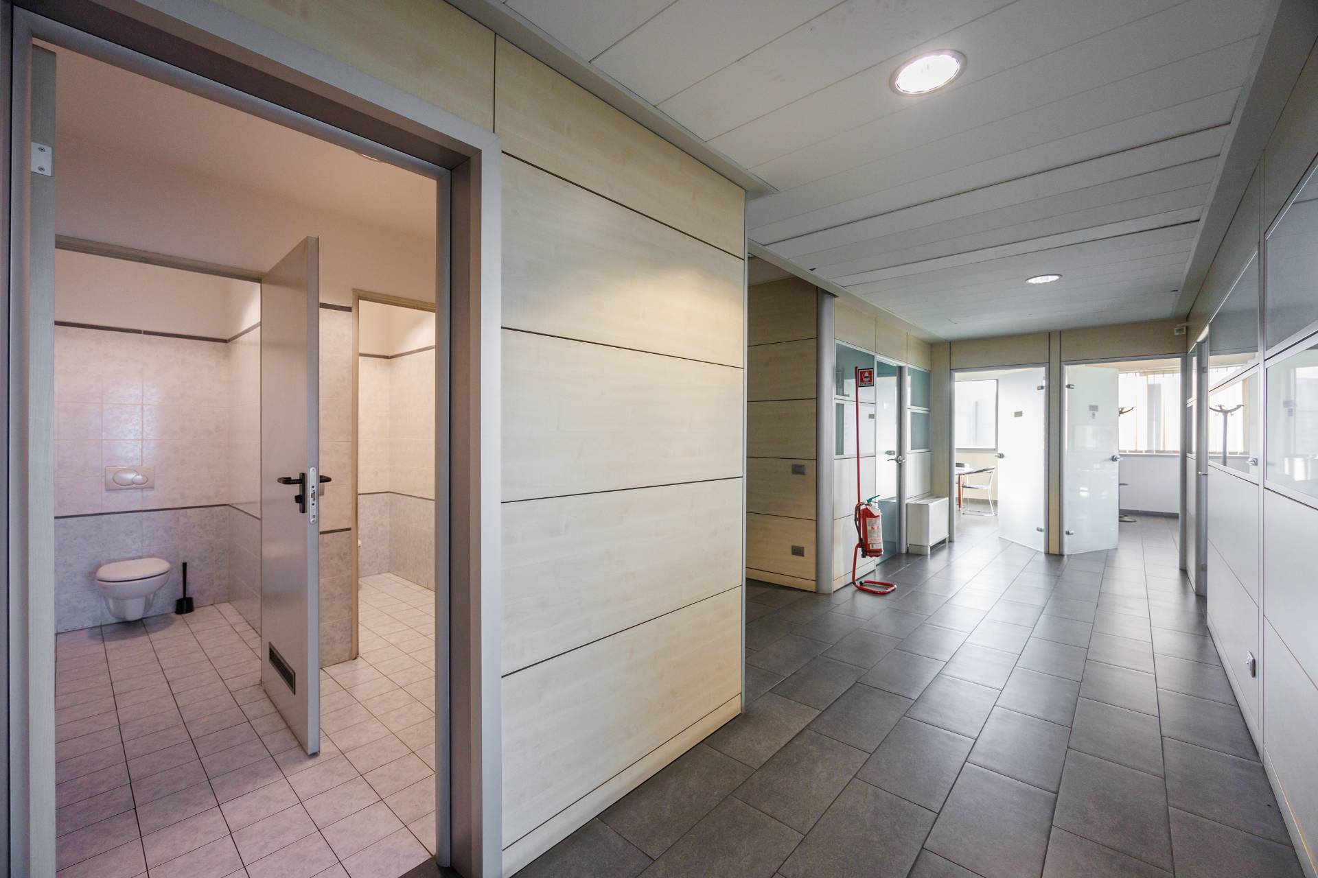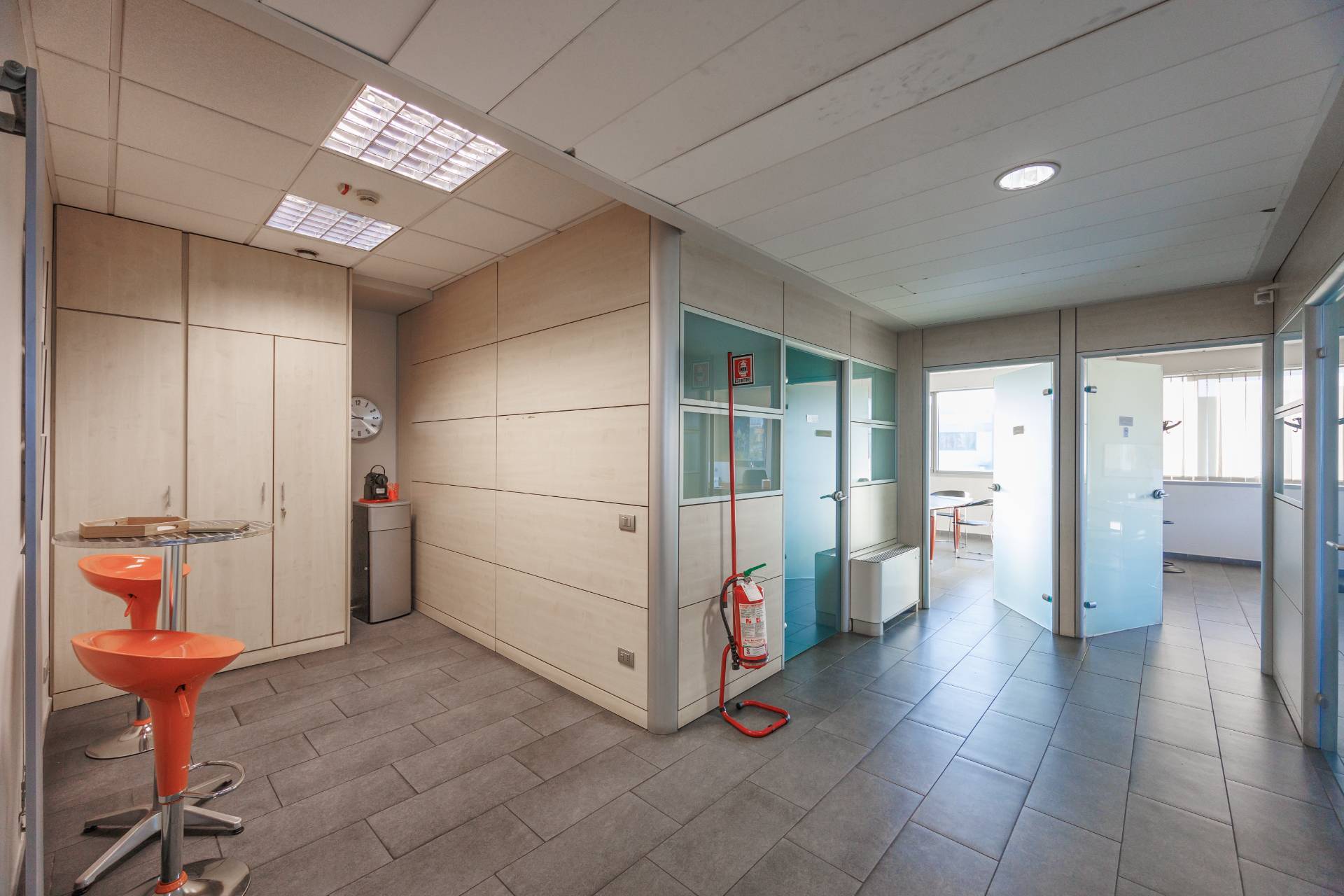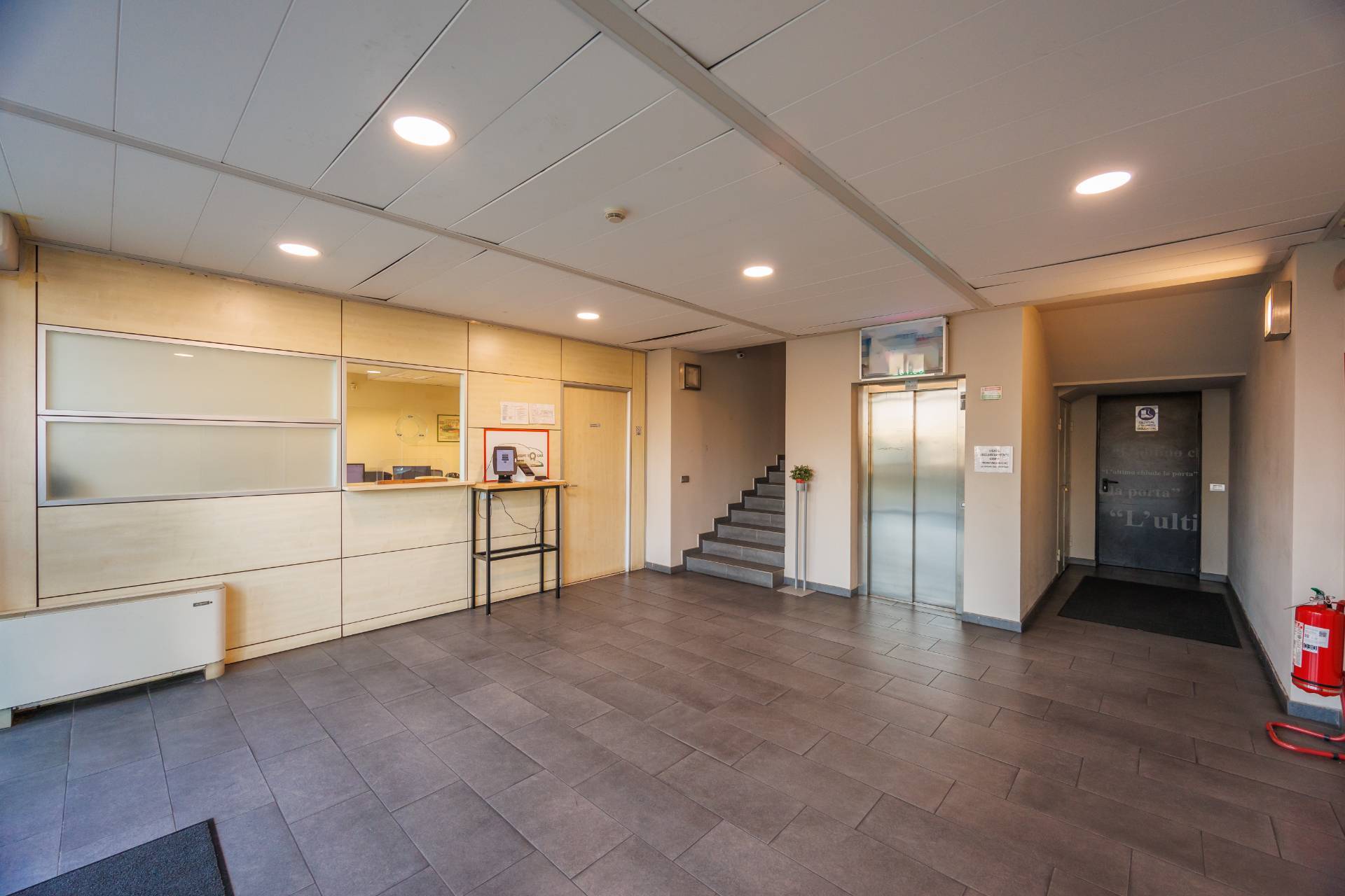 La palazzina uffici di tre piani presenta nella parte centrale delle vetrate di tipo riflettente, colore verde scuro, montanti colorazione grigia.