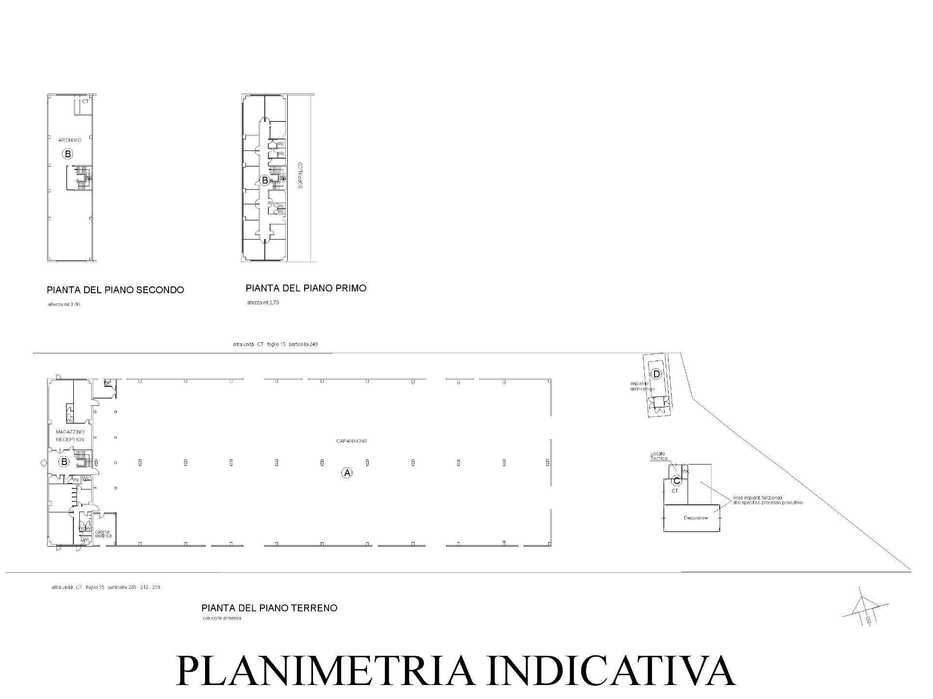 Capannone industriale con entrostante porzione ad uso magazzino, cabina elettrica, uffici, archivio e servizi elevata a tre piani fuori terra oltre in corpi staccati locale depuratore, locale centrale termica, locale tecnico, servizio ed impianto antincendio, il tutto entrostante a terreno