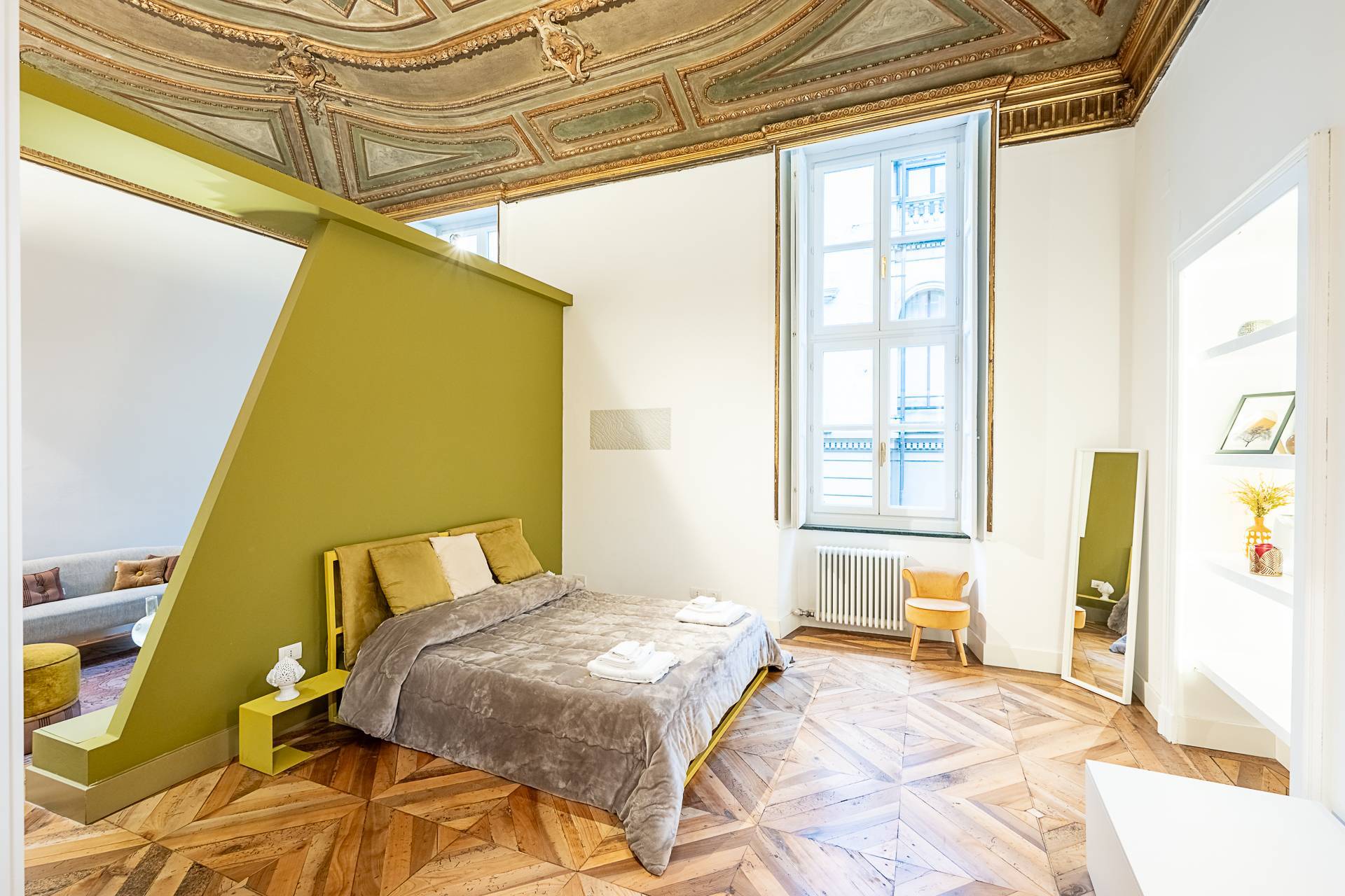 L'Appartamento misura circa 185 mq ed è composto da ingresso su zona giorno con cucina di design, luminoso salone con doppia porta finestra con accesso al balcone con affaccio su via monte di pietà. La zona notte, collegata da corridoio attrezzato da armadi su misura, comprende una suite con camera da letto matrimoniale, salotto privato, cabina armadi e bagno; seconda camera da letto matrimoniale con zona armadi e secondo bagno.