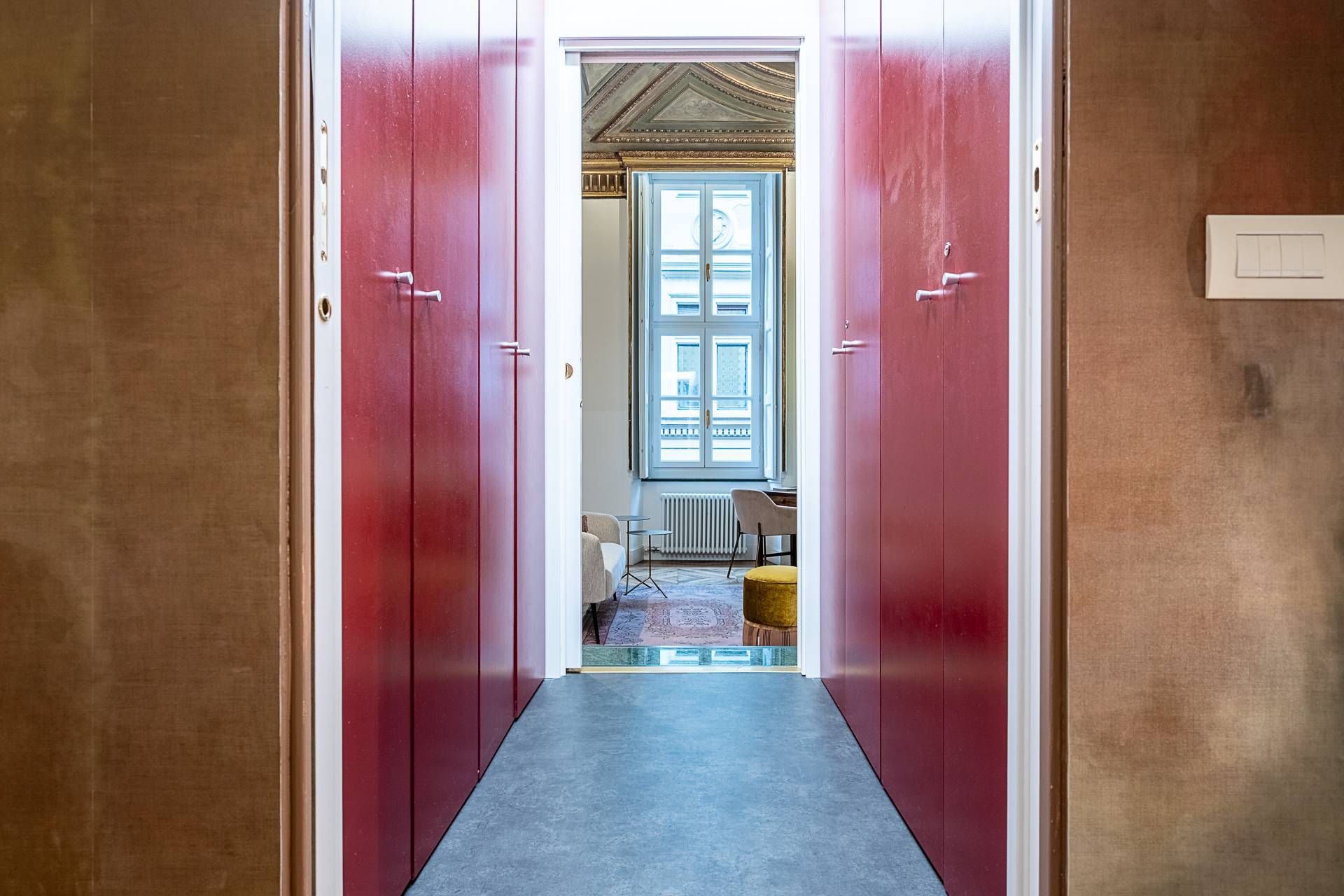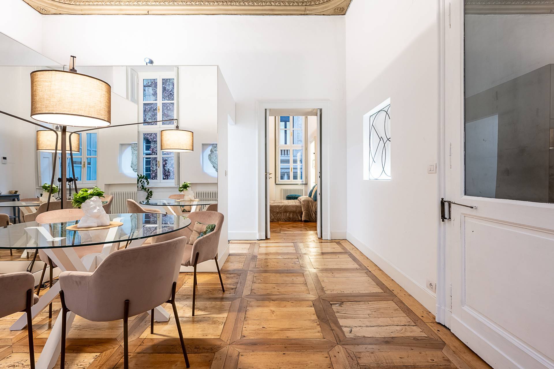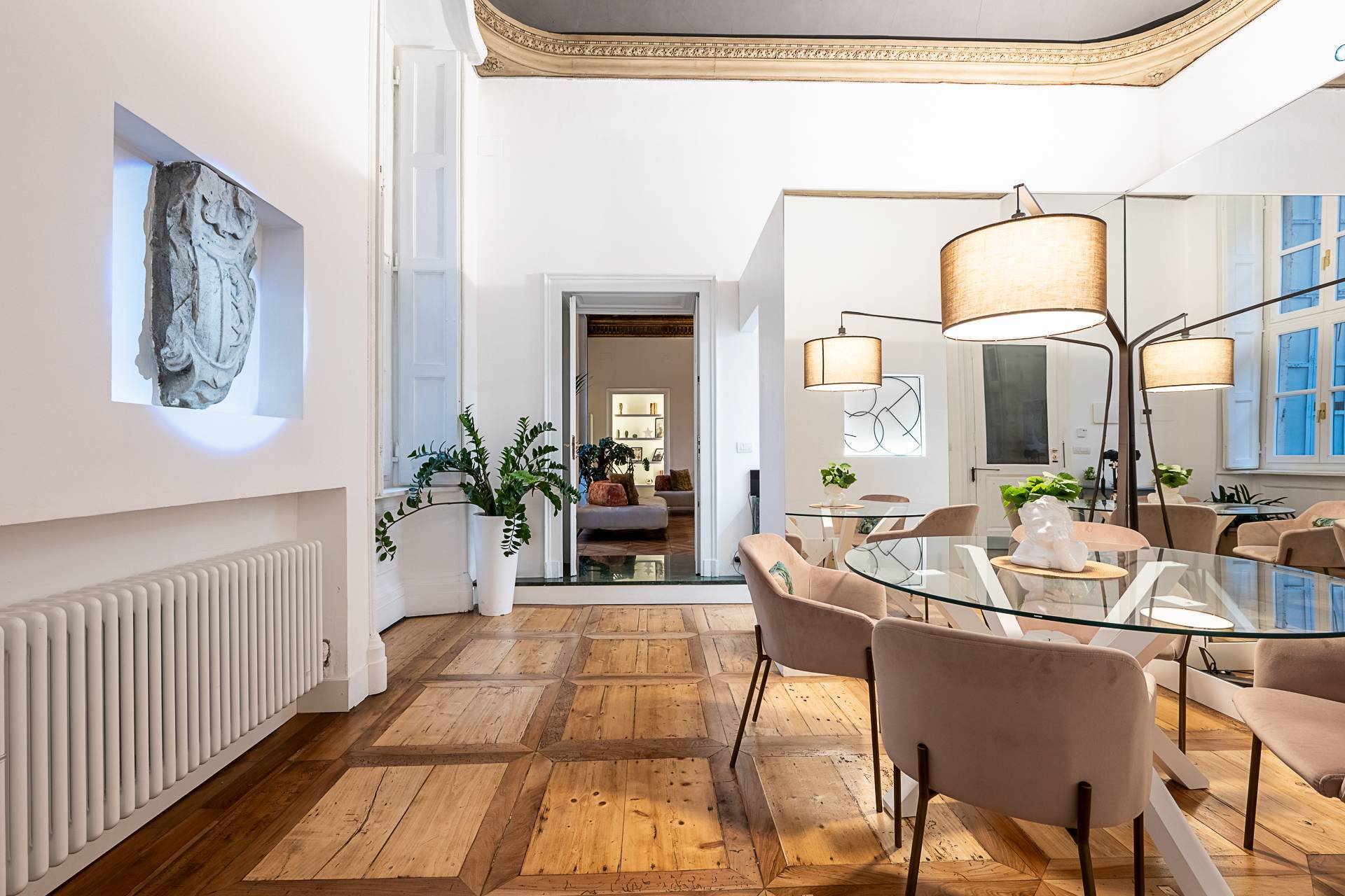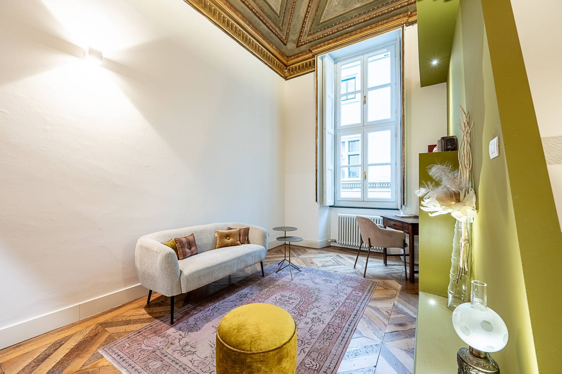 L'Appartamento è stato oggetto di una radicale ristrutturazione volta a rendere protagonisti i numerosi elementi d'epoca presenti al suo interno e dare risalto alle altezze dei soffitti e ai suoi decori. Pavimenti in parquet originale.