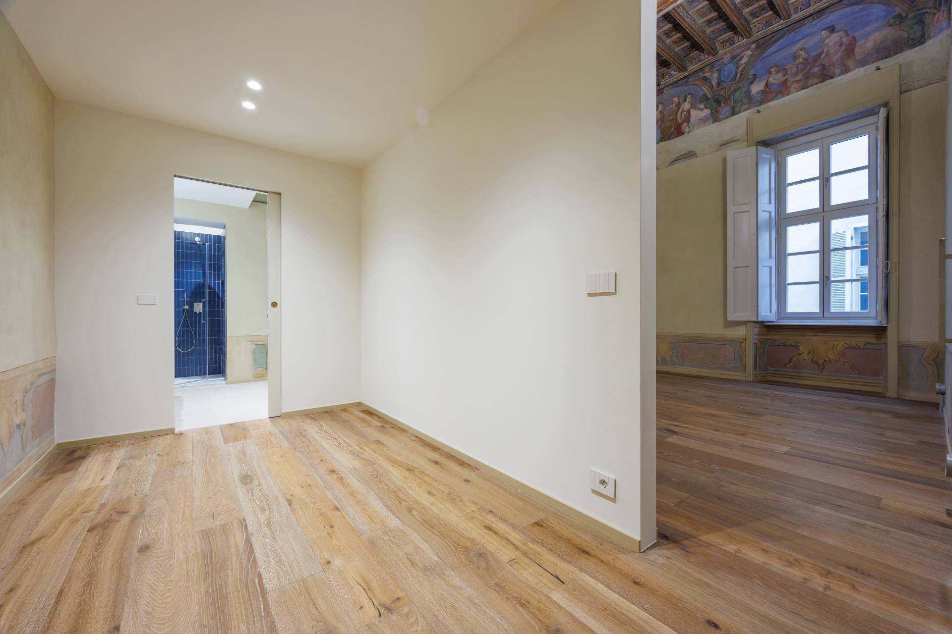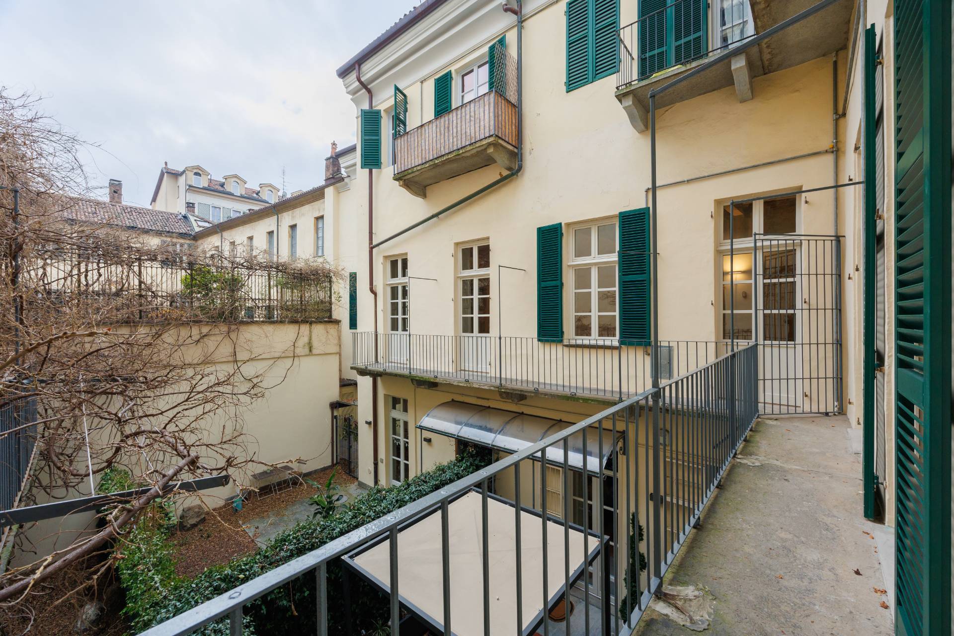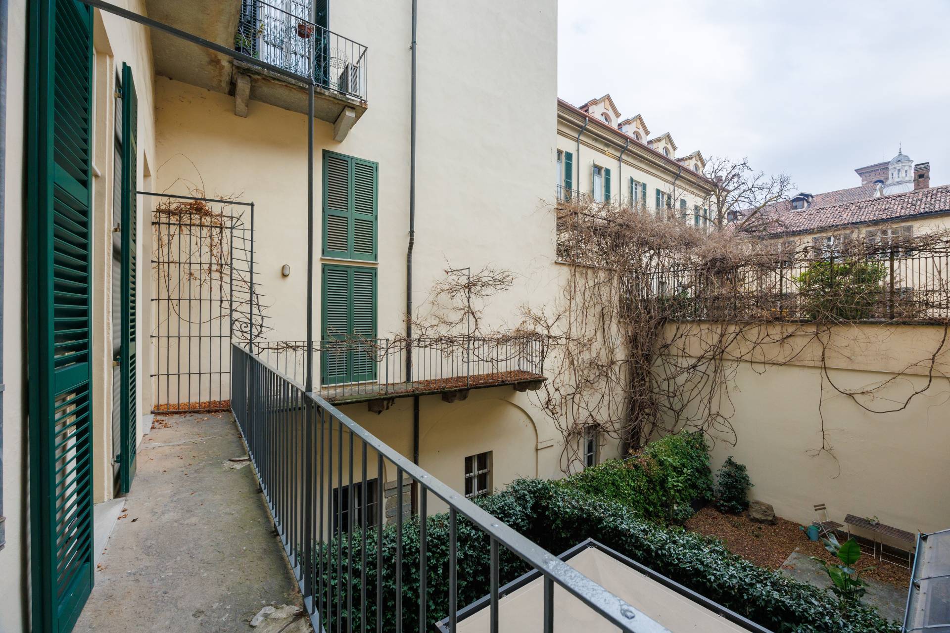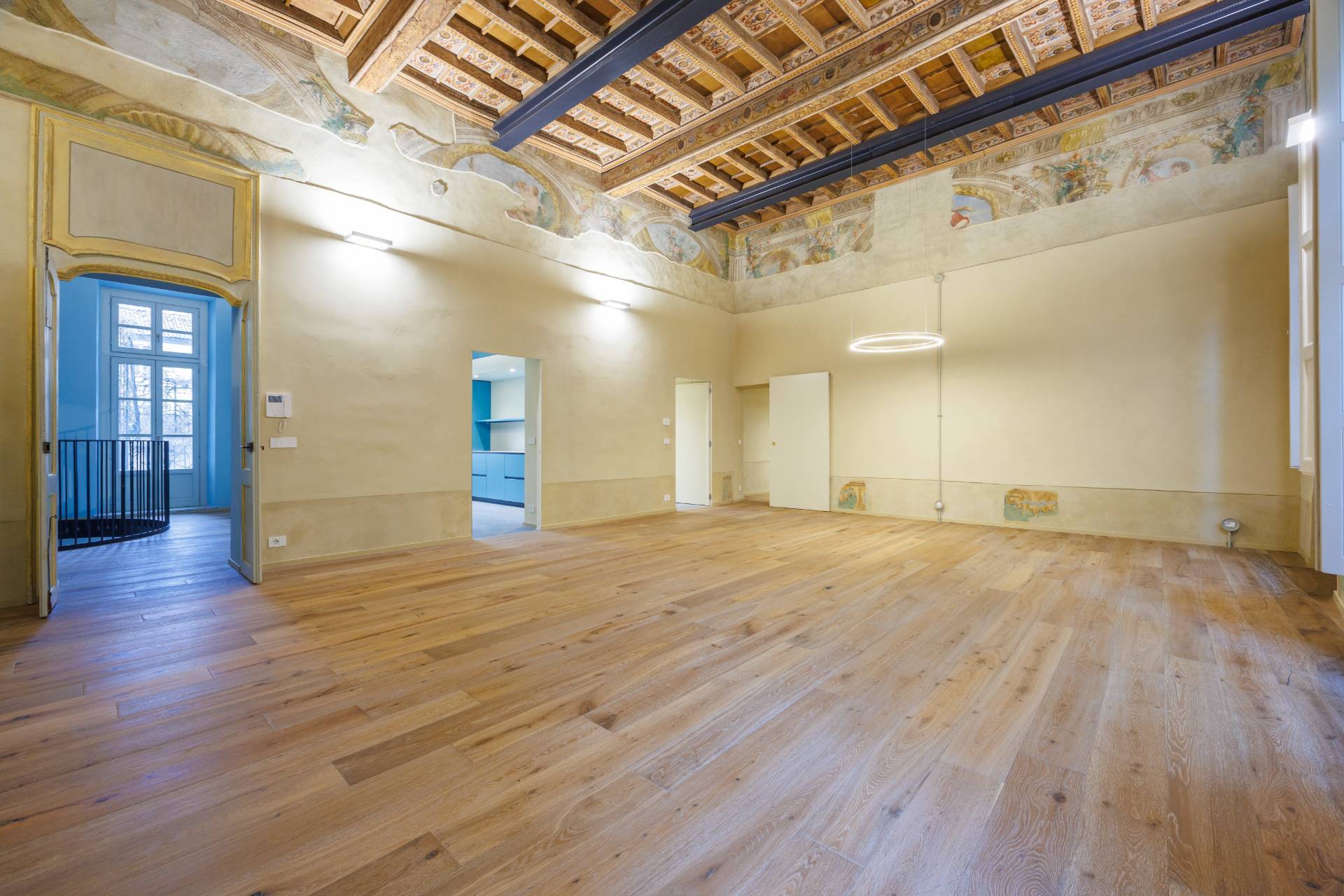 Nello splendido, seicentesco palazzo Frichignono di Castellengo, sito all'incrocio di Via San Dalmazzo e Via Barbaroux, grande Appartamento al piano nobile, appena ristrutturato. L'Appartamento ha ingresso indipendente da Via San Dalmazzo 5, con un corridoio che porta in una grande stanza nella quale troviamo ascensore privato e ampia scala elicoidale in ferro, che conducono al primo piano. Qui un ampio ingresso porta al magnifico salone, di circa 60 mq, con soffitti molto alti, travi a vista decorate e affreschi originali restaurati. Il salone è collegato con una cucina abitabile e arredata e un bagno con antibagno, entrambi aperti sul cortile interno. Attraverso una grande cabina armadi si arriva alla camera padronale, di circa 35 mq, con bagno privato.