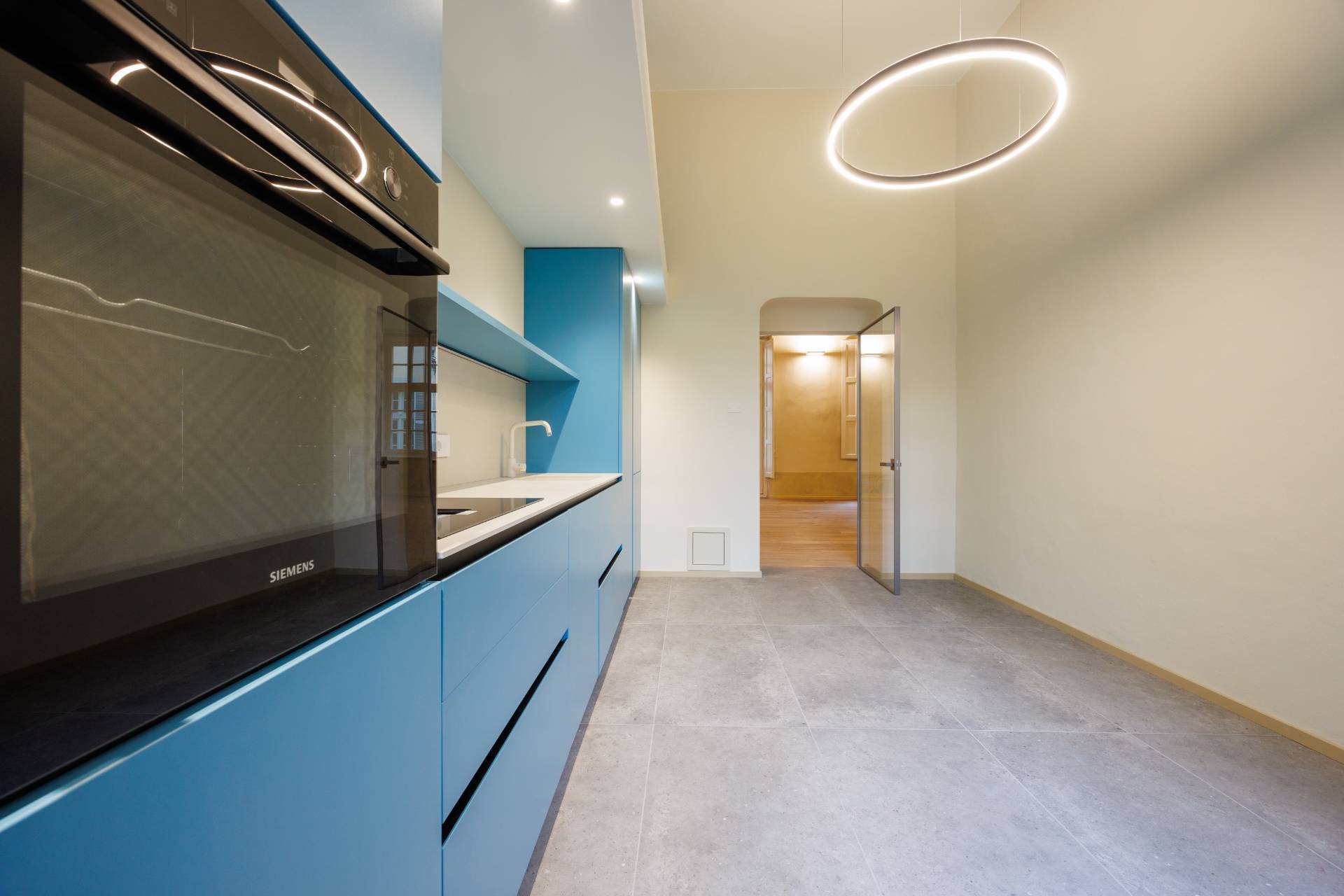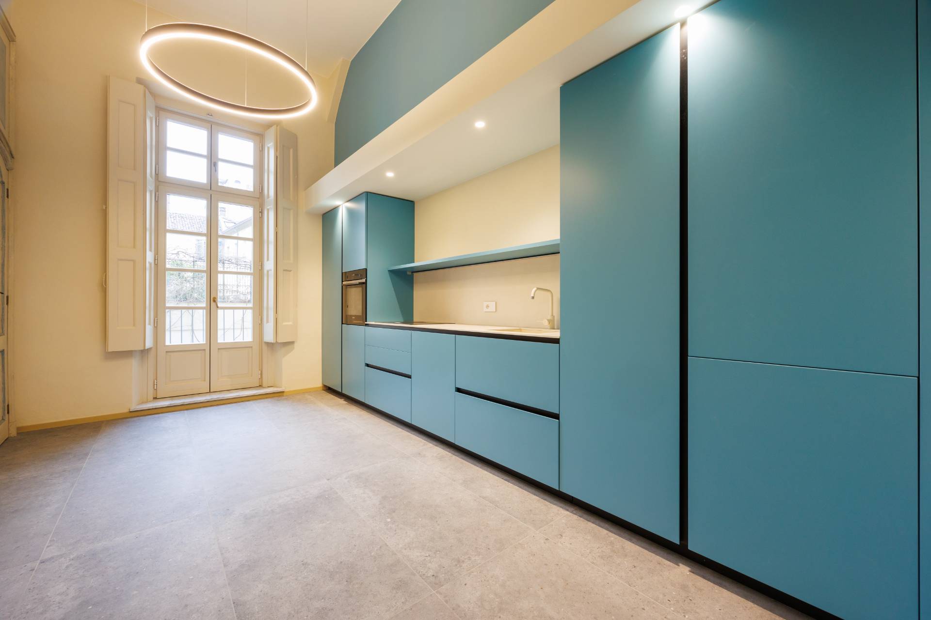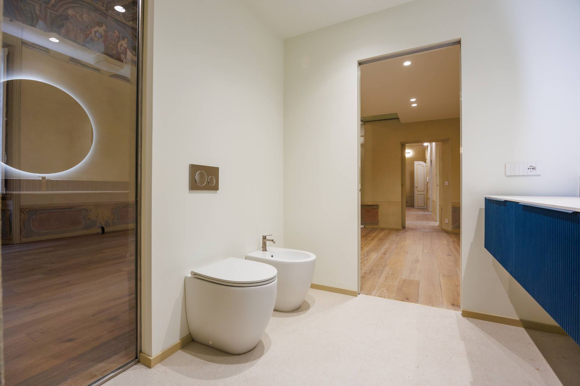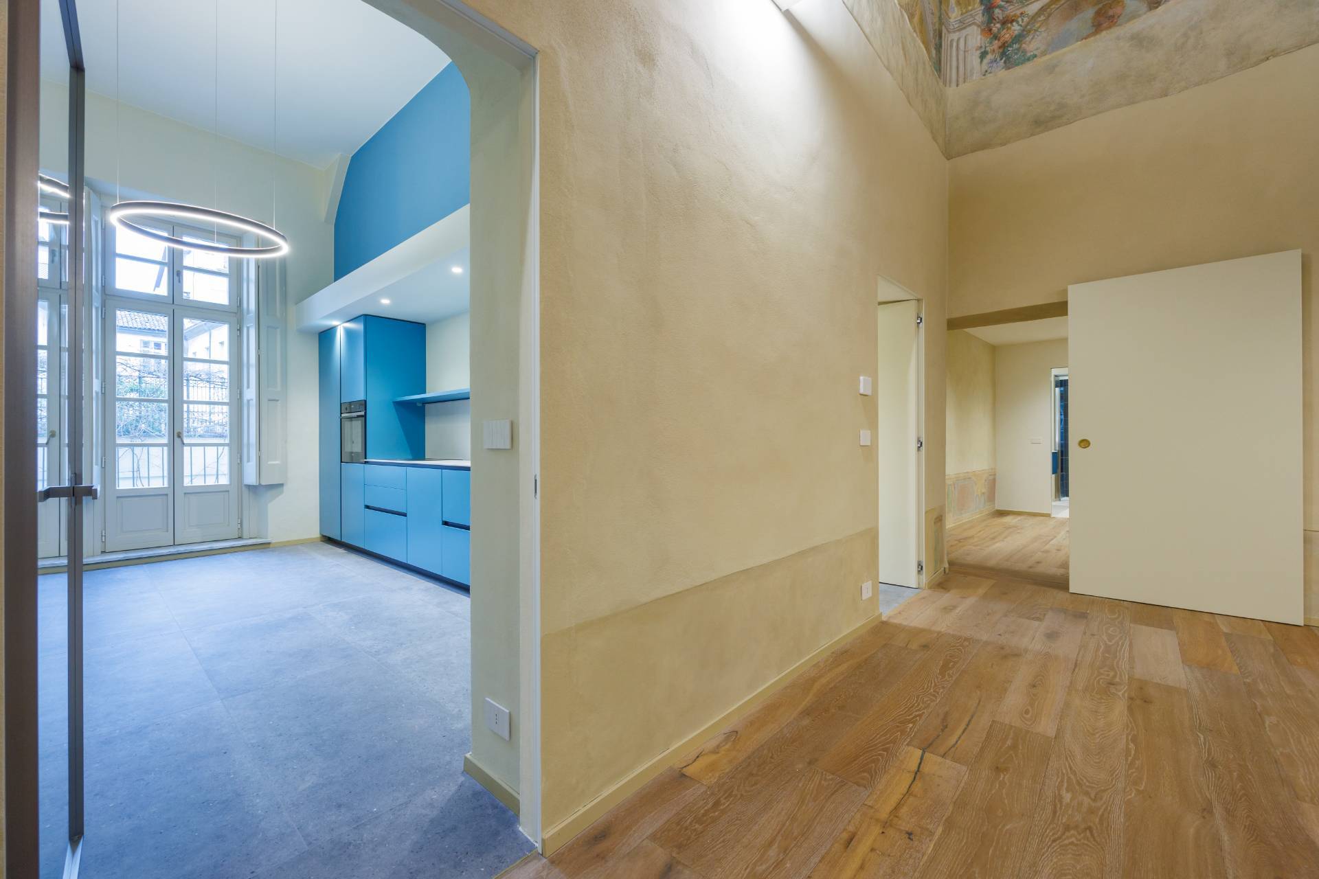 Nello splendido, seicentesco palazzo Frichignono di Castellengo, sito all'incrocio di Via San Dalmazzo e Via Barbaroux, grande Appartamento al piano nobile, appena ristrutturato. L'Appartamento ha ingresso indipendente da Via San Dalmazzo 5, con un corridoio che porta in una grande stanza nella quale troviamo ascensore privato e ampia scala elicoidale in ferro, che conducono al primo piano. Qui un ampio ingresso porta al magnifico salone, di circa 60 mq, con soffitti molto alti, travi a vista decorate e affreschi originali restaurati. Il salone è collegato con una cucina abitabile e arredata e un bagno con antibagno, entrambi aperti sul cortile interno. Attraverso una grande cabina armadi si arriva alla camera padronale, di circa 35 mq, con bagno privato.