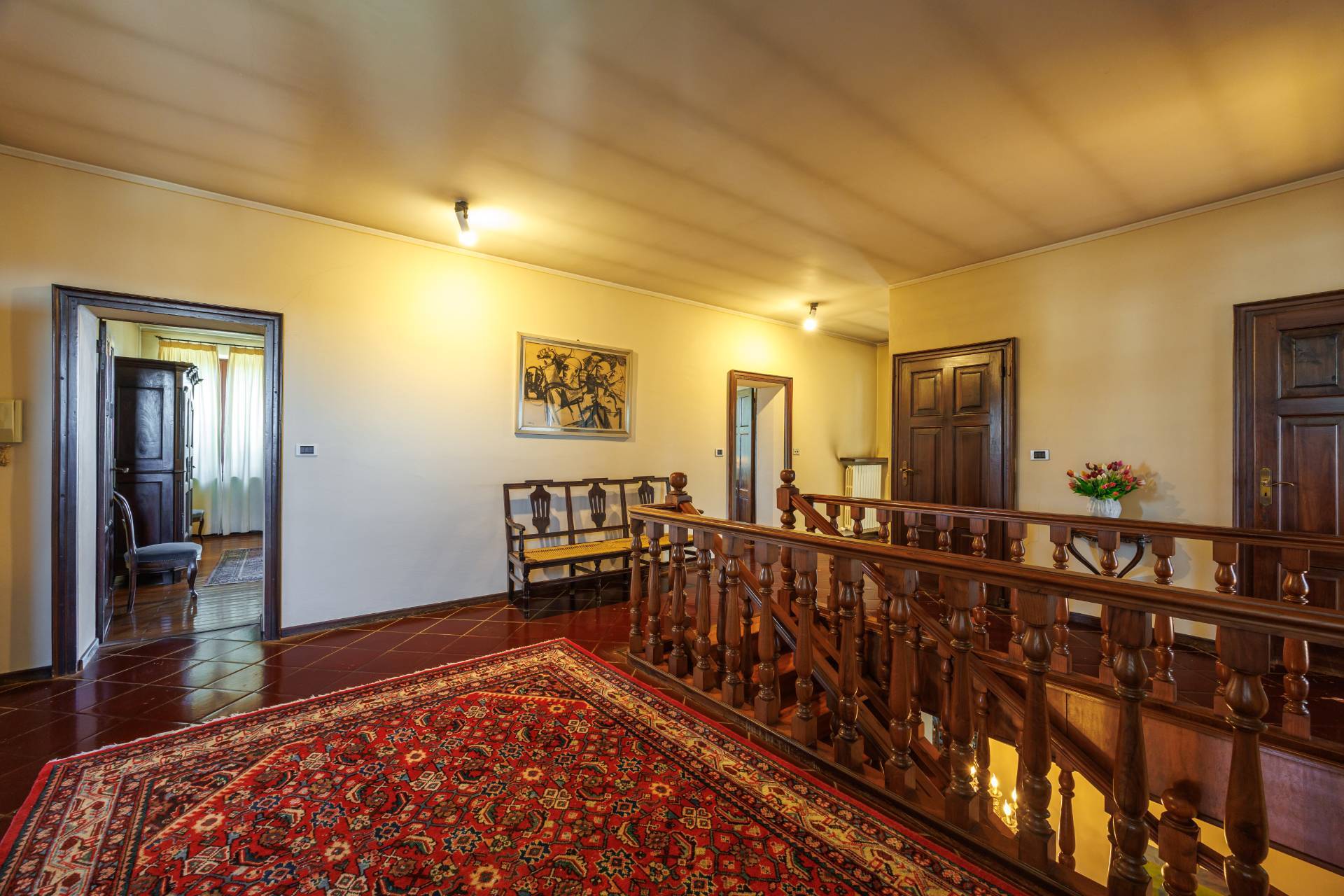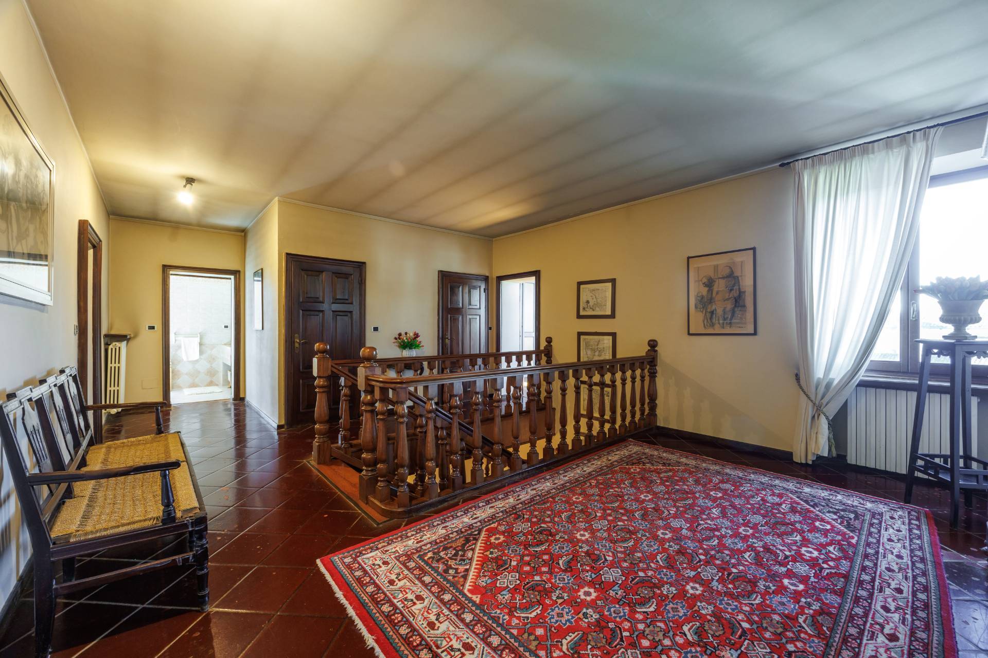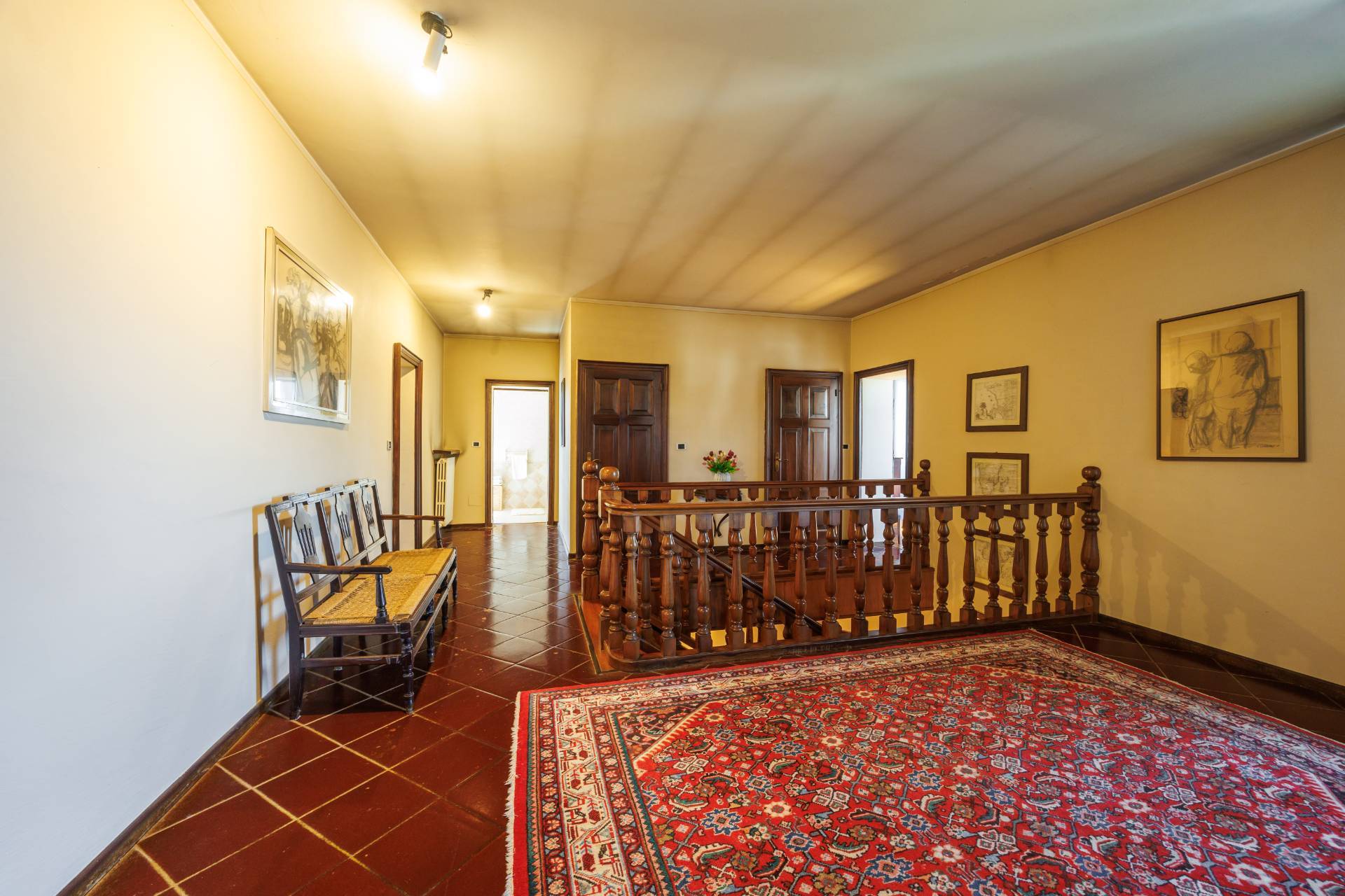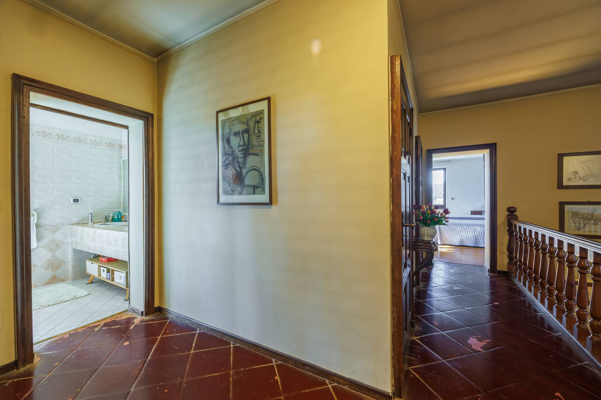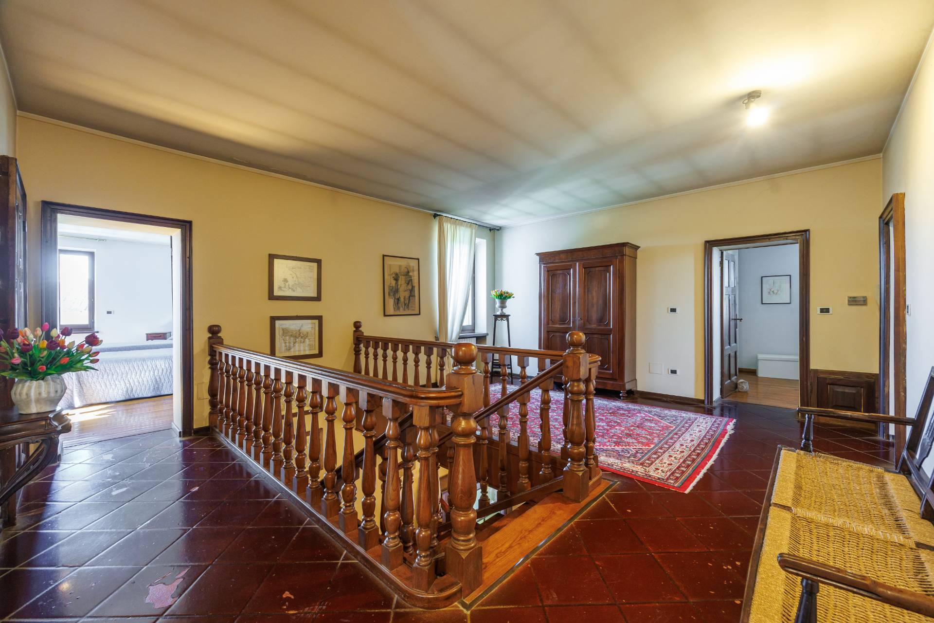Una comoda e ampia scala interna in legno conduce al piano superiore, dove trovano spazio tre camere da letto e un secondo bagno, garantendo ambienti generosi e versatili, adatti anche a studio o stanza hobby.