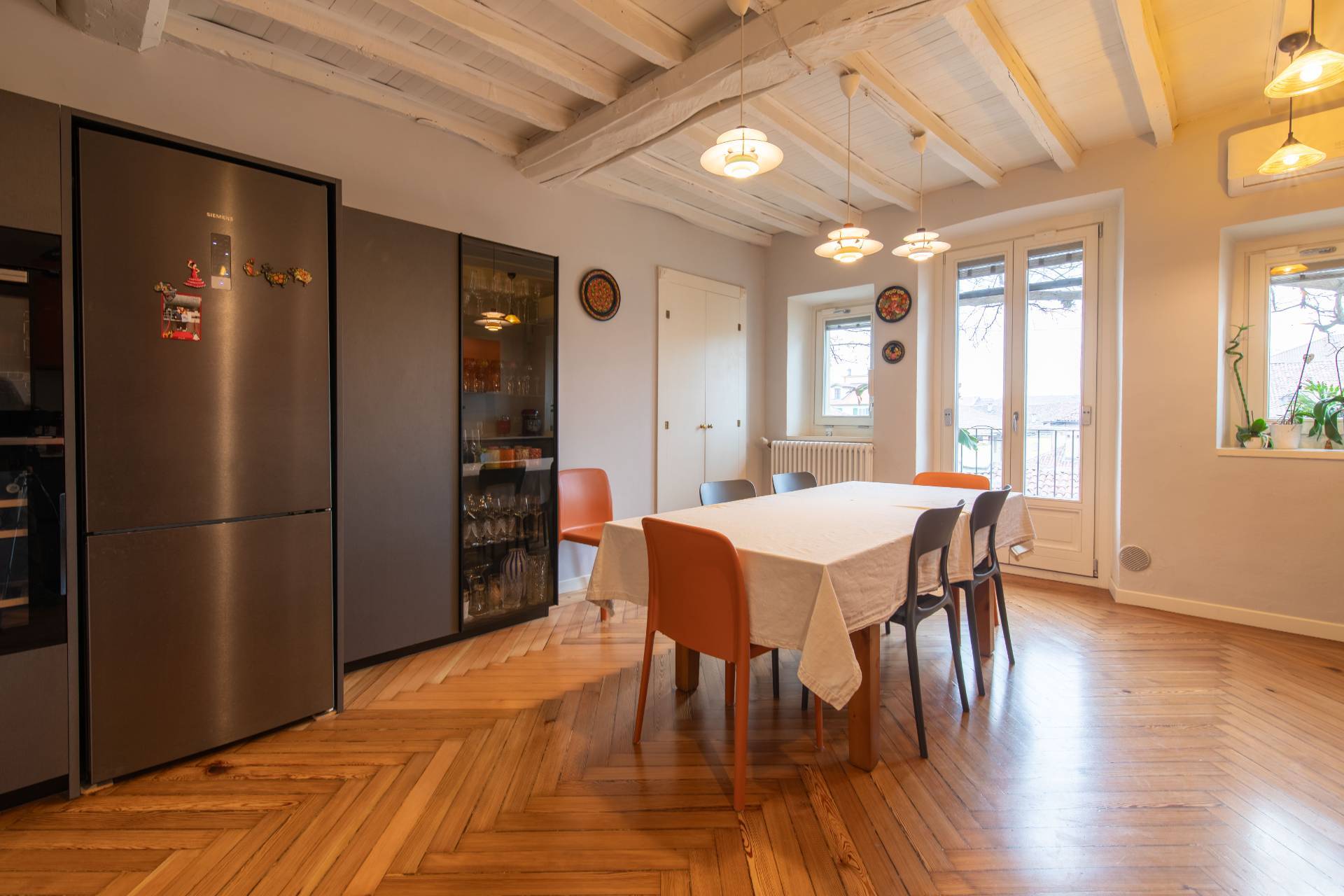 L'alloggio si trova al quarto e penultimo piano e gode di una vista panoramica straordinaria: dai tetti del centro storico alla collina torinese, fino alle Alpi.