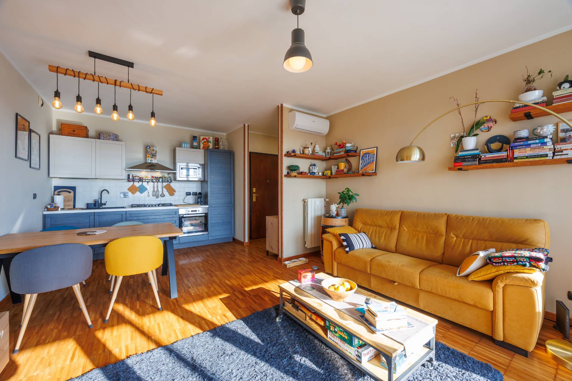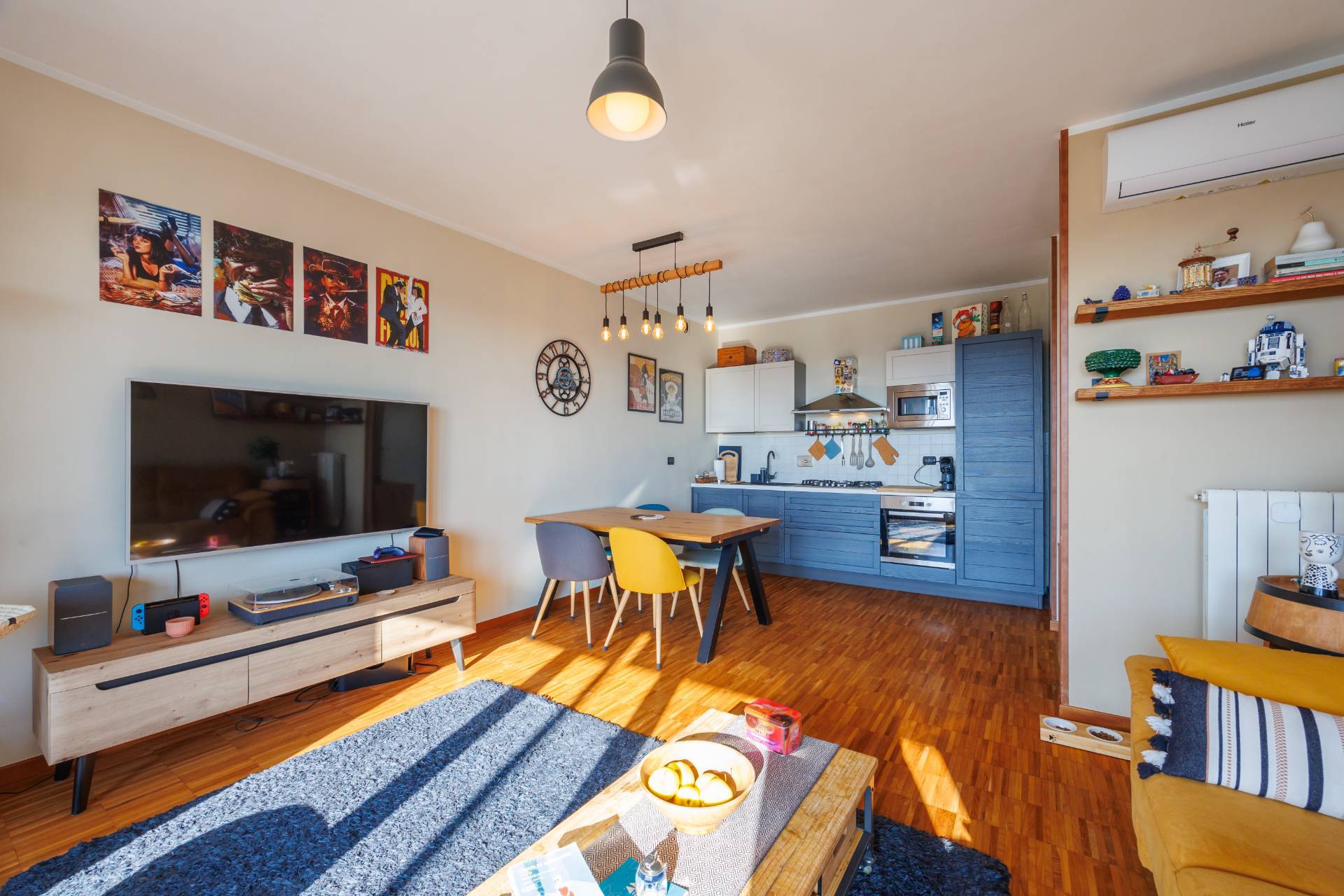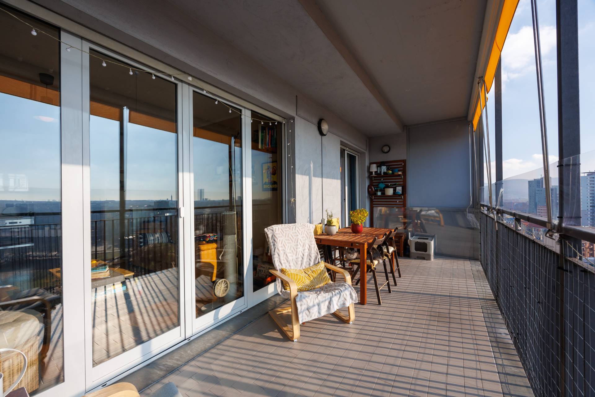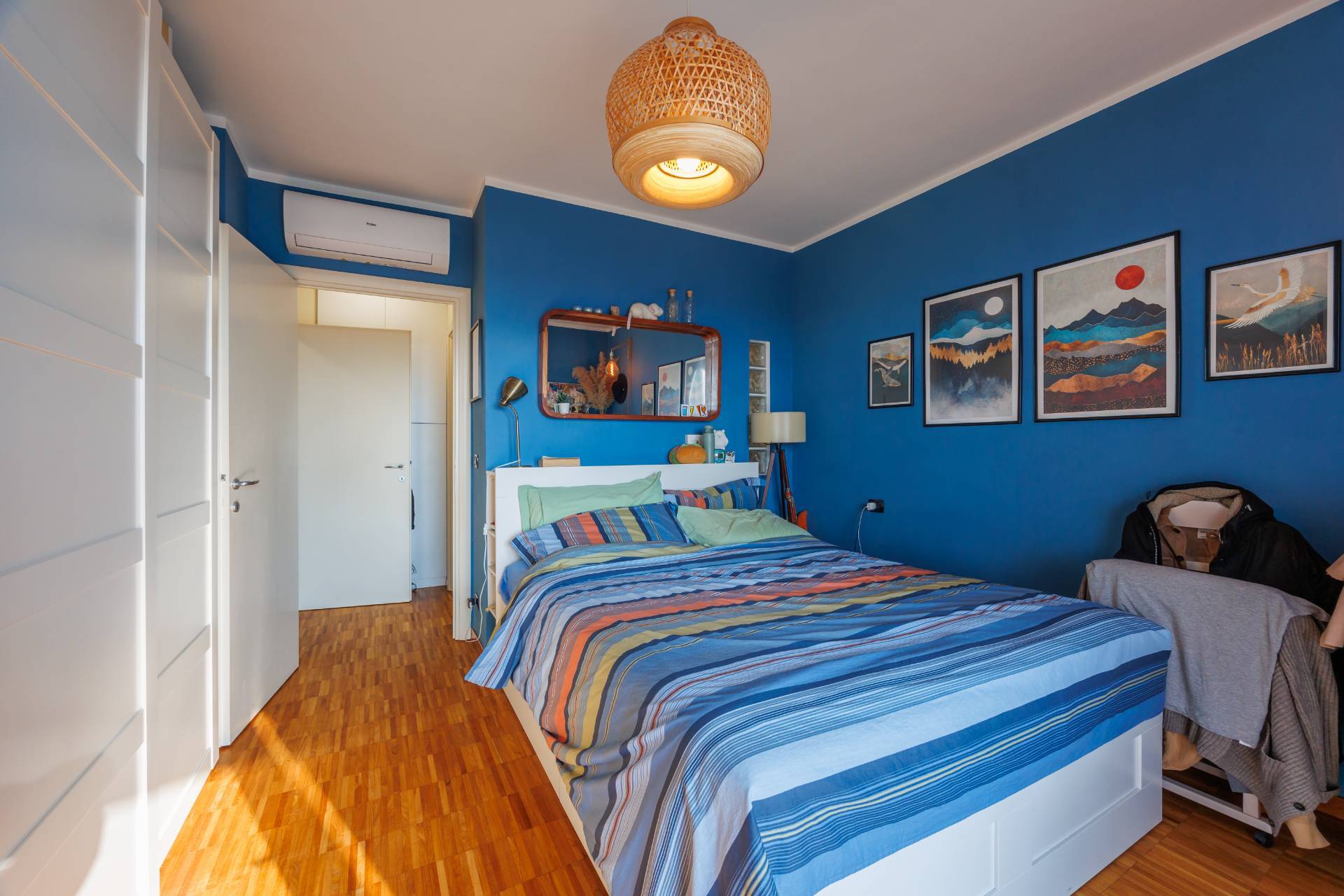Il moderno grattacielo, servito da doppi ascensori e protetto da portineria, è stato edificato nel 2005. L'immobile è composto da ingresso su zona living con cucina a vista e salone, camera da letto, bagno e ampio terrazzo, e viene affittato parzialmente arredato di cucina e divano.