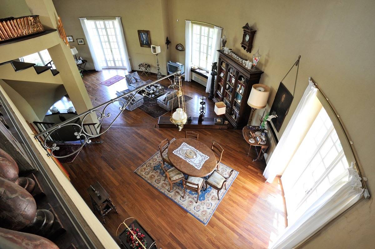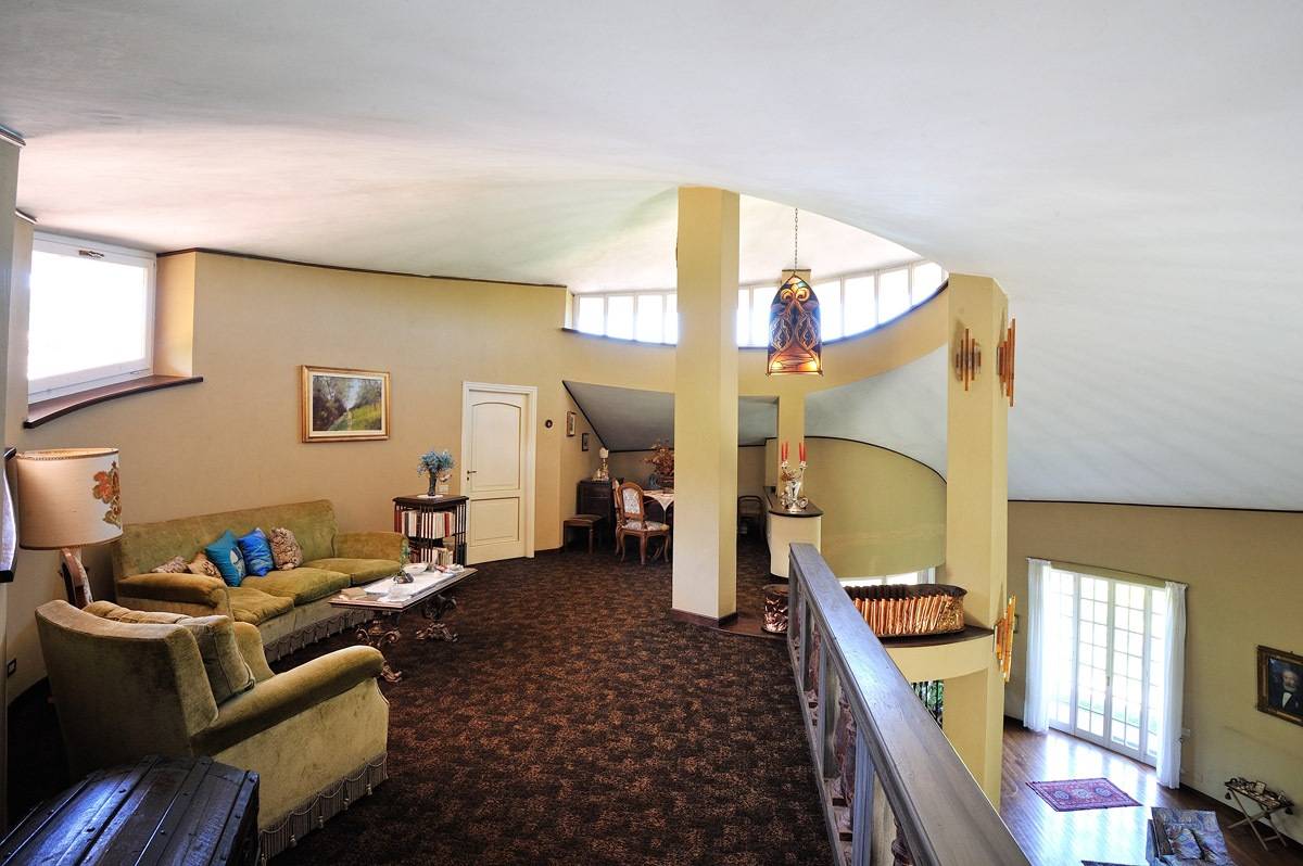 Il piano primo mansardato è valorizzato da una balconata affacciata sul salone sottostante e ospita ulteriori camere da letto oltre a un ampio studio.
