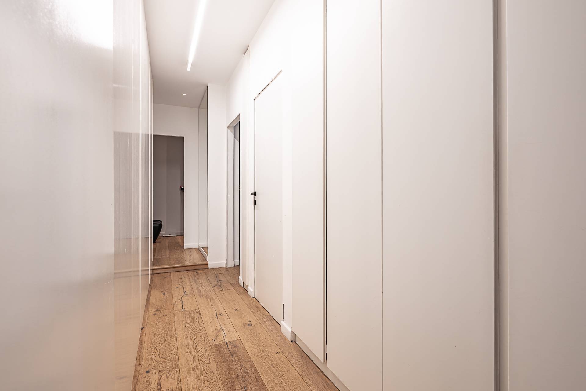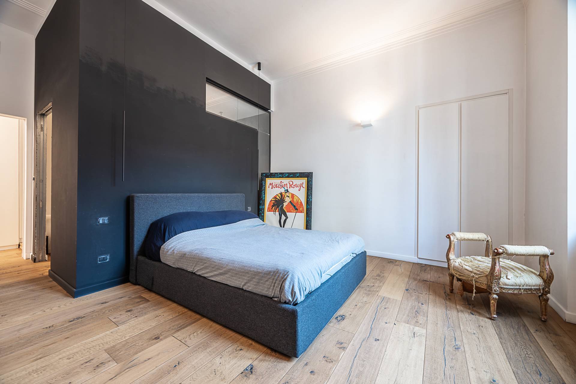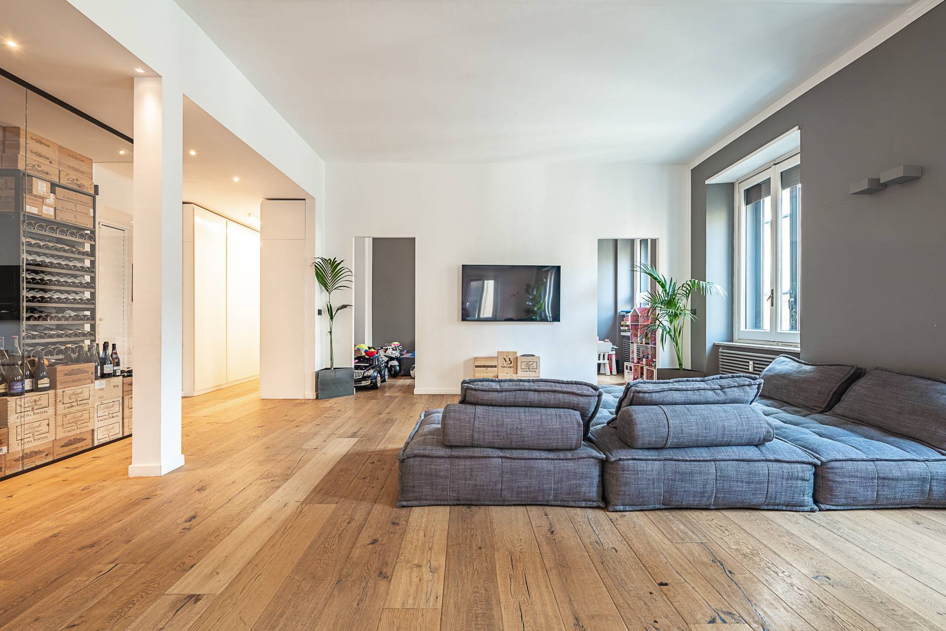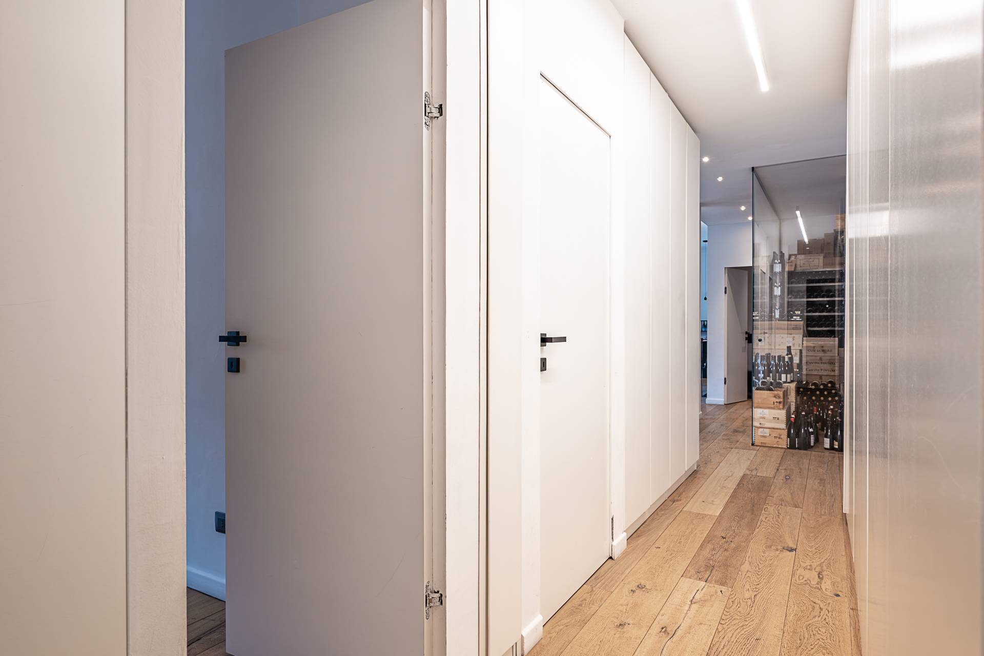 L'Appartamento si contraddistingue per pavimentazione in parquet a listoni su tutta la superficie, soffitti alti con illuminazione a sospensione di design, armadiature su misura lungo i corridoi, ambienti ariosi e ben distribuiti.