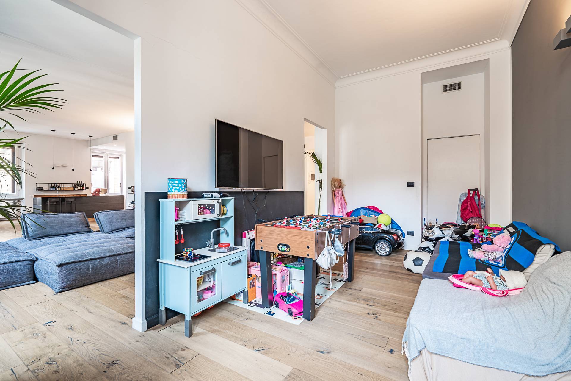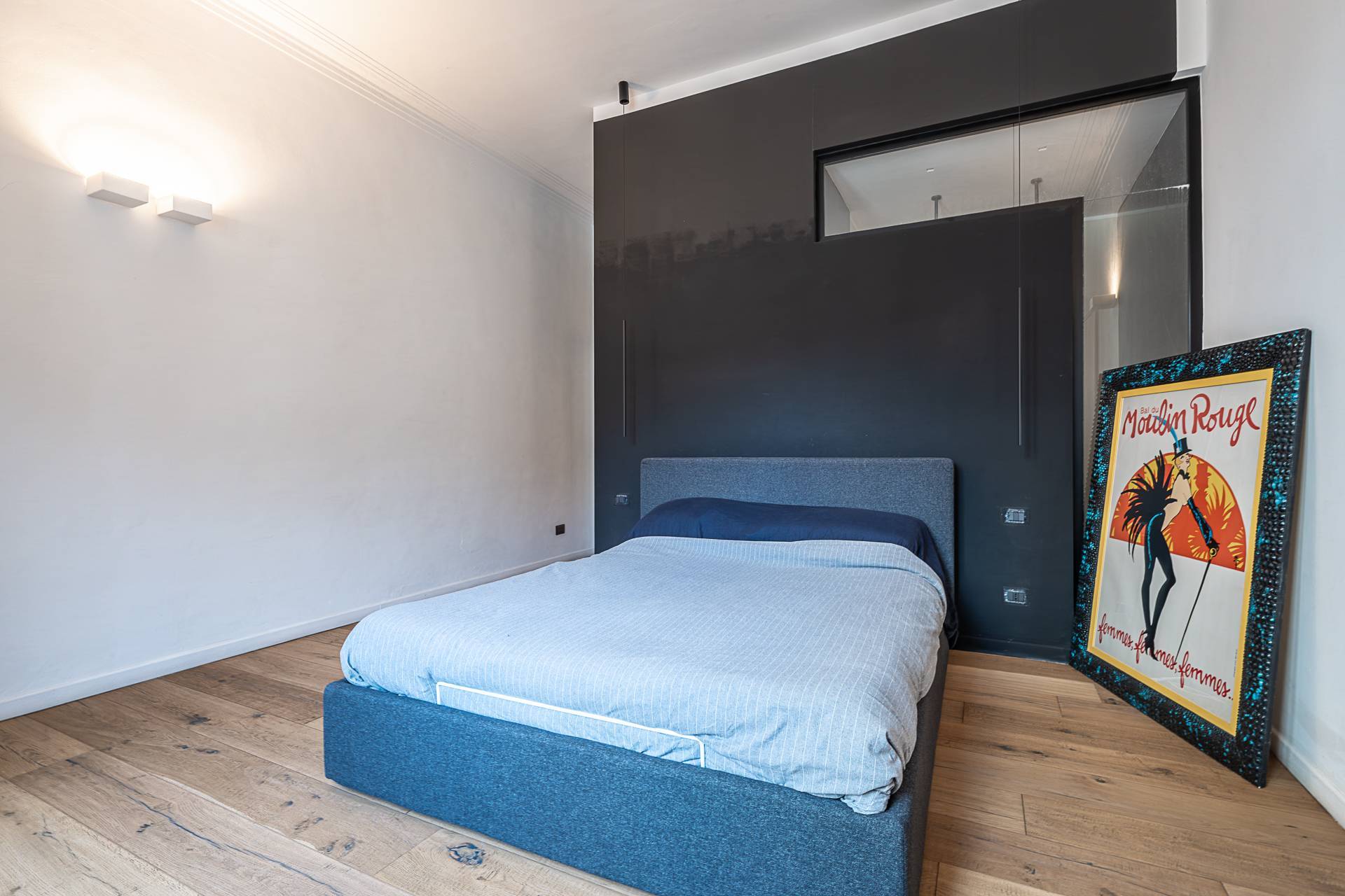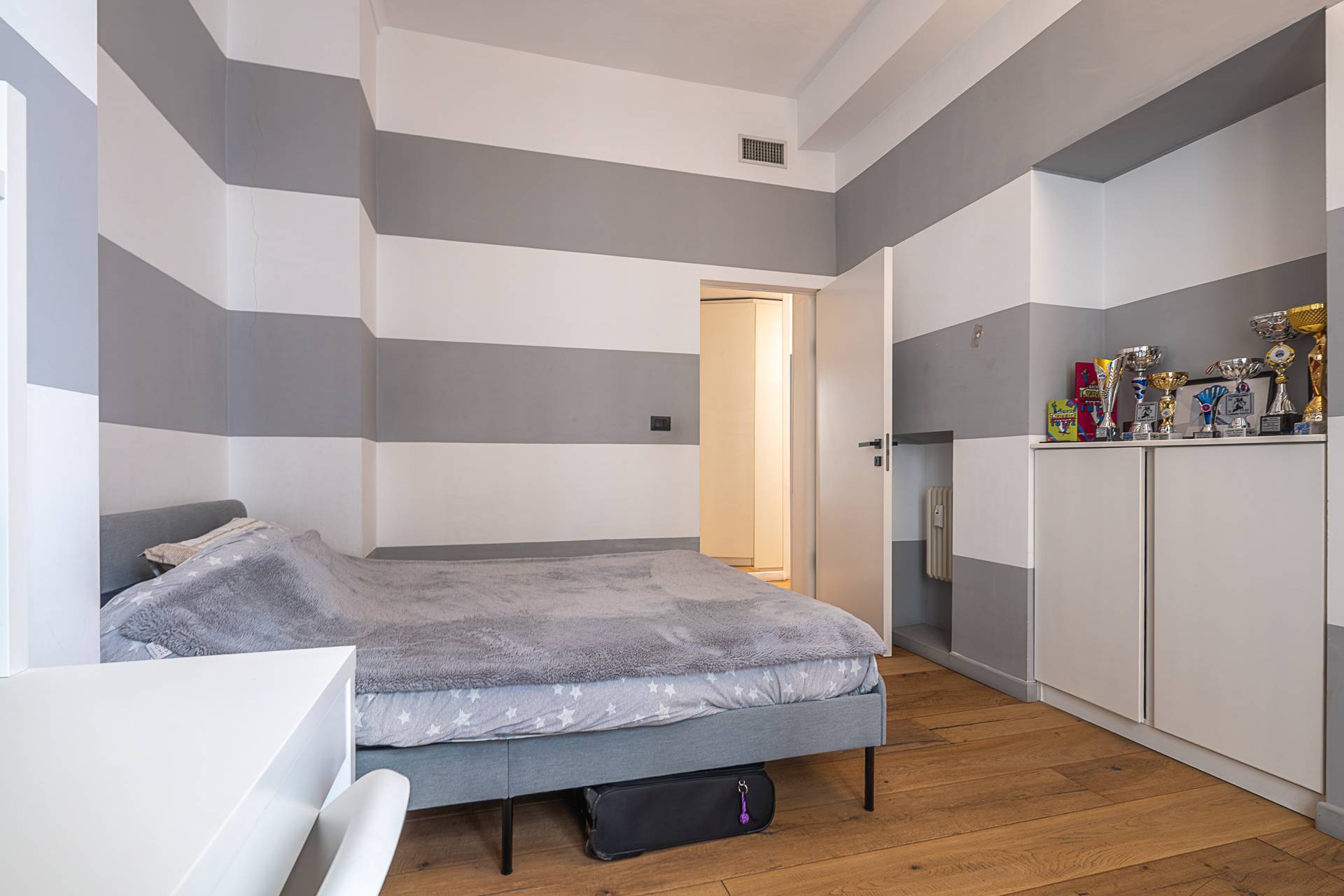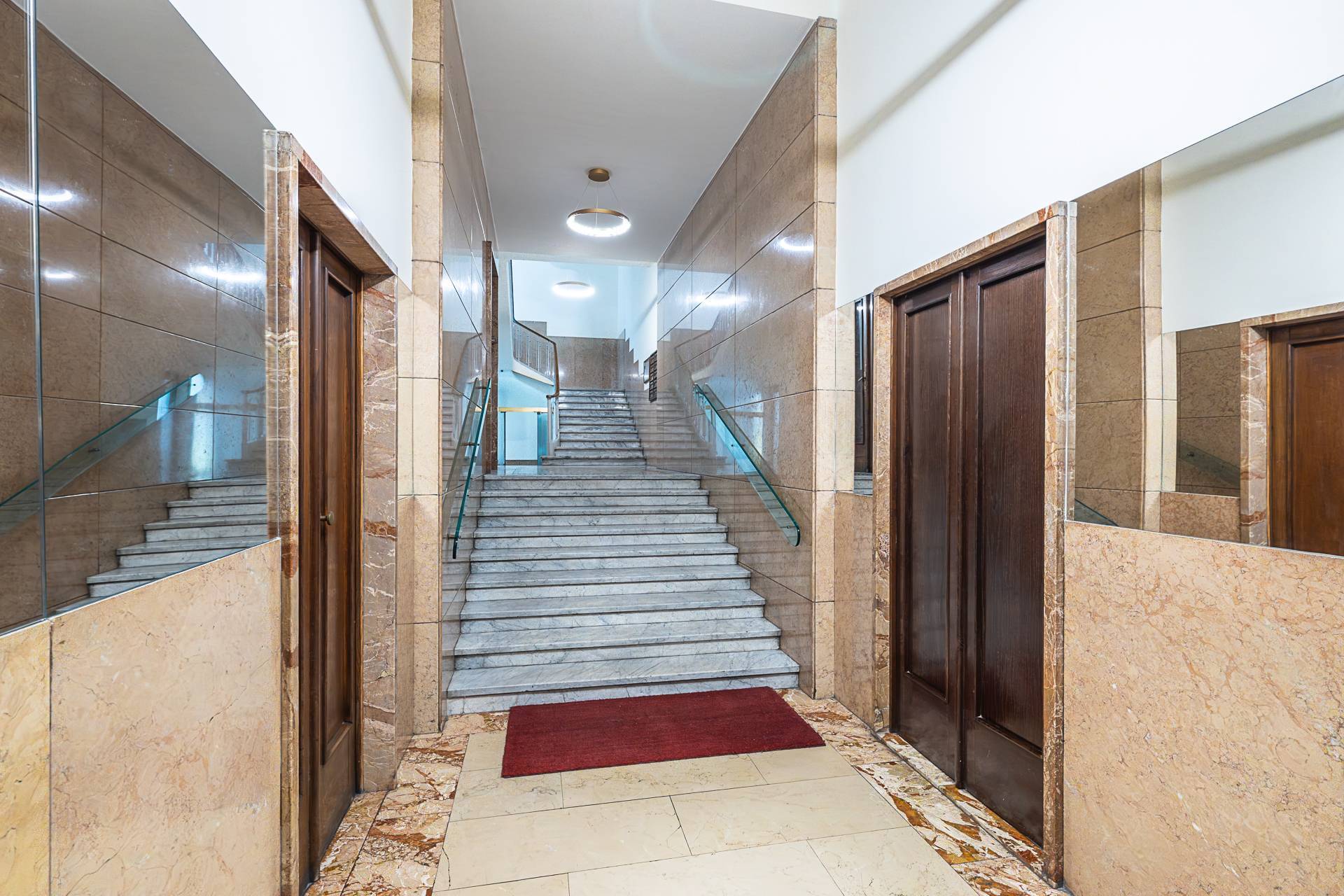 L'Appartamento si contraddistingue per pavimentazione in parquet a listoni su tutta la superficie, soffitti alti con illuminazione a sospensione di design, armadiature su misura lungo i corridoi, ambienti ariosi e ben distribuiti.