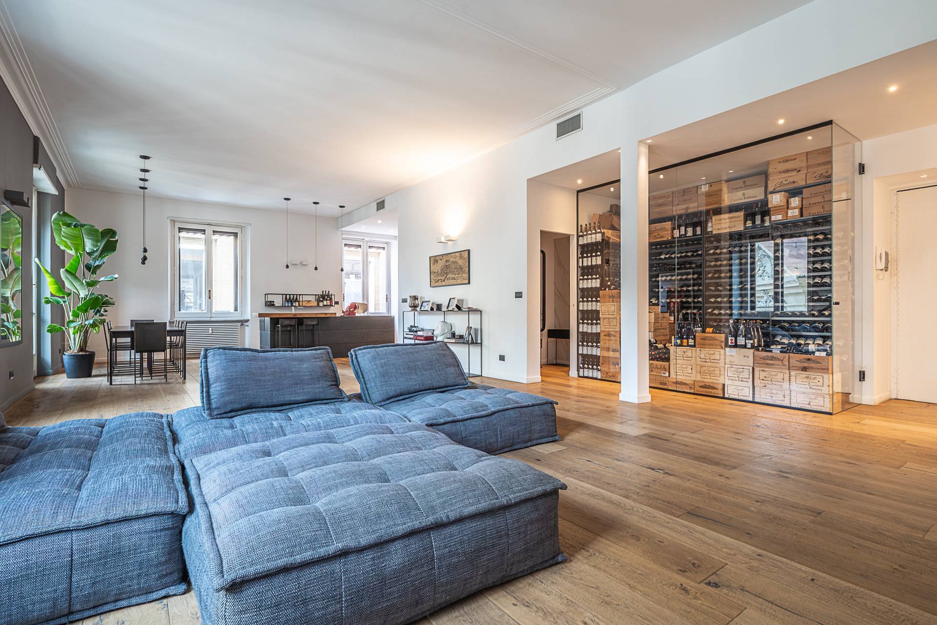 L'ingresso introduce a una spettacolare zona giorno open space, un ambiente di grande respiro con soggiorno e cucina a vista, dove design e funzionalità si fondono armoniosamente. Il living, impreziosito da ampie finestre che garantiscono eccellente luminosità naturale, ospita una zona relax con divani modulari e parete TV, oltre a un'area pranzo di generose dimensioni. La cucina, moderna ed essenziale, è organizzata con isola centrale e arredi su misura, perfettamente integrati nello spazio. Di grande impatto scenografico la cantina vini a vista, incorniciata da una parete vetrata.